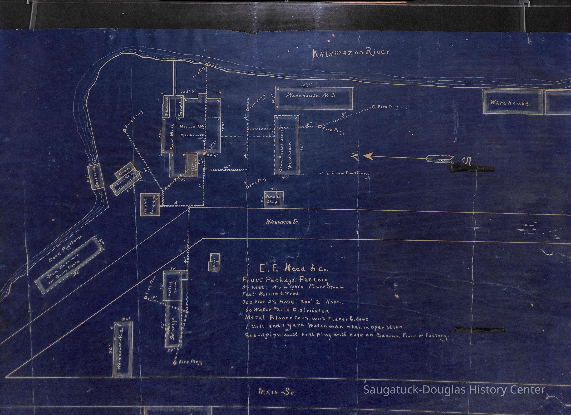 20" x 14.5" fire map blueprint of the grounds and buildings located on the property of the E.E. Weed Fruit Package/Basket Factory in Douglas, Michigan. The Fruit Basket Factory was built in the 1870's, and burned in 1927. The flames could be seen for thirty miles.