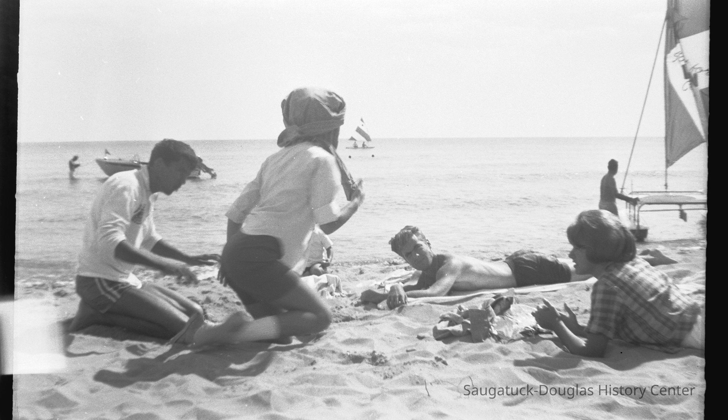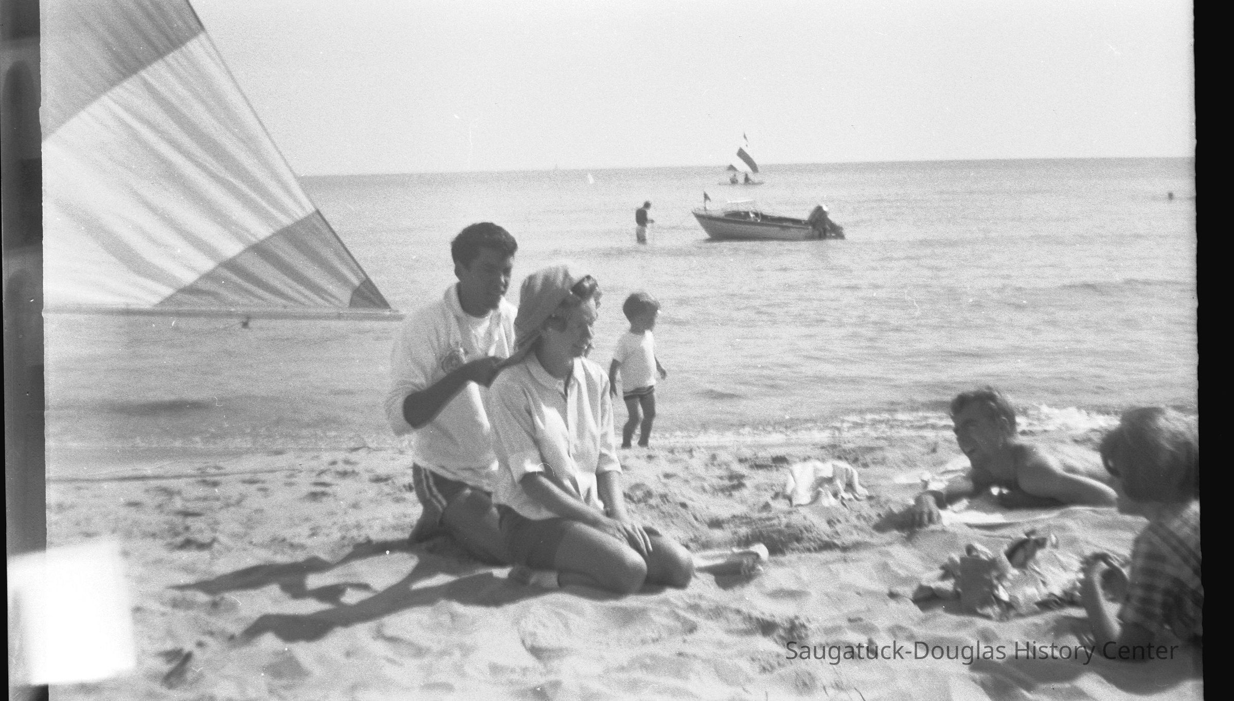 Family photos from George M. Worthington that include shots of boats tied up at the Big Pavilion and Clover's Landing, structures along the shore, a woman on the Mount Baldhead stairs and deck, waterskiing, playing in the water and relaxing on the beach.Photograph Details