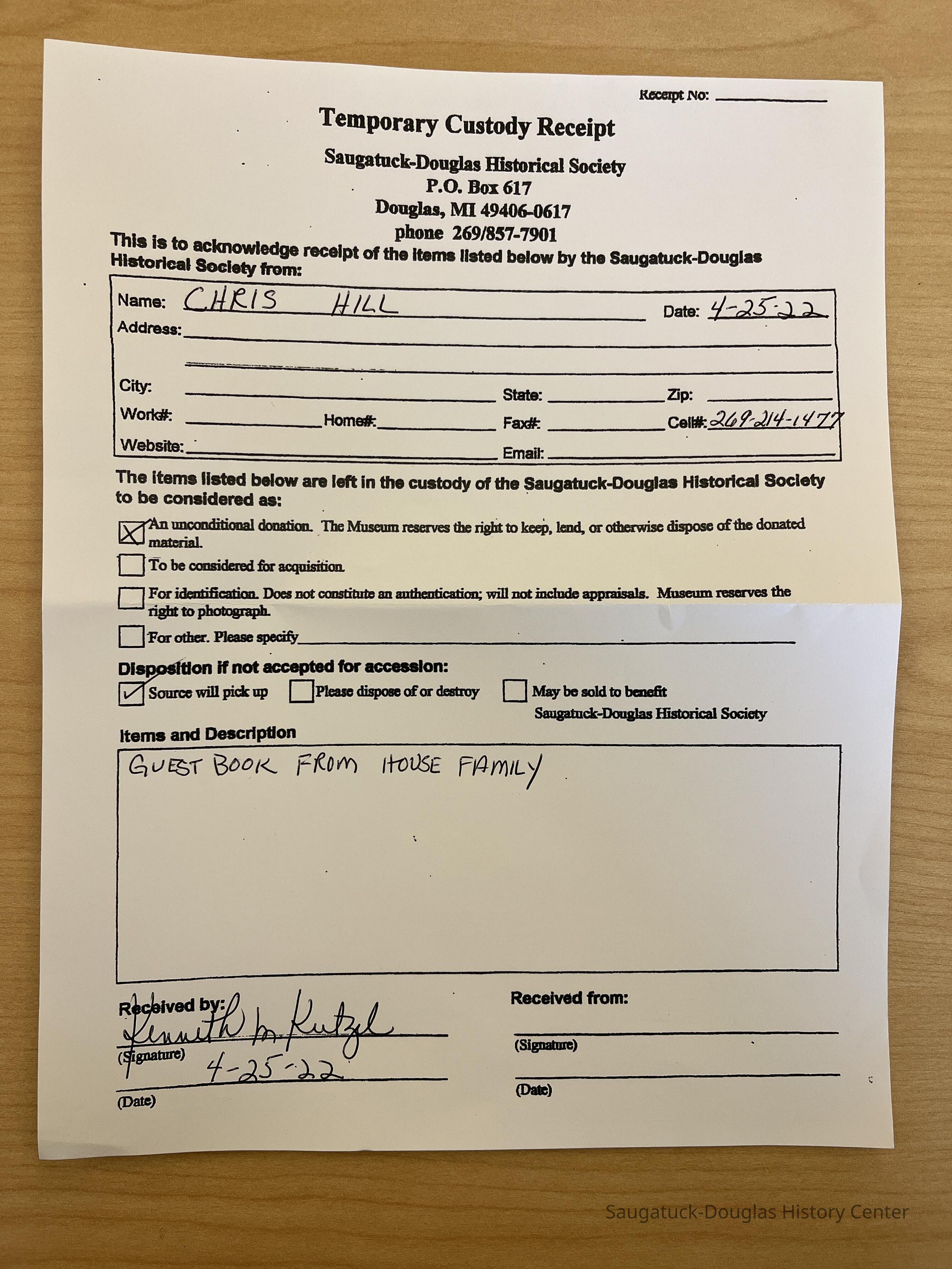 Book was in a piece of furniture sold by the House estate to Chris Hill. Mr. Hill found the book and gave it to Ken Kutzel, who brought the book to the archives on April 25, 2022.Relationships