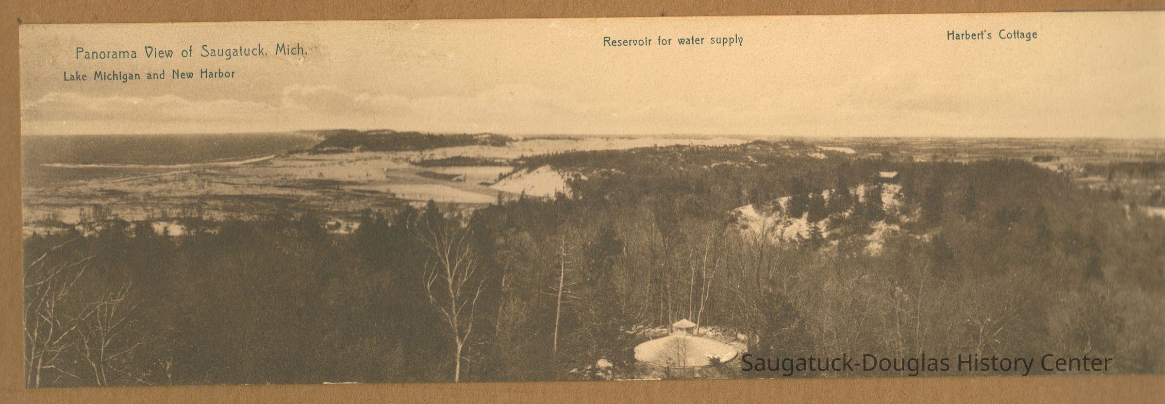 The view includes labels for Lake Michigan and New Harbor [completed 1906], Reservoir for water supply, Harbert's Cottage, Kalamazoo River, Village of Saugatuck and Top of Mt. Baldhead - Douglas in Distance. There is no sign of the Big Pavilion that was built in 1909.Collection