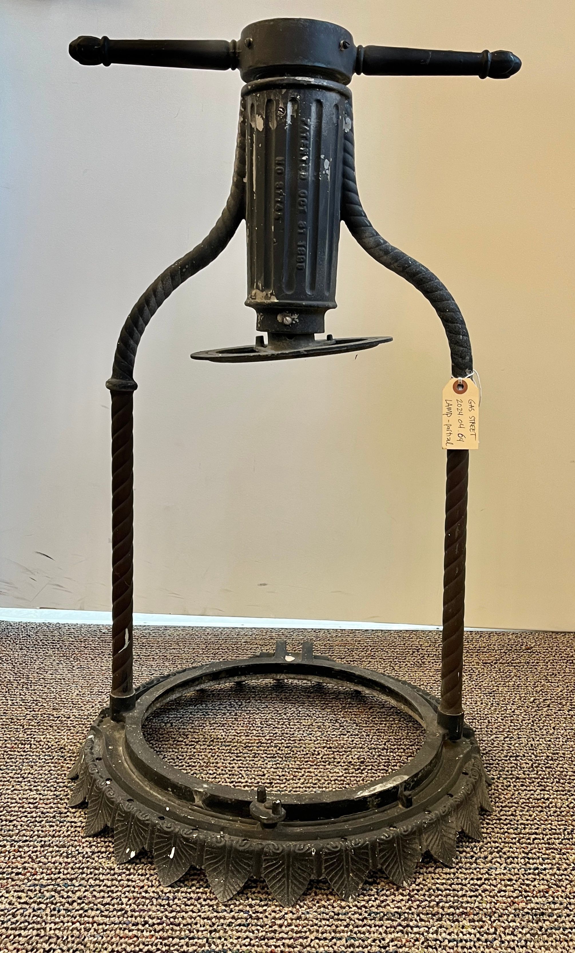 Pole connector/reducing collar ladder rest, harp and upper ring from a gas-powered street lamp. The parts are cast metal painted with decorative roping, fluting or leaf designs. Painted black.Context