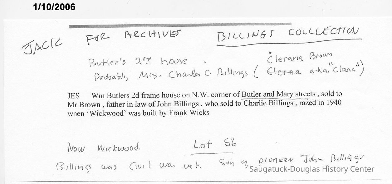 Billings, Clerana G. "Clara" (Brown) 1841-1932, 510 Butler/Wickwood Inn/W. Butler 2nd house, Billings, Charles Clark 1843-1924Context