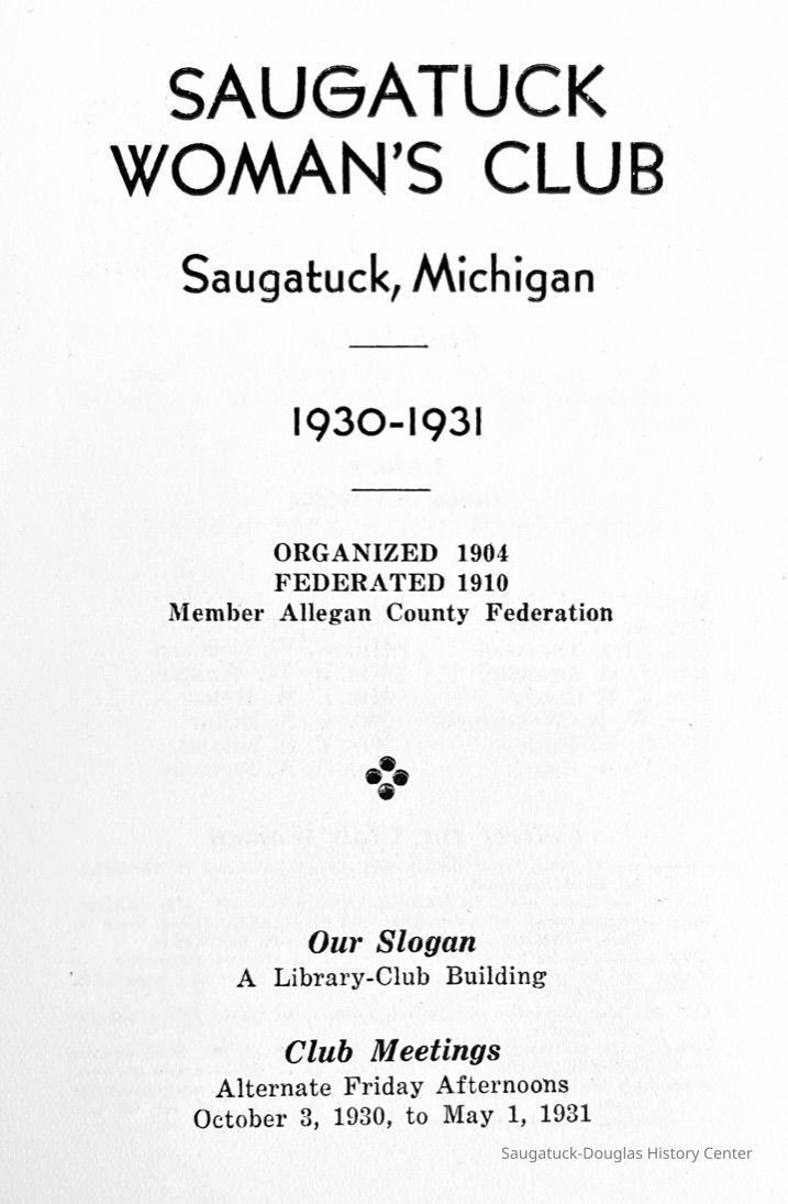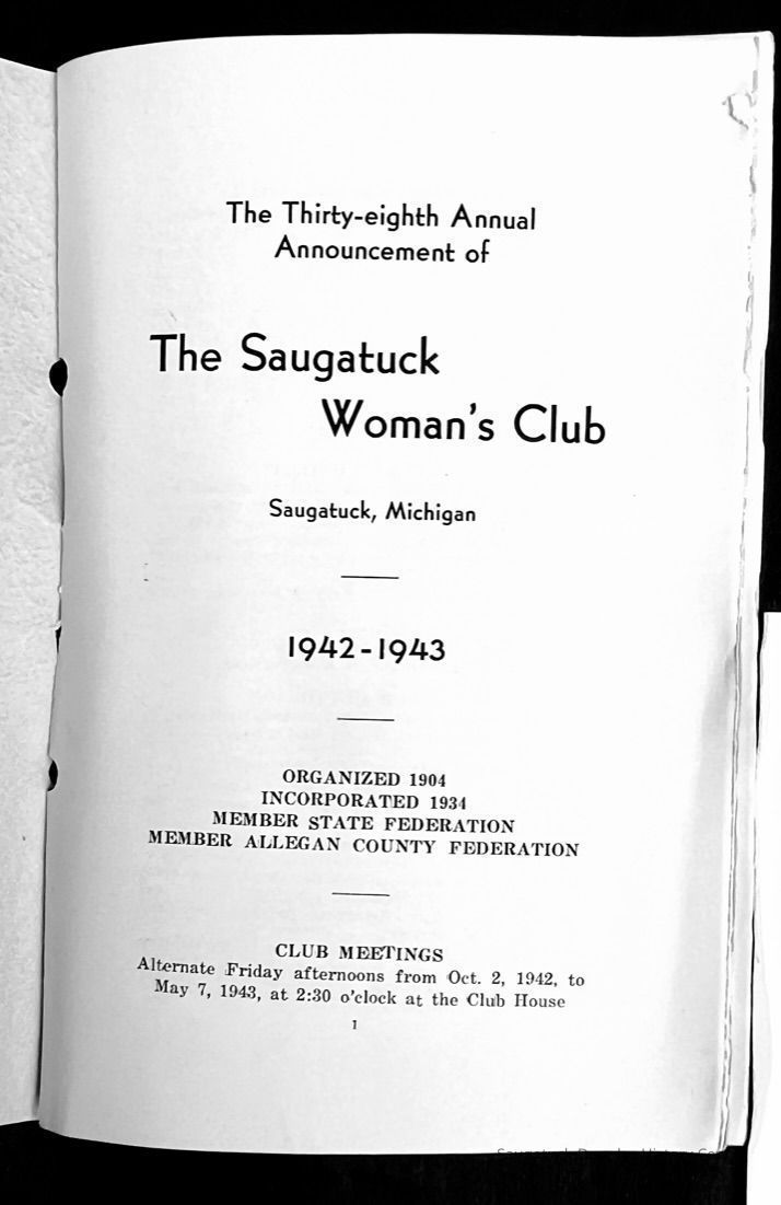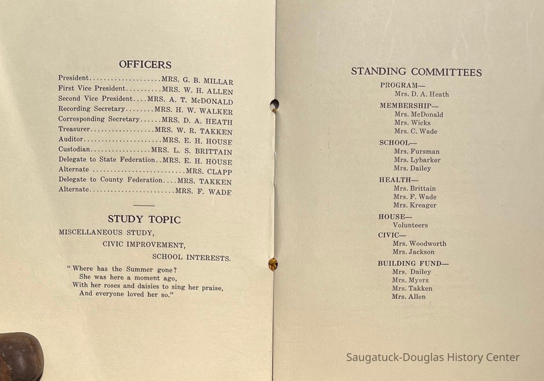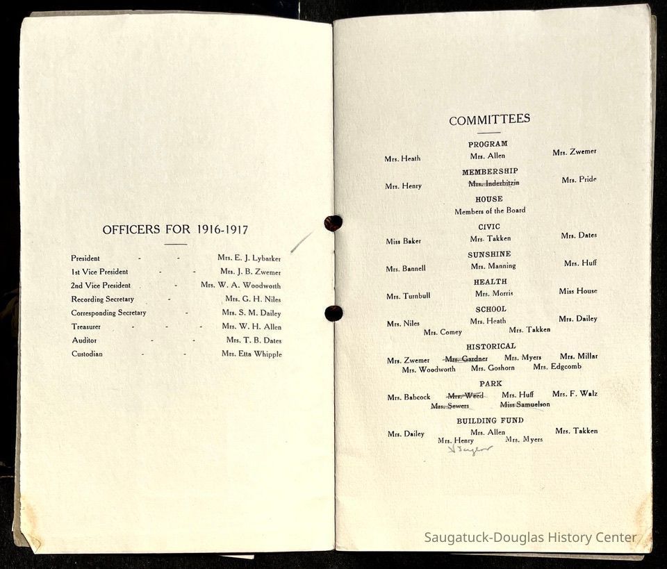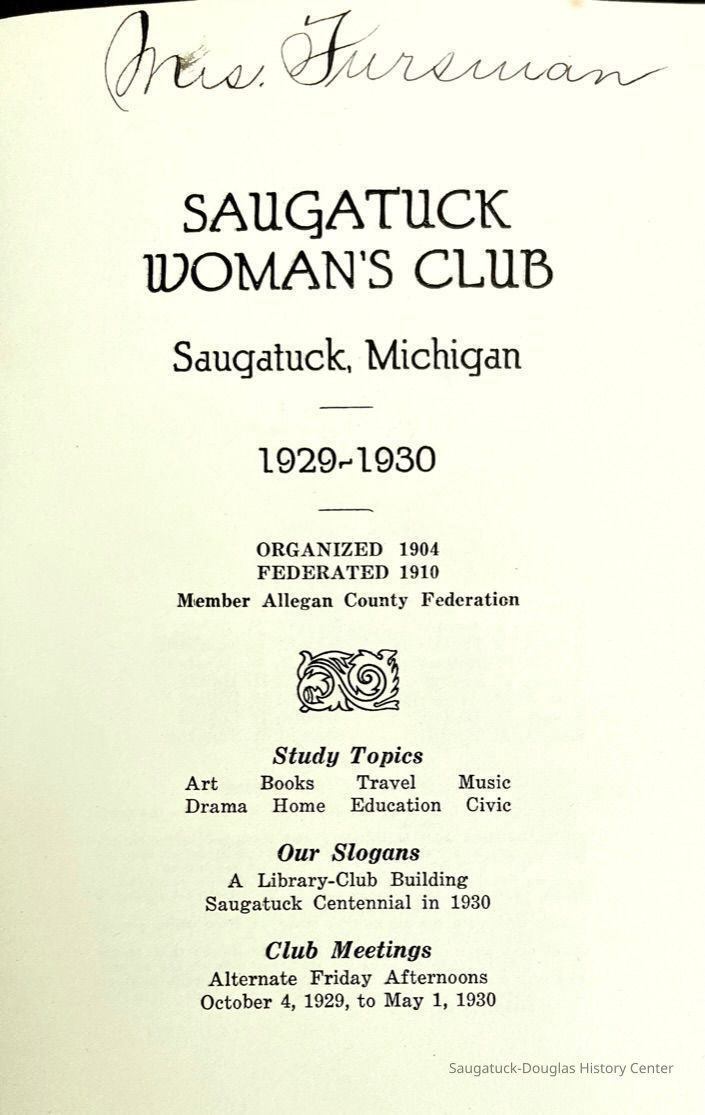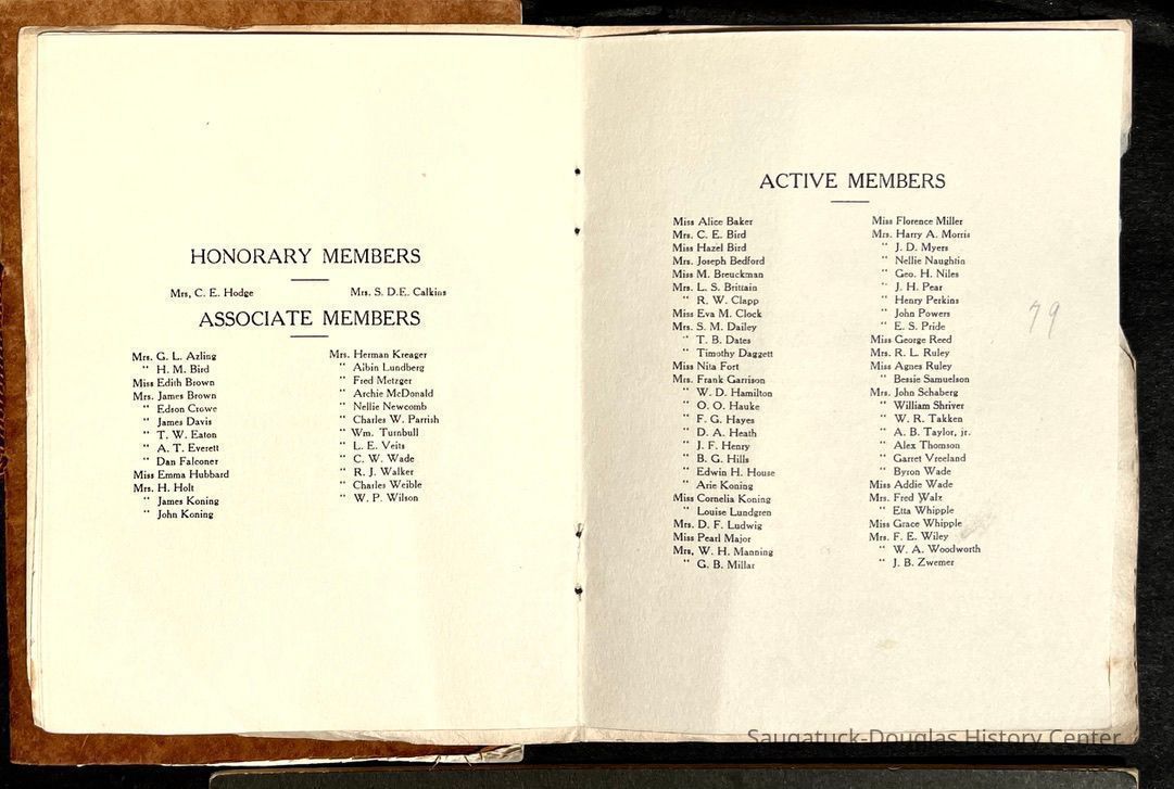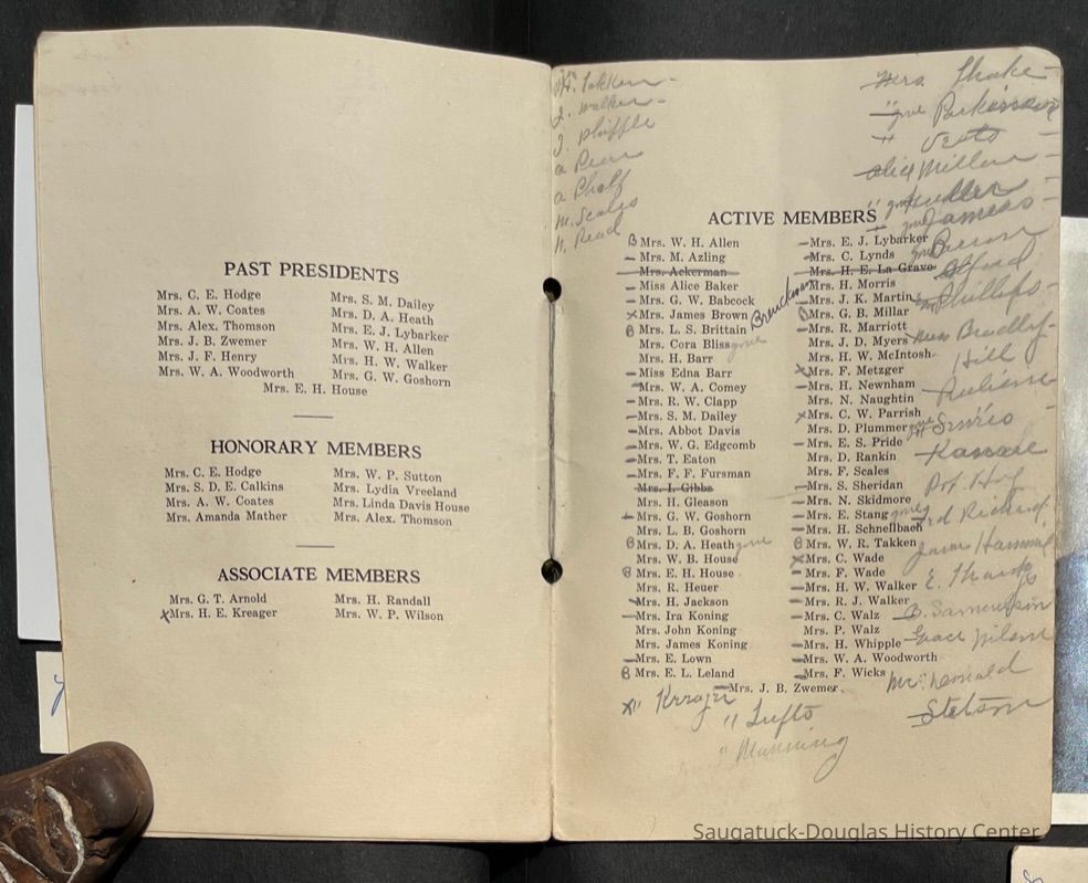 Saugatuck Woman's Club 1904-present, Saugatuck Woman's Club auditorium 1935-present, Heath, May (Francis) 1873-1961, Bird, Harriet “Hattie” Louise (Moffat) (Wright) 1855-1944, Breuckman, Minnie 1869-1934, Coates, Adella "Della" (Holmes) 1864-1950, Thomson, Jeanette Elvira (Harris) 1862-1956, Fox, Johnson 1918-2009, Hodge, Emma Ursula (Gunzenhauser) 1864-1950, Dailey, Margaret, E. (Calkins) 1866-1940, Zwemer, Saburna G. (Woodworth) 1875-1949, Henry, Isabel (Shore) 1856-1936, Woodworth, Alice C. (Redway) Mather 1848-1930, 439 Butler/Butler Pantry/Wilkins/Koning/Nies Hardware, Allen, Flora Elizabeth (Sprang) 1863-1943, Walker, Adelaide Elizabeth (Wade) 1885-1932, Goshorn, Hattie Louise (DePuy) 1874-1953, House, Celia Martin (Gamble) (1890-1976), Millar, Nellie Grant (Raymond) 1861-1956, Jackson, Rhea Bernice (Allen) 1892-1979, Leland, Ruth F. (Baker) 1878-1949, Comey, Alice Maude (Grant) 1870-1944, Davis, Edna Mae (Gaylord) 1896-1980, Wilson, Grace (Cobb) 1897-1992, Sheridan, Irene (Weible) 1883-1967, Waddell, Sadie R. 1882-1947, Wicks, Caroline Jane "Carrie" (Millar) Stillson 1884-1983, Hoffman, Elizabeth S. "Betty" (Gregory) 1894-1960, Brady, Winifred E. (Randall) 1893-1961, Peirce, Roberta "Bobbie" Margaret (Fredrickson) 1914-2004, Carr, Elsie Virginia (Kaufman) 1906-1997, Bieler or Beler, Mrs. Ernest 1904-1954?, Bainbridge, Marguerite (Holladay) 1888-1974, Edgcomb, Ruth M. (Severance) 1915-1997, Taylor, Mrs. Harold