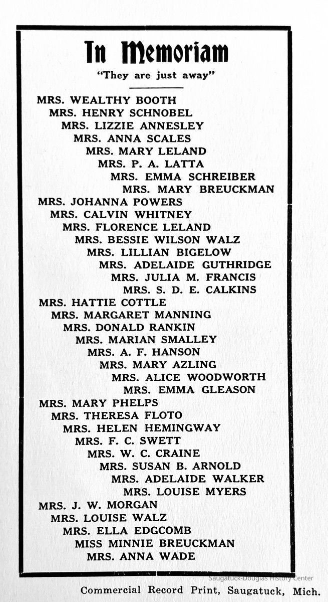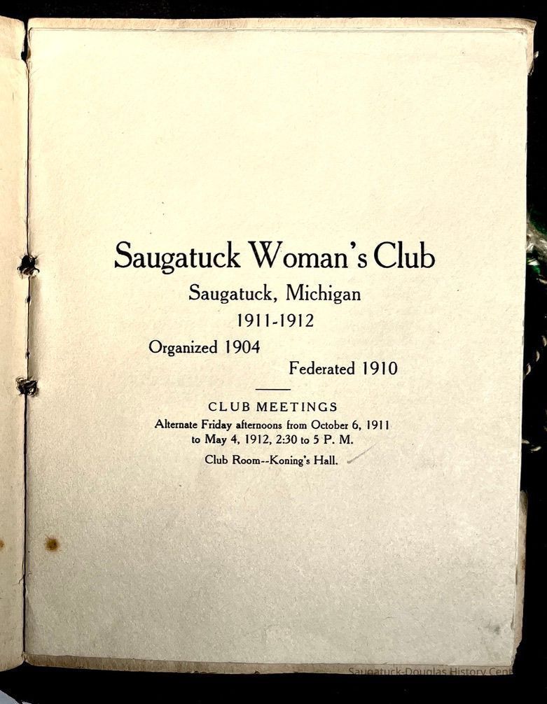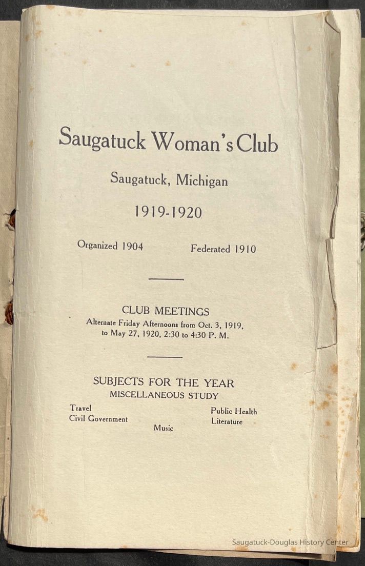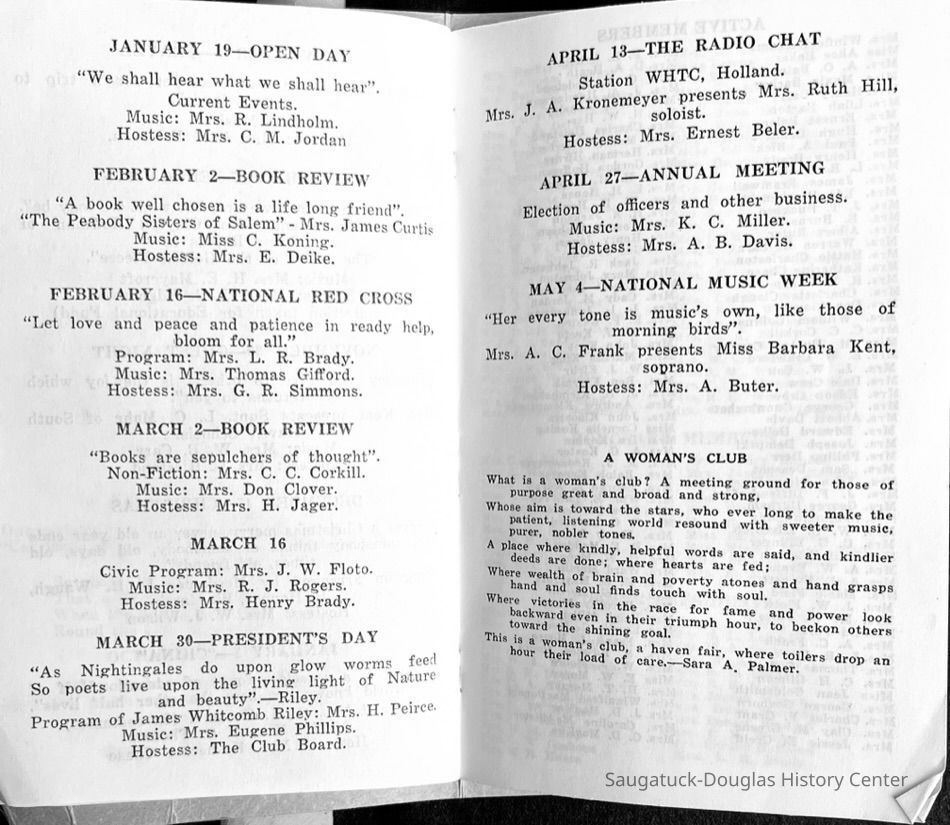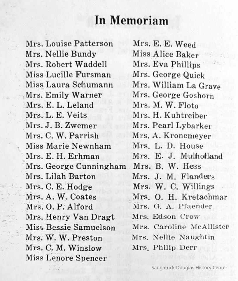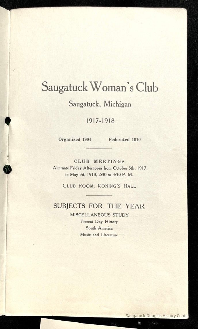 Saugatuck Woman's Club 1904-present, Saugatuck Woman's Club auditorium 1935-present, Heath, May (Francis) 1873-1961, Bird, Harriet “Hattie” Louise (Moffat) (Wright) 1855-1944, Breuckman, Minnie 1869-1934, Coates, Adella "Della" (Holmes) 1864-1950, Thomson, Jeanette Elvira (Harris) 1862-1956, Fox, Johnson 1918-2009, Hodge, Emma Ursula (Gunzenhauser) 1864-1950, Dailey, Margaret, E. (Calkins) 1866-1940, Zwemer, Saburna G. (Woodworth) 1875-1949, Henry, Isabel (Shore) 1856-1936, Woodworth, Alice C. (Redway) Mather 1848-1930, 439 Butler/Butler Pantry/Wilkins/Koning/Nies Hardware, Allen, Flora Elizabeth (Sprang) 1863-1943, Walker, Adelaide Elizabeth (Wade) 1885-1932, Goshorn, Hattie Louise (DePuy) 1874-1953, House, Celia Martin (Gamble) (1890-1976), Millar, Nellie Grant (Raymond) 1861-1956, Jackson, Rhea Bernice (Allen) 1892-1979, Leland, Ruth F. (Baker) 1878-1949, Comey, Alice Maude (Grant) 1870-1944, Davis, Edna Mae (Gaylord) 1896-1980, Wilson, Grace (Cobb) 1897-1992, Sheridan, Irene (Weible) 1883-1967, Waddell, Sadie R. 1882-1947, Wicks, Caroline Jane "Carrie" (Millar) Stillson 1884-1983, Hoffman, Elizabeth S. "Betty" (Gregory) 1894-1960, Brady, Winifred E. (Randall) 1893-1961, Peirce, Roberta "Bobbie" Margaret (Fredrickson) 1914-2004, Carr, Elsie Virginia (Kaufman) 1906-1997, Bieler or Beler, Mrs. Ernest 1904-1954?, Bainbridge, Marguerite (Holladay) 1888-1974, Edgcomb, Ruth M. (Severance) 1915-1997, Taylor, Mrs. Harold