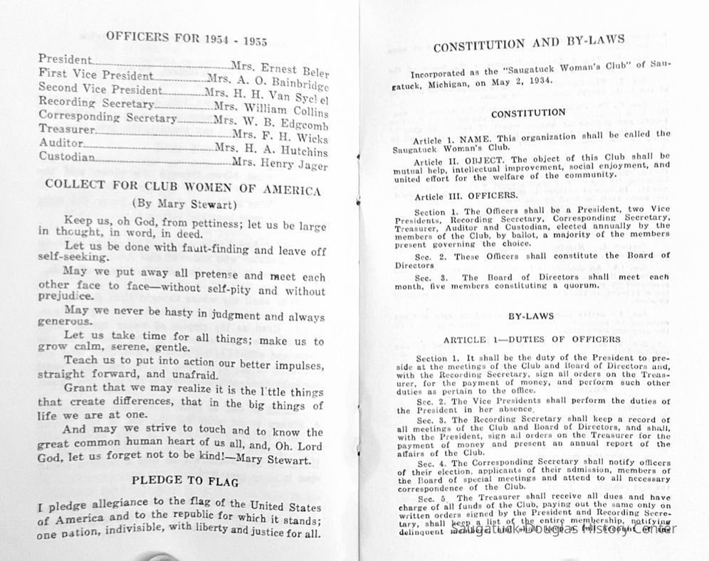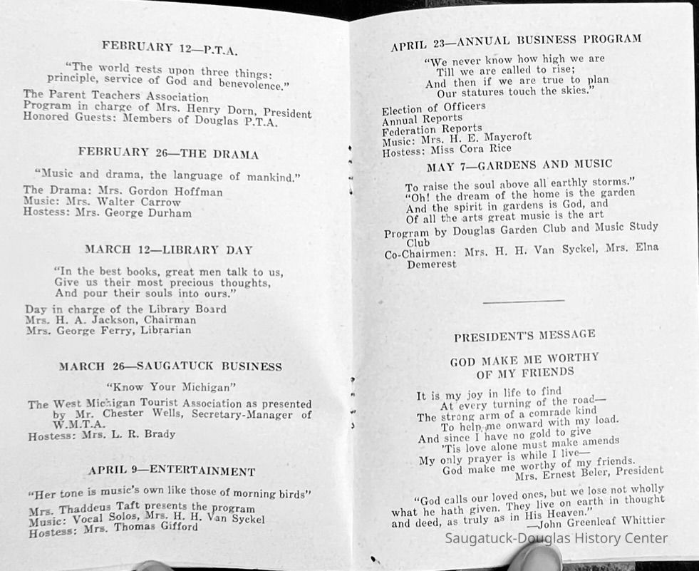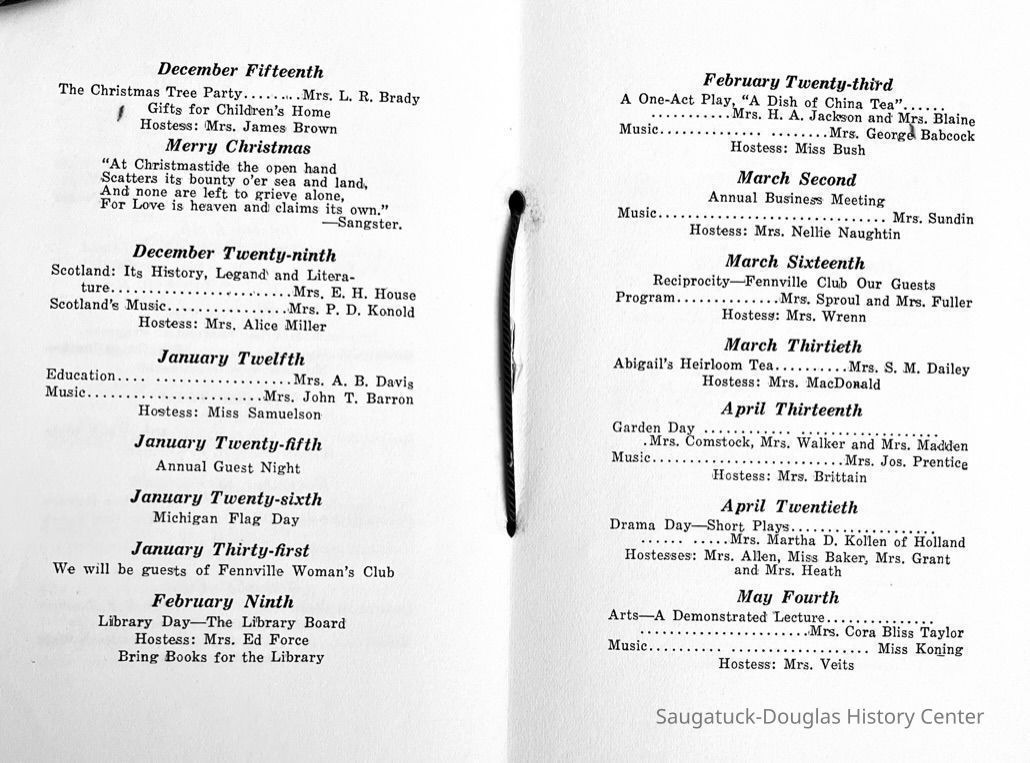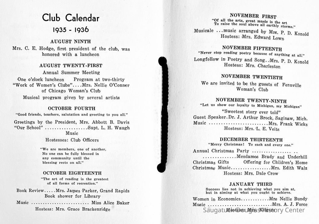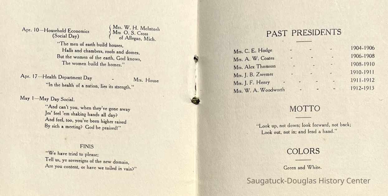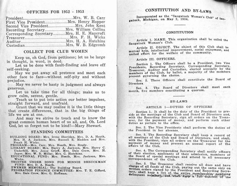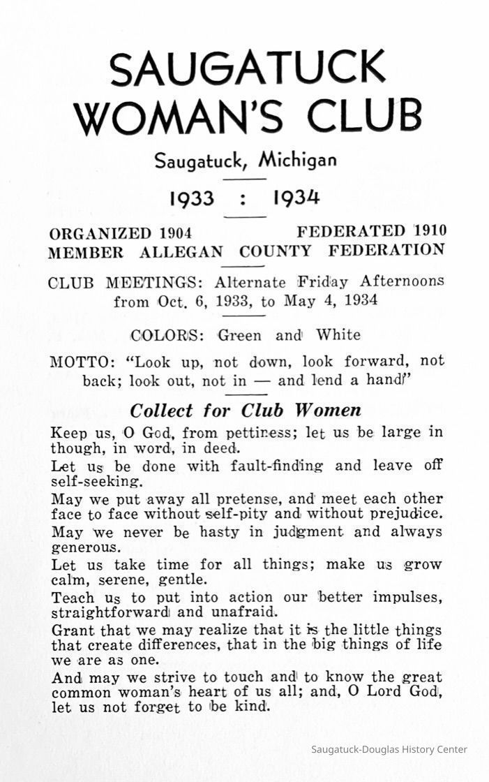 Saugatuck Woman's Club 1904-present, Saugatuck Woman's Club auditorium 1935-present, Heath, May (Francis) 1873-1961, Bird, Harriet “Hattie” Louise (Moffat) (Wright) 1855-1944, Breuckman, Minnie 1869-1934, Coates, Adella "Della" (Holmes) 1864-1950, Thomson, Jeanette Elvira (Harris) 1862-1956, Fox, Johnson 1918-2009, Hodge, Emma Ursula (Gunzenhauser) 1864-1950, Dailey, Margaret, E. (Calkins) 1866-1940, Zwemer, Saburna G. (Woodworth) 1875-1949, Henry, Isabel (Shore) 1856-1936, Woodworth, Alice C. (Redway) Mather 1848-1930, 439 Butler/Butler Pantry/Wilkins/Koning/Nies Hardware, Allen, Flora Elizabeth (Sprang) 1863-1943, Walker, Adelaide Elizabeth (Wade) 1885-1932, Goshorn, Hattie Louise (DePuy) 1874-1953, House, Celia Martin (Gamble) (1890-1976), Millar, Nellie Grant (Raymond) 1861-1956, Jackson, Rhea Bernice (Allen) 1892-1979, Leland, Ruth F. (Baker) 1878-1949, Comey, Alice Maude (Grant) 1870-1944, Davis, Edna Mae (Gaylord) 1896-1980, Wilson, Grace (Cobb) 1897-1992, Sheridan, Irene (Weible) 1883-1967, Waddell, Sadie R. 1882-1947, Wicks, Caroline Jane "Carrie" (Millar) Stillson 1884-1983, Hoffman, Elizabeth S. "Betty" (Gregory) 1894-1960, Brady, Winifred E. (Randall) 1893-1961, Peirce, Roberta "Bobbie" Margaret (Fredrickson) 1914-2004, Carr, Elsie Virginia (Kaufman) 1906-1997, Bieler or Beler, Mrs. Ernest 1904-1954?, Bainbridge, Marguerite (Holladay) 1888-1974, Edgcomb, Ruth M. (Severance) 1915-1997, Taylor, Mrs. Harold