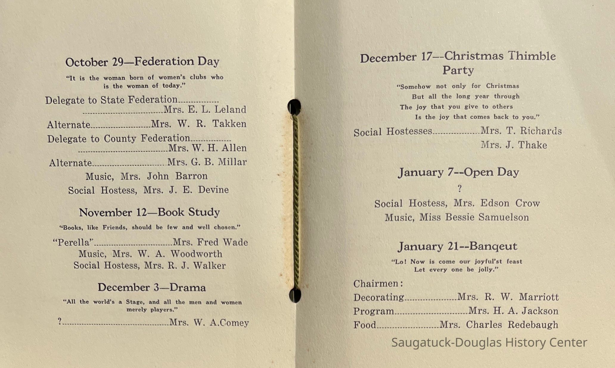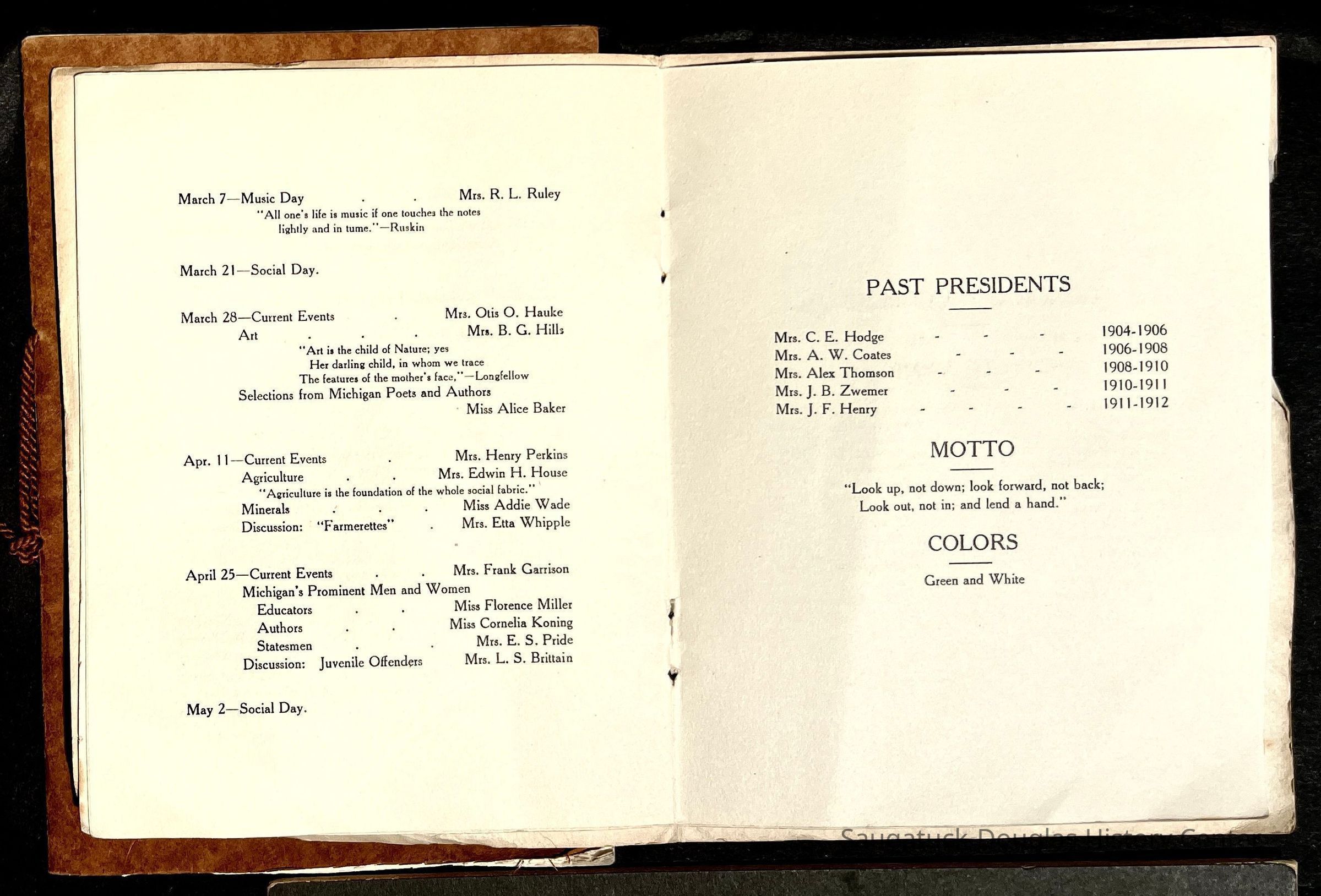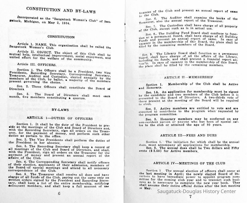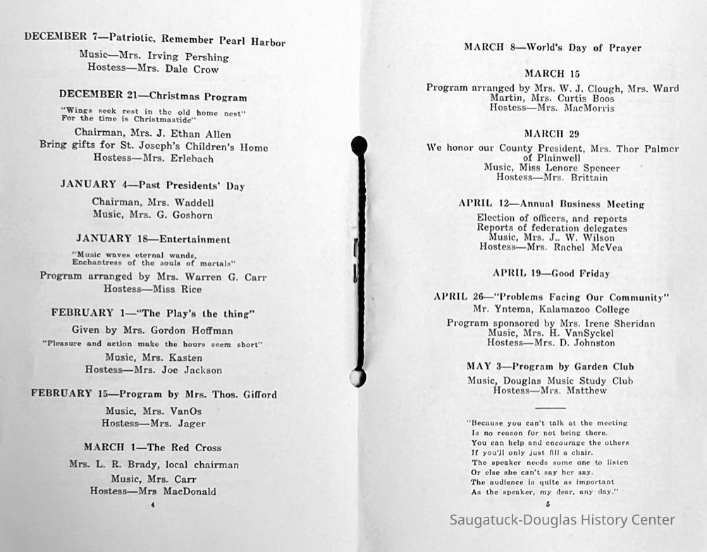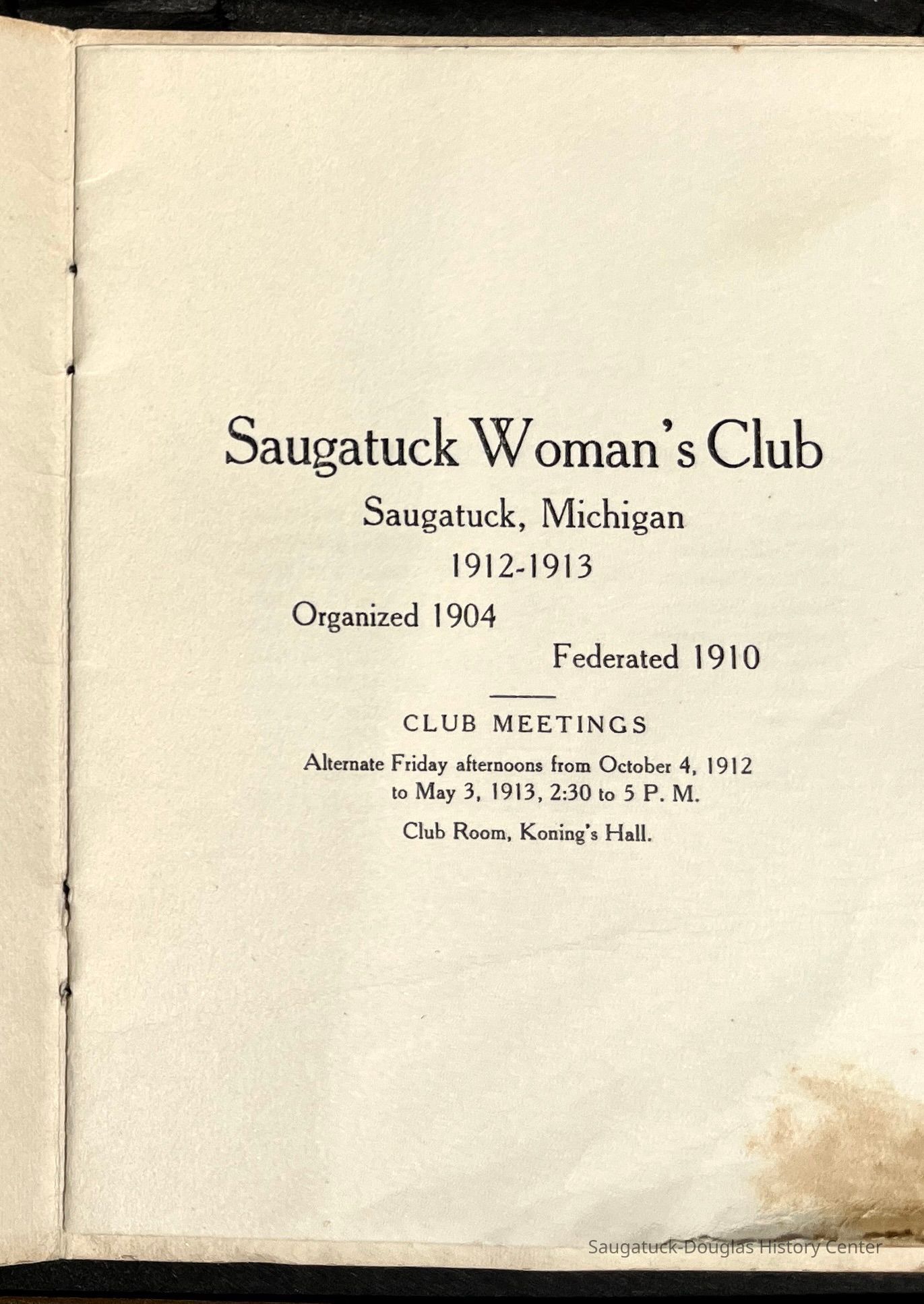 Saugatuck Woman's Club 1904-present, Saugatuck Woman's Club auditorium 1935-present, Heath, May (Francis) 1873-1961, Bird, Harriet “Hattie” Louise (Moffat) (Wright) 1855-1944, Breuckman, Minnie 1869-1934, Coates, Adella "Della" (Holmes) 1864-1950, Thomson, Jeanette Elvira (Harris) 1862-1956, Fox, Johnson 1918-2009, Hodge, Emma Ursula (Gunzenhauser) 1864-1950, Dailey, Margaret, E. (Calkins) 1866-1940, Zwemer, Saburna G. (Woodworth) 1875-1949, Henry, Isabel (Shore) 1856-1936, Woodworth, Alice C. (Redway) Mather 1848-1930, 439 Butler/Butler Pantry/Wilkins/Koning/Nies Hardware, Allen, Flora Elizabeth (Sprang) 1863-1943, Walker, Adelaide Elizabeth (Wade) 1885-1932, Goshorn, Hattie Louise (DePuy) 1874-1953, House, Celia Martin (Gamble) (1890-1976), Millar, Nellie Grant (Raymond) 1861-1956, Jackson, Rhea Bernice (Allen) 1892-1979, Leland, Ruth F. (Baker) 1878-1949, Comey, Alice Maude (Grant) 1870-1944, Davis, Edna Mae (Gaylord) 1896-1980, Wilson, Grace (Cobb) 1897-1992, Sheridan, Irene (Weible) 1883-1967, Waddell, Sadie R. 1882-1947, Wicks, Caroline Jane "Carrie" (Millar) Stillson 1884-1983, Hoffman, Elizabeth S. "Betty" (Gregory) 1894-1960, Brady, Winifred E. (Randall) 1893-1961, Peirce, Roberta "Bobbie" Margaret (Fredrickson) 1914-2004, Carr, Elsie Virginia (Kaufman) 1906-1997, Bieler or Beler, Mrs. Ernest 1904-1954?, Bainbridge, Marguerite (Holladay) 1888-1974, Edgcomb, Ruth M. (Severance) 1915-1997, Taylor, Mrs. Harold