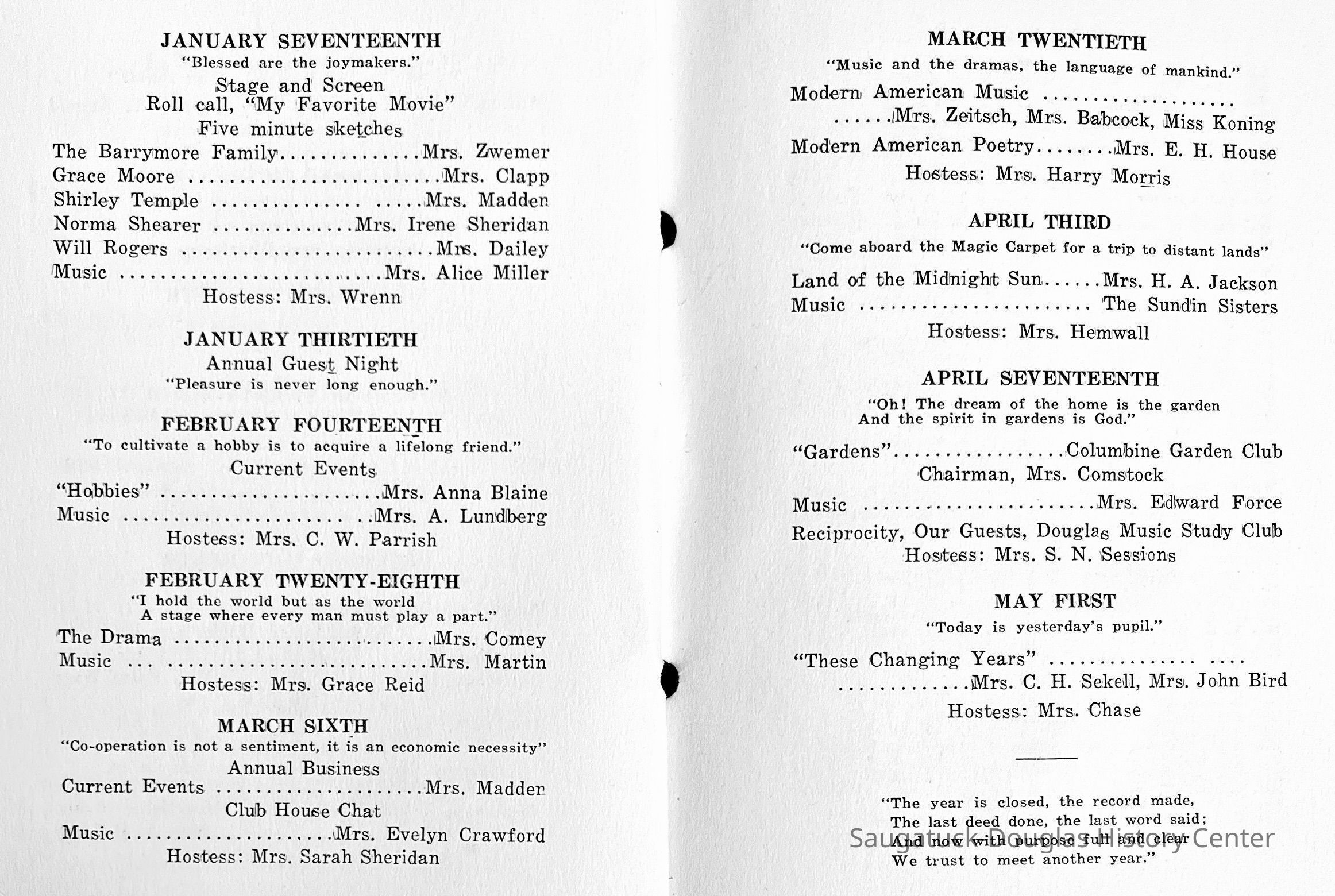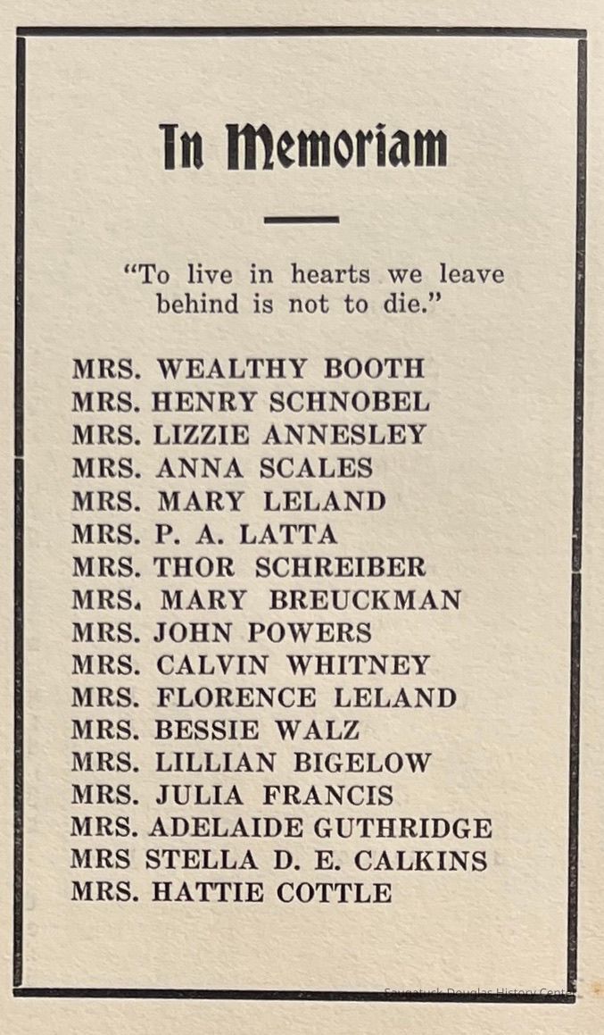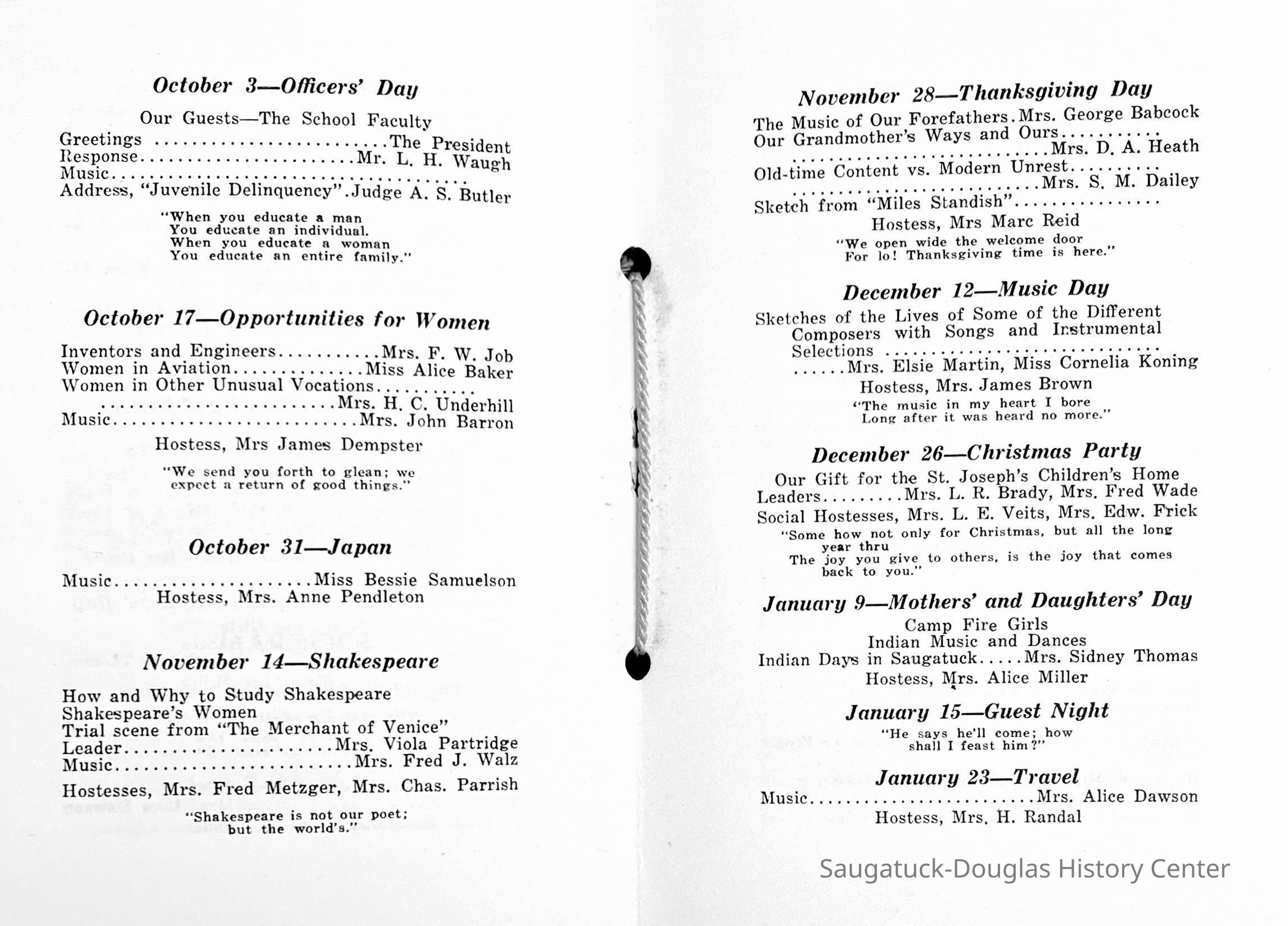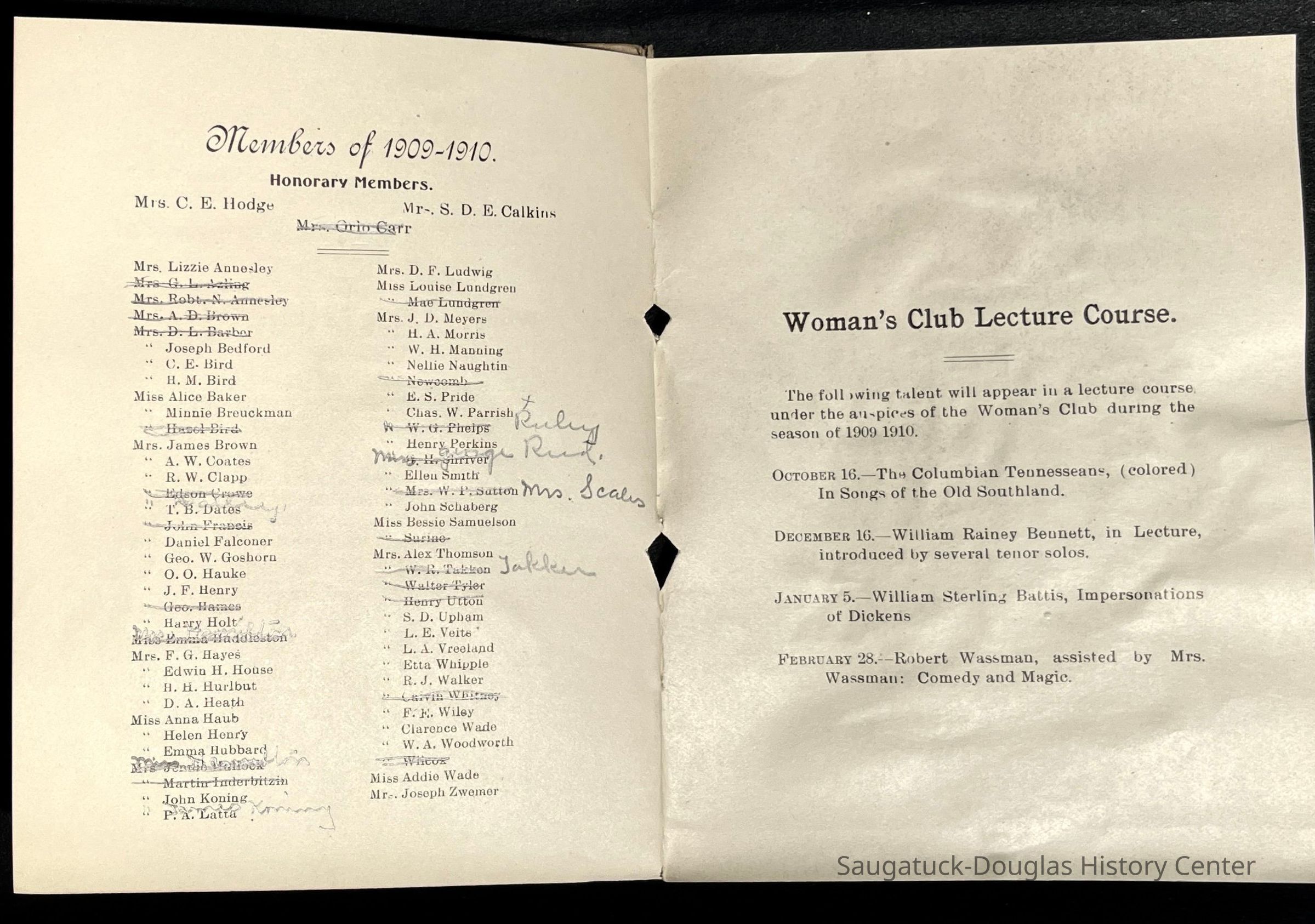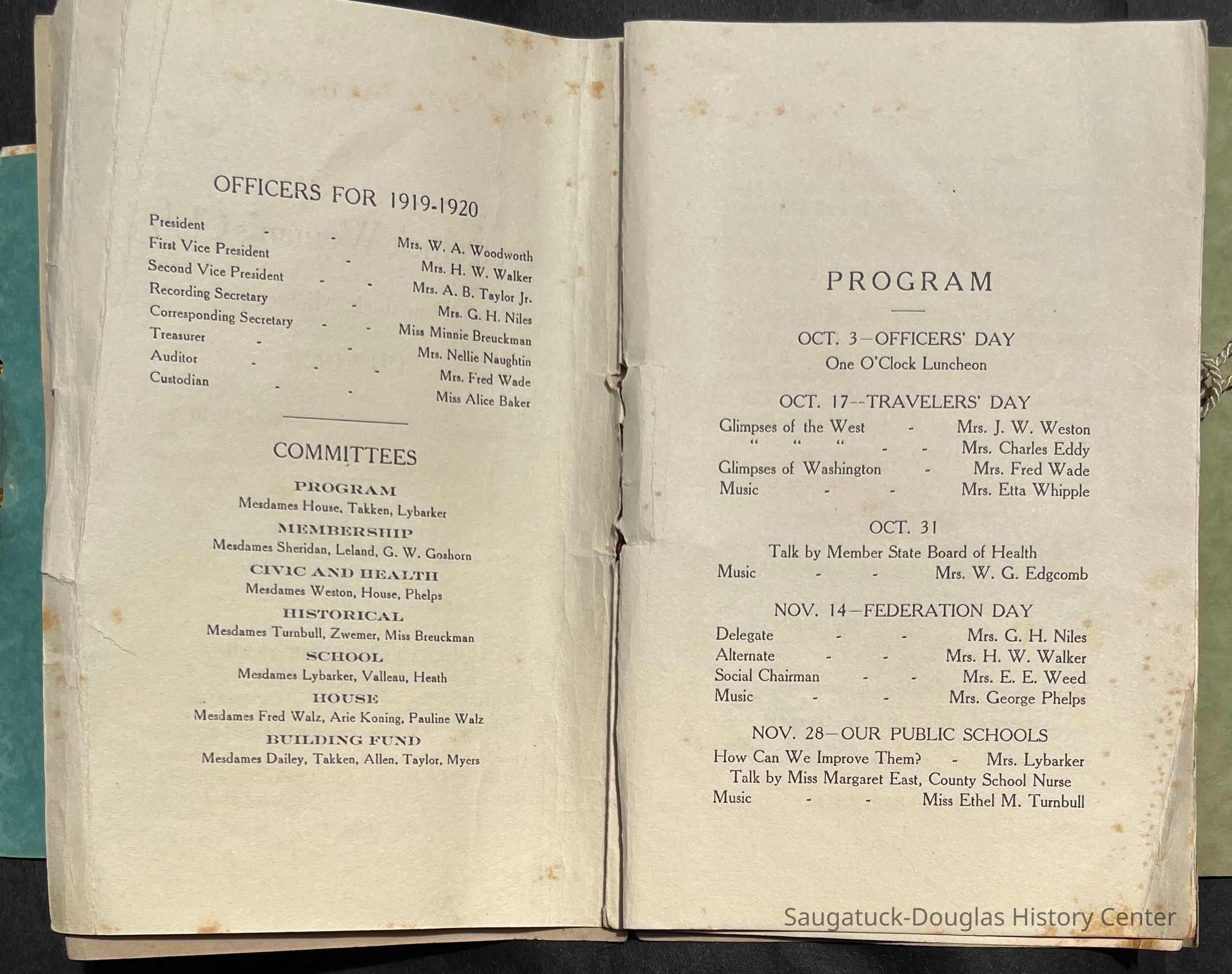 Saugatuck Woman's Club 1904-present, Saugatuck Woman's Club auditorium 1935-present, Heath, May (Francis) 1873-1961, Bird, Harriet “Hattie” Louise (Moffat) (Wright) 1855-1944, Breuckman, Minnie 1869-1934, Coates, Adella "Della" (Holmes) 1864-1950, Thomson, Jeanette Elvira (Harris) 1862-1956, Fox, Johnson 1918-2009, Hodge, Emma Ursula (Gunzenhauser) 1864-1950, Dailey, Margaret, E. (Calkins) 1866-1940, Zwemer, Saburna G. (Woodworth) 1875-1949, Henry, Isabel (Shore) 1856-1936, Woodworth, Alice C. (Redway) Mather 1848-1930, 439 Butler/Butler Pantry/Wilkins/Koning/Nies Hardware, Allen, Flora Elizabeth (Sprang) 1863-1943, Walker, Adelaide Elizabeth (Wade) 1885-1932, Goshorn, Hattie Louise (DePuy) 1874-1953, House, Celia Martin (Gamble) (1890-1976), Millar, Nellie Grant (Raymond) 1861-1956, Jackson, Rhea Bernice (Allen) 1892-1979, Leland, Ruth F. (Baker) 1878-1949, Comey, Alice Maude (Grant) 1870-1944, Davis, Edna Mae (Gaylord) 1896-1980, Wilson, Grace (Cobb) 1897-1992, Sheridan, Irene (Weible) 1883-1967, Waddell, Sadie R. 1882-1947, Wicks, Caroline Jane "Carrie" (Millar) Stillson 1884-1983, Hoffman, Elizabeth S. "Betty" (Gregory) 1894-1960, Brady, Winifred E. (Randall) 1893-1961, Peirce, Roberta "Bobbie" Margaret (Fredrickson) 1914-2004, Carr, Elsie Virginia (Kaufman) 1906-1997, Bieler or Beler, Mrs. Ernest 1904-1954?, Bainbridge, Marguerite (Holladay) 1888-1974, Edgcomb, Ruth M. (Severance) 1915-1997, Taylor, Mrs. Harold