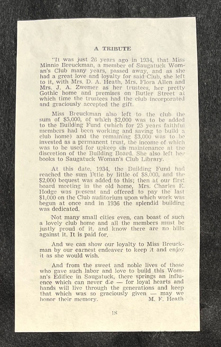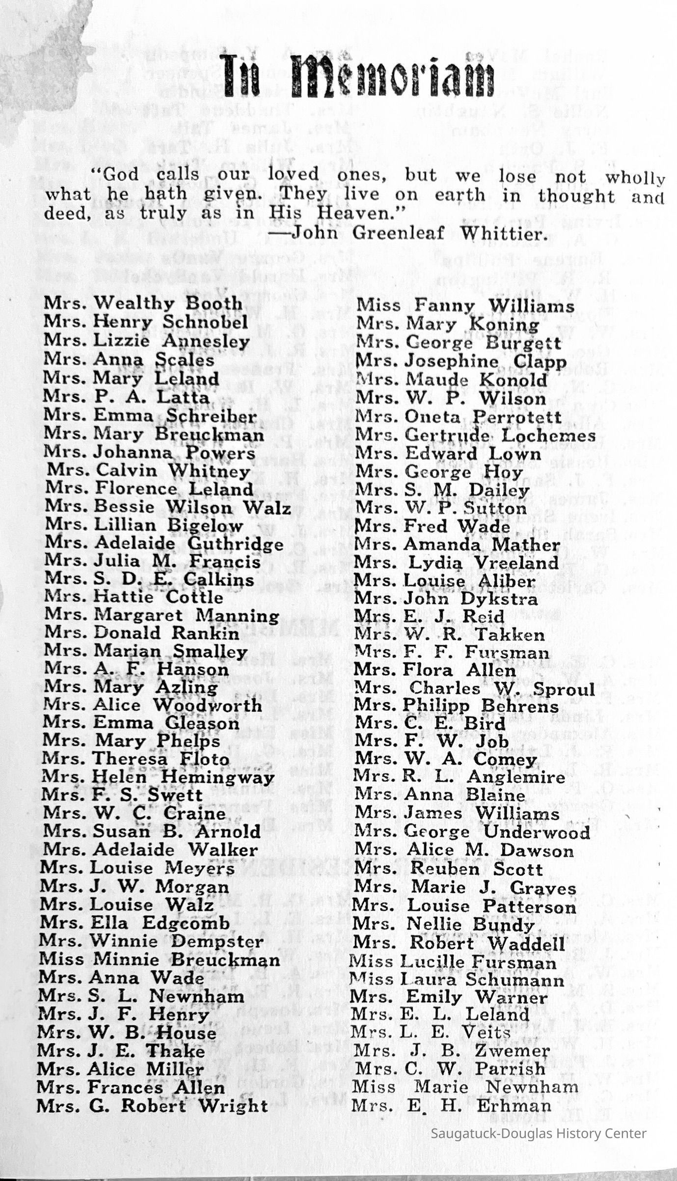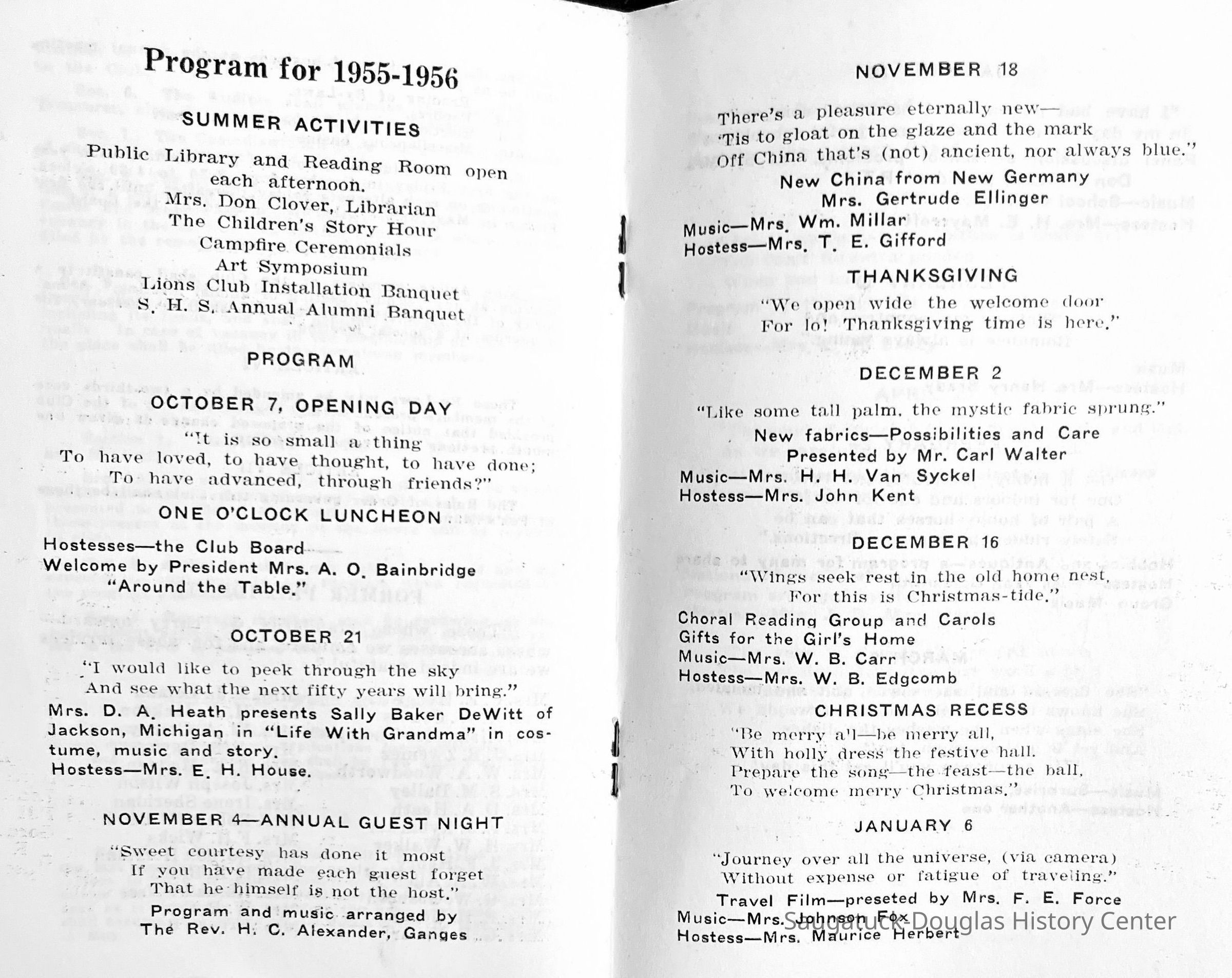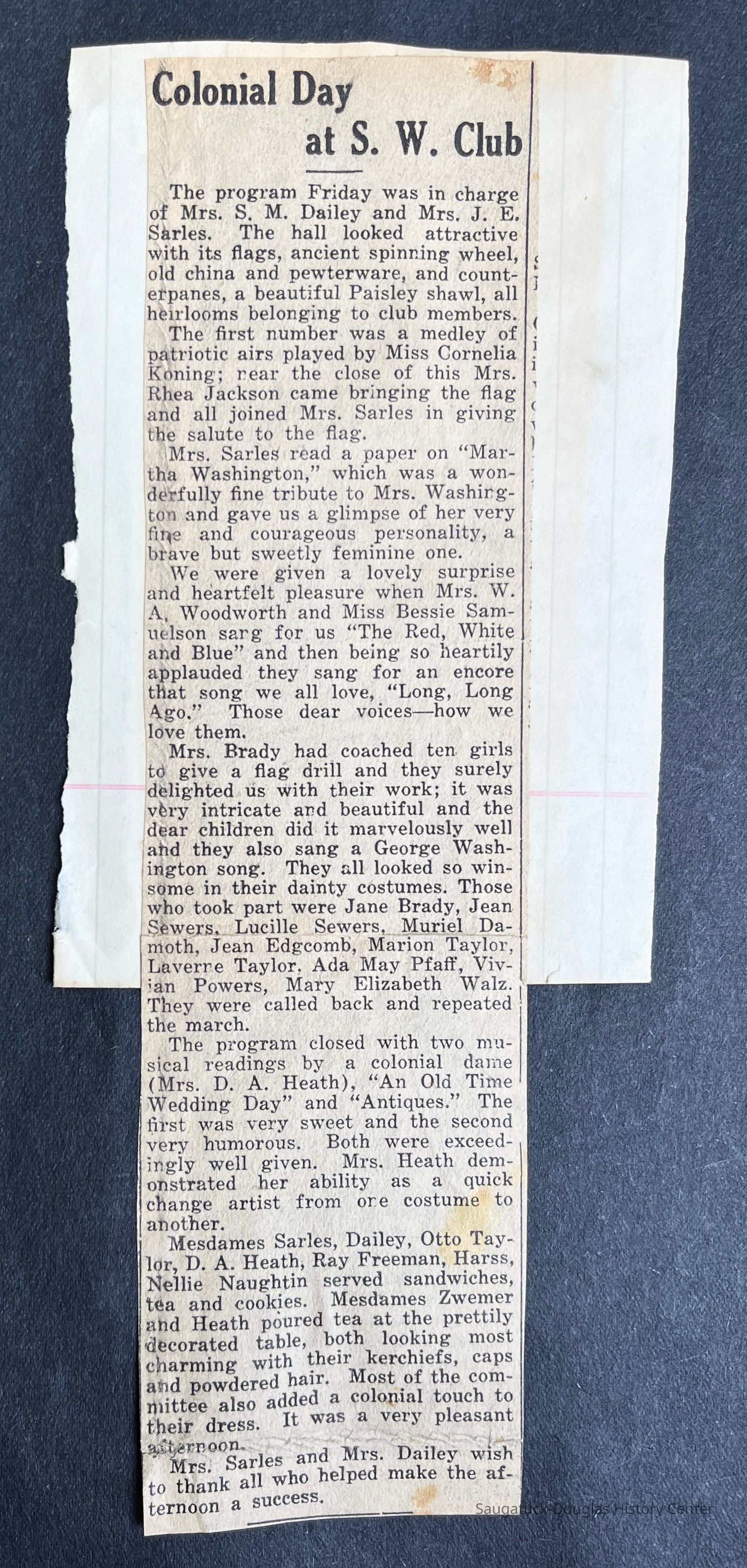 Saugatuck Woman's Club 1904-present, Saugatuck Woman's Club auditorium 1935-present, Heath, May (Francis) 1873-1961, Bird, Harriet “Hattie” Louise (Moffat) (Wright) 1855-1944, Breuckman, Minnie 1869-1934, Coates, Adella "Della" (Holmes) 1864-1950, Thomson, Jeanette Elvira (Harris) 1862-1956, Fox, Johnson 1918-2009, Hodge, Emma Ursula (Gunzenhauser) 1864-1950, Dailey, Margaret, E. (Calkins) 1866-1940, Zwemer, Saburna G. (Woodworth) 1875-1949, Henry, Isabel (Shore) 1856-1936, Woodworth, Alice C. (Redway) Mather 1848-1930, 439 Butler/Butler Pantry/Wilkins/Koning/Nies Hardware, Allen, Flora Elizabeth (Sprang) 1863-1943, Walker, Adelaide Elizabeth (Wade) 1885-1932, Goshorn, Hattie Louise (DePuy) 1874-1953, House, Celia Martin (Gamble) (1890-1976), Millar, Nellie Grant (Raymond) 1861-1956, Jackson, Rhea Bernice (Allen) 1892-1979, Leland, Ruth F. (Baker) 1878-1949, Comey, Alice Maude (Grant) 1870-1944, Davis, Edna Mae (Gaylord) 1896-1980, Wilson, Grace (Cobb) 1897-1992, Sheridan, Irene (Weible) 1883-1967, Waddell, Sadie R. 1882-1947, Wicks, Caroline Jane "Carrie" (Millar) Stillson 1884-1983, Hoffman, Elizabeth S. "Betty" (Gregory) 1894-1960, Brady, Winifred E. (Randall) 1893-1961, Peirce, Roberta "Bobbie" Margaret (Fredrickson) 1914-2004, Carr, Elsie Virginia (Kaufman) 1906-1997, Bieler or Beler, Mrs. Ernest 1904-1954?, Bainbridge, Marguerite (Holladay) 1888-1974, Edgcomb, Ruth M. (Severance) 1915-1997, Taylor, Mrs. Harold