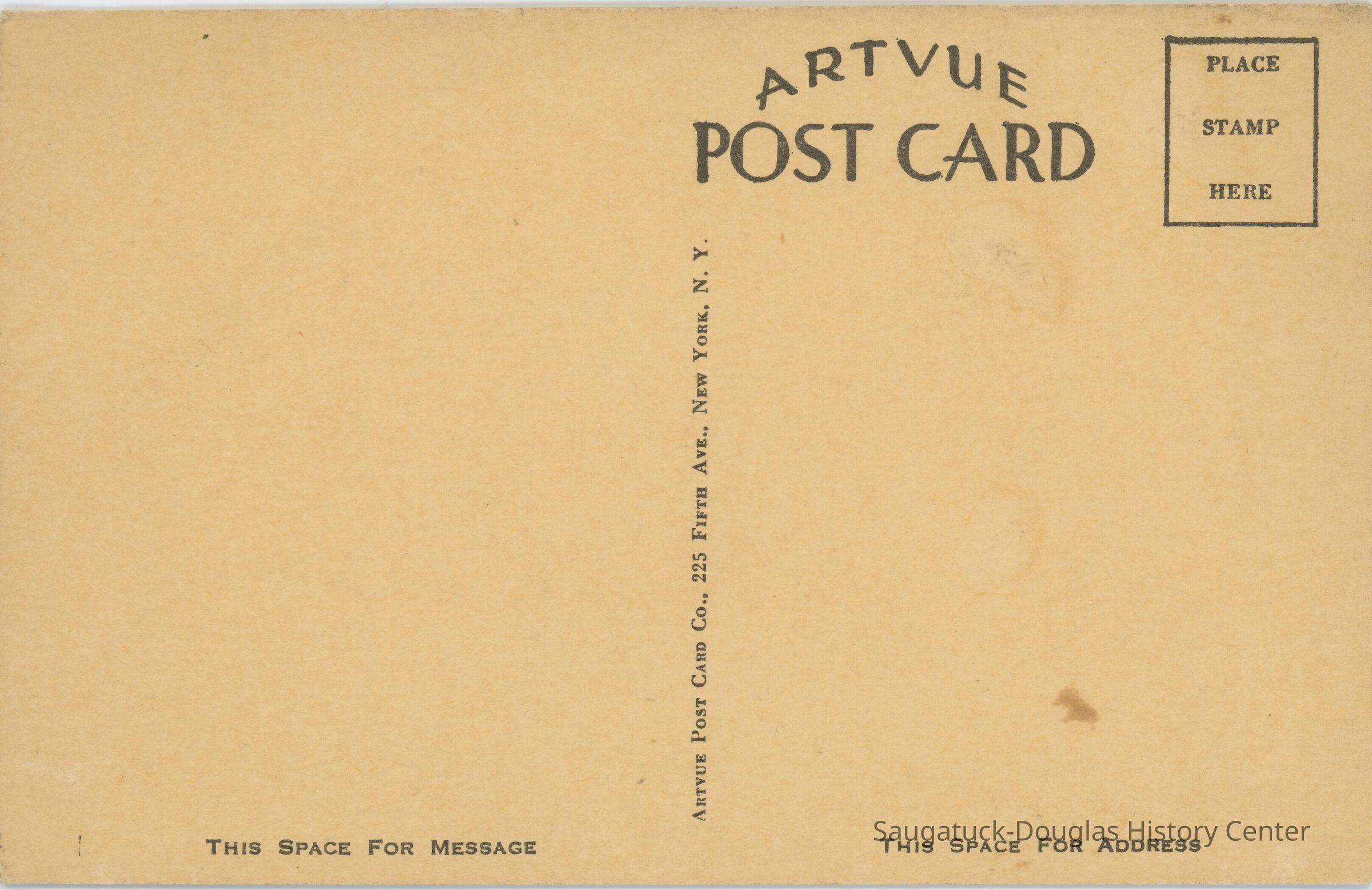 A black and white postcard showing the West Shore Lodge located on West Shore Golf Links in Douglas, Michigan. Notably, the chimney is on the front of the building.Subject