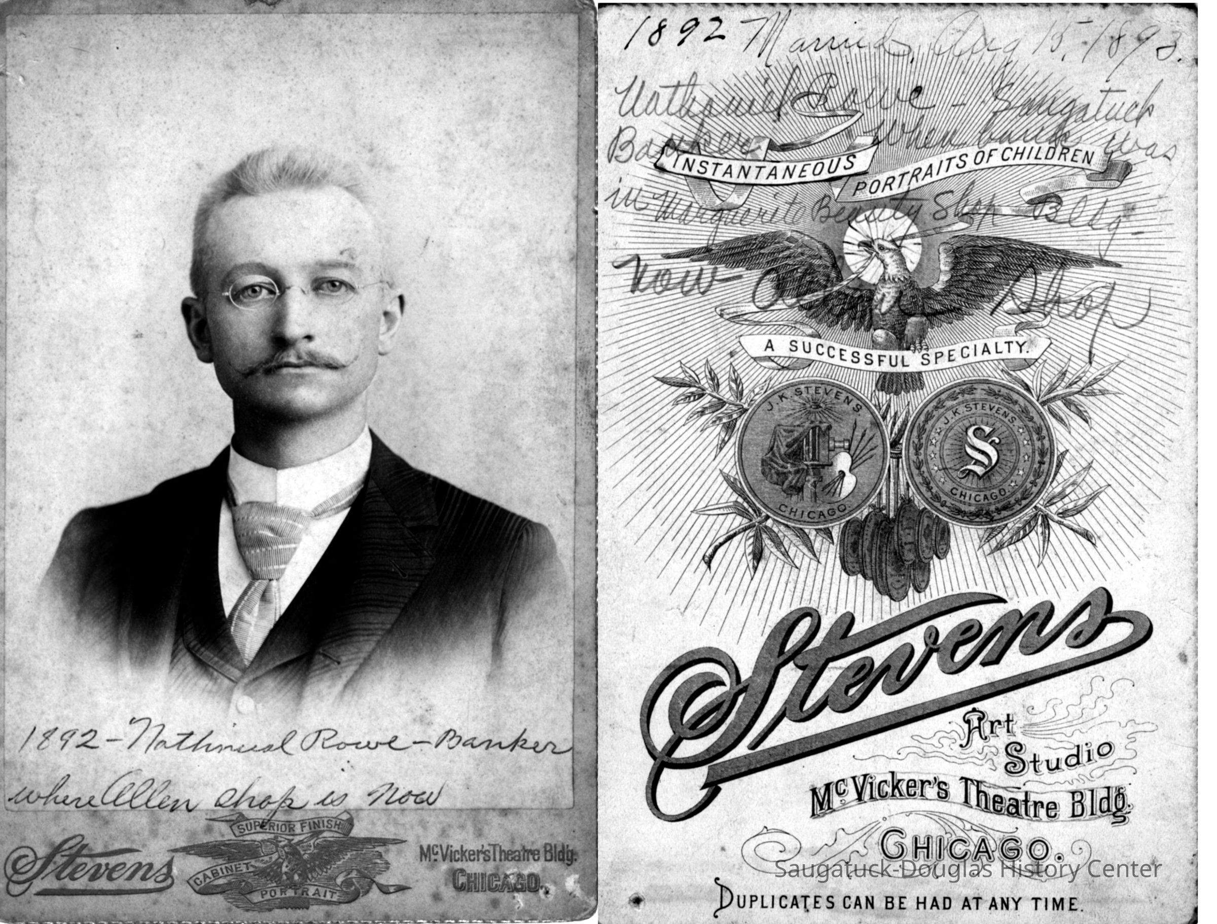 Portrait of a mustachioed, bespectacled man. Writing on front and back of card identifies the sitter as 1892 Nathaniel Rowe - Banker where Allen shop is now. Married Aug. 15, 1893. When bank was in Marguerite Beauty Shop Bldg.