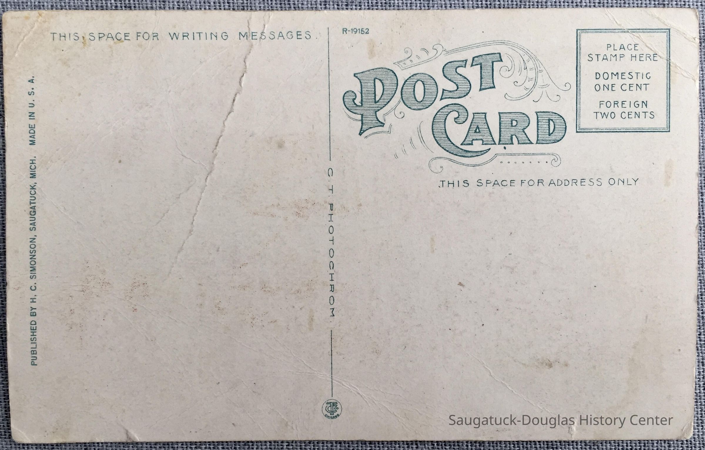 Unmailed, no writing. Color image on front and green-ink only on back. "Place stamp here" zone lists domestic postage as one cent. Image is printed, not a photo.Subject Person/Organization