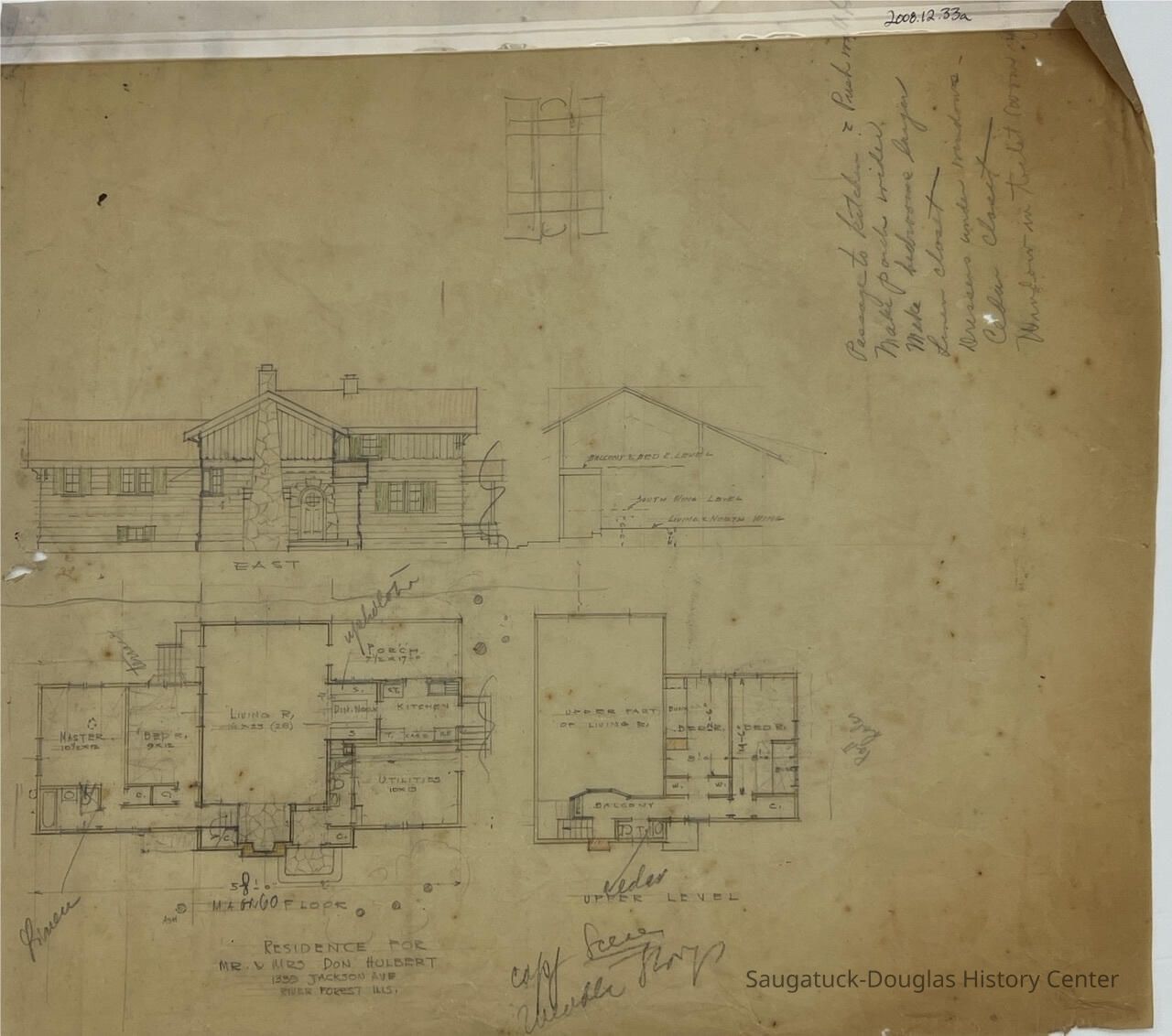This architectural drawing consists of detailed drawings for the east elevation of the residence as well floor plans for the first and second floors. They include some of the room measurements. The upper right corner of the sheet contains notes written down.Collection