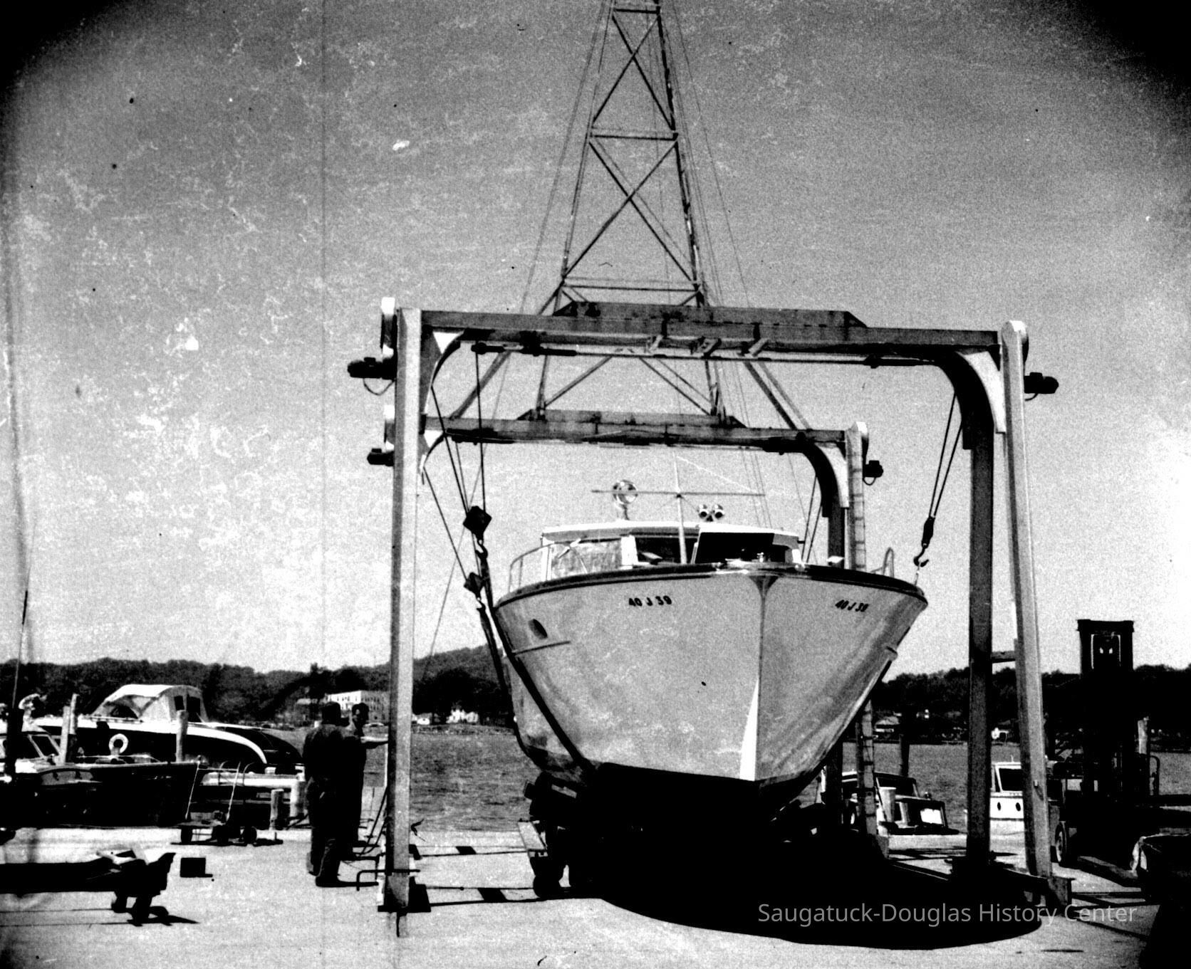 Yachts and sailboats docked and the boat sling at Pier Marina. As per "Off the Record" — Pier Marina was Saugatuck's first modern marina built by Frank Denison on the old bridge land near the Blue Star Highway formerly owned by the village.