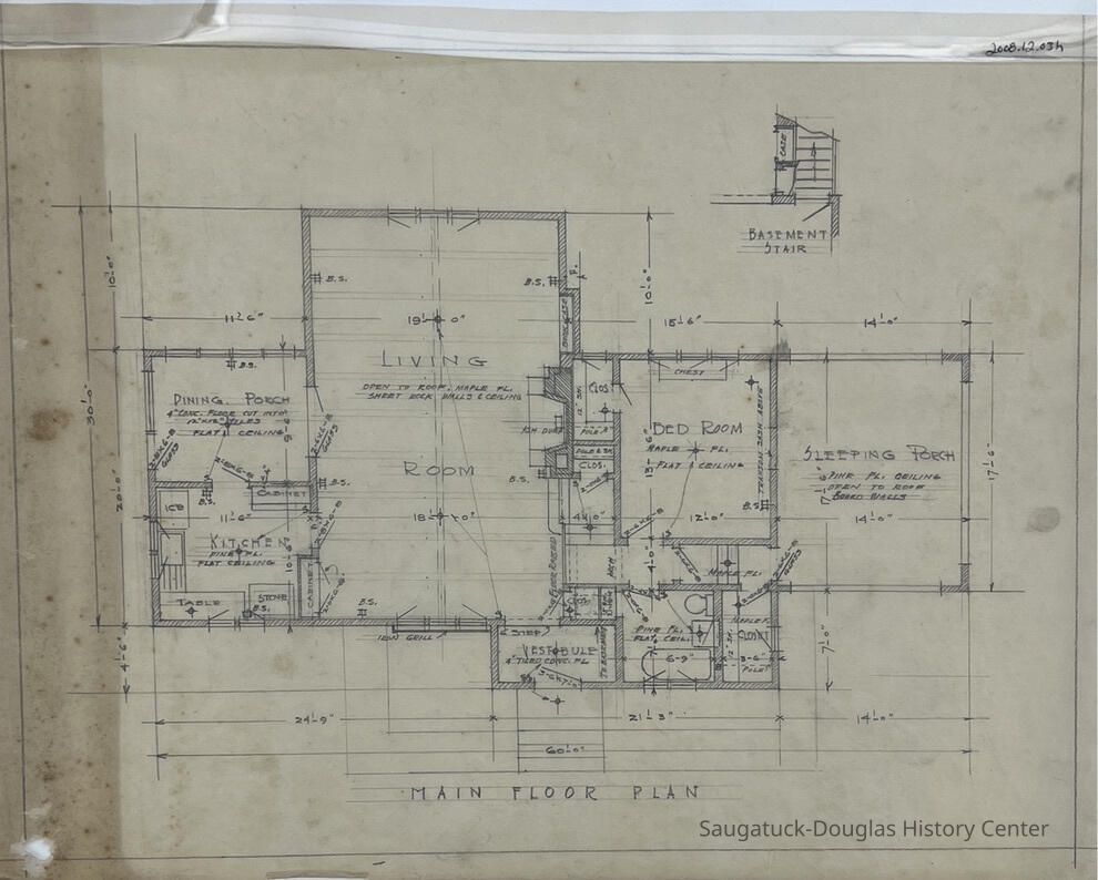 This architectural drawing shows the floor plan of the Merril house. It gives room labels and measurements for detail.Collection