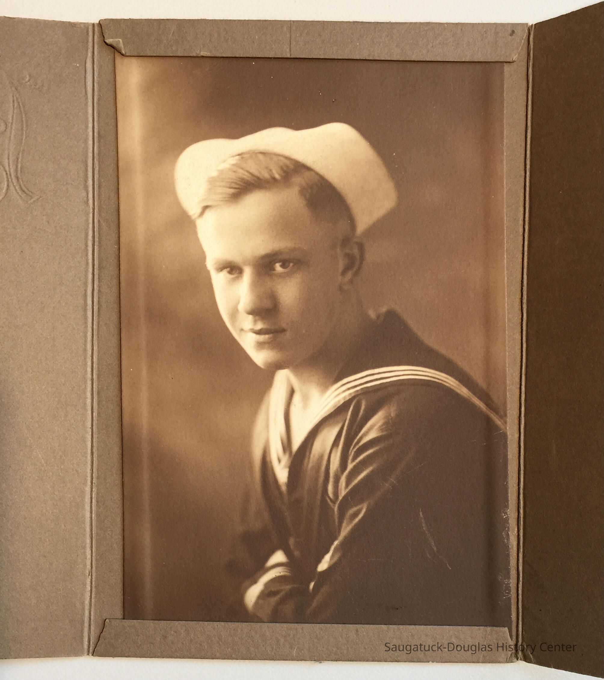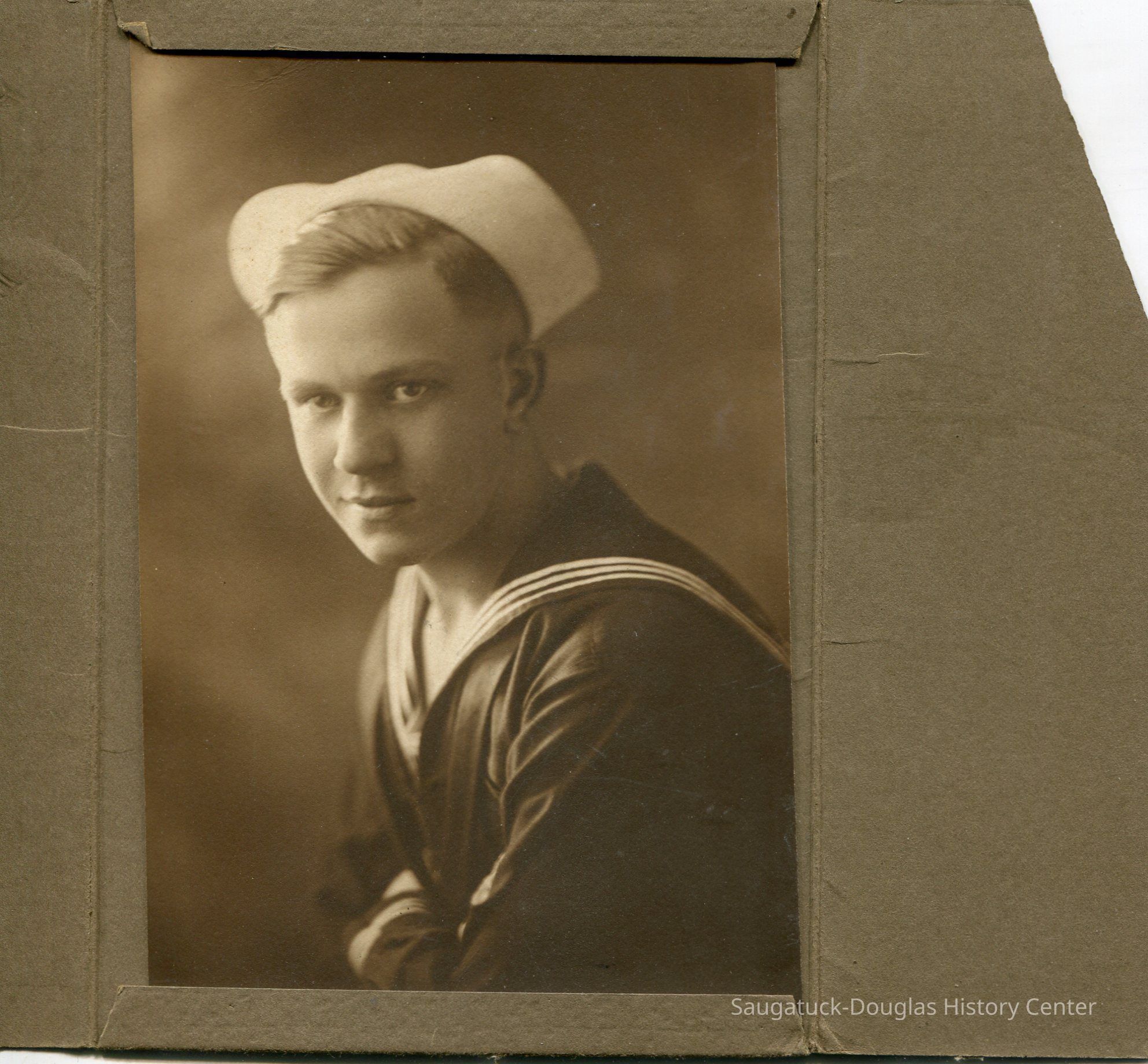 Studio portrait of a young man in a sailors uniform shirt and cap. The sailor is leaning forward with his arms crossed.