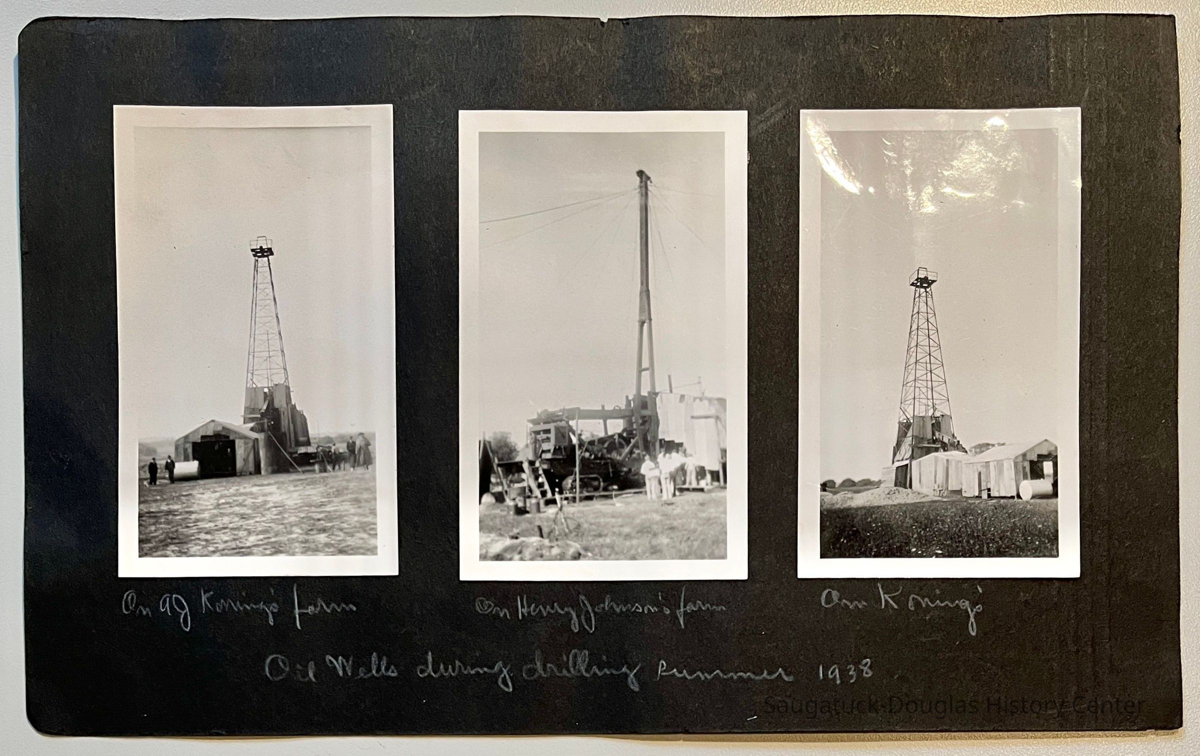 Black paper page from a photo album with three attached photographs of oil drilling derricks or oil rigs. Handwritten text beneath the photos read "On AJ Konnings farm, On Henry[?] Johnson's farm, On Koning's, Oil wells during drilling summer 1938Photograph Details