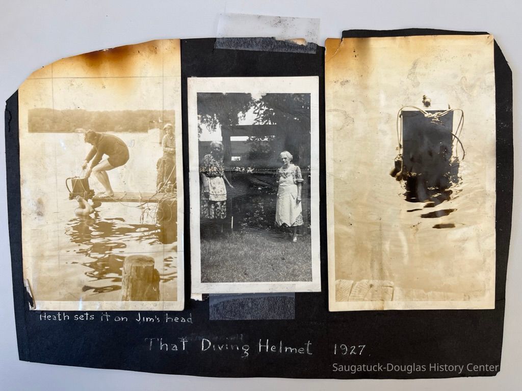 "Submarine Hiker / Youth at Saugatuck Invents Sea Hat with Which He Takes Leisurely Jaunt on Kalamazoo River Bottom."Photograph Details