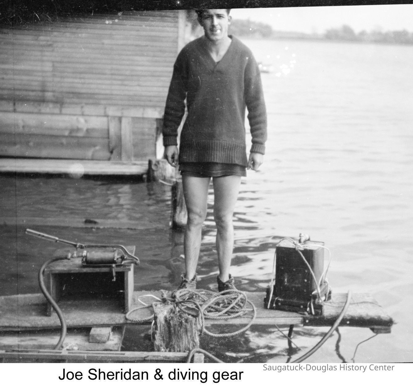 Grand Rapids Press newspaper clipping marked August 26, year unknown, of Joseph Sheridan's Sea Hat, an invention that used a bicycle pump to deliver air to a helmet worn by a person walking across the bottom of a lake.