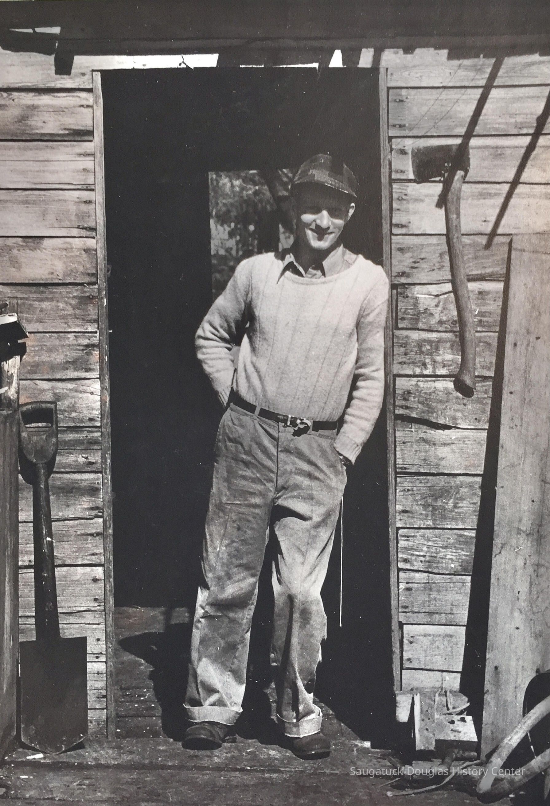 B/W photo of Jack Sewers smiling as he leans against the doorframe of a shanty. He is wearing a cap and work clothing. An ax and shovel are hanging from/resting against the building.