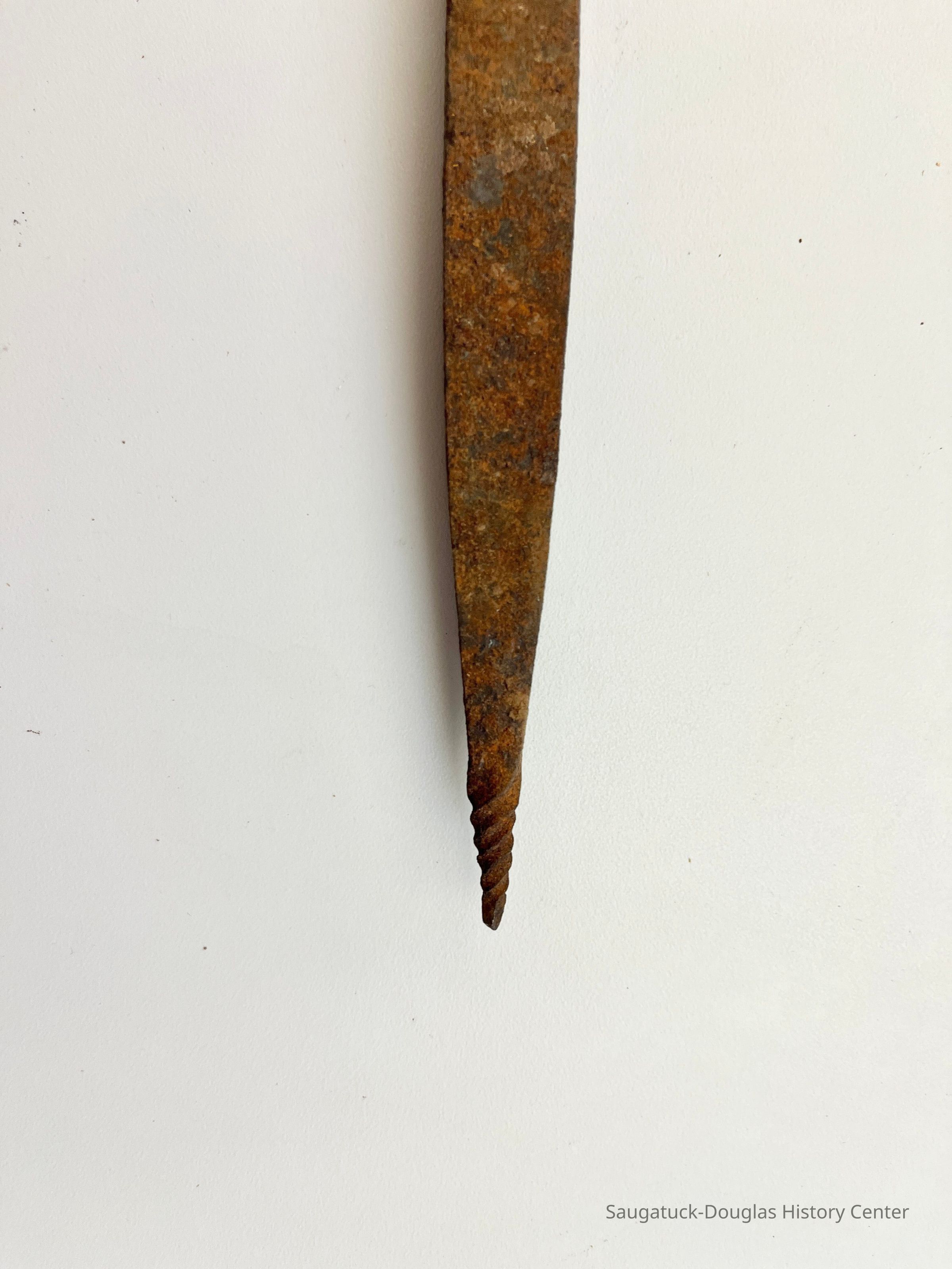 Solid metal tool with square profile and tapering tip that ends in a twisted thread. The tool may have once had a handle. The surface, though pitted with rust and use, is not textured like a rasp or file.Cataloged By