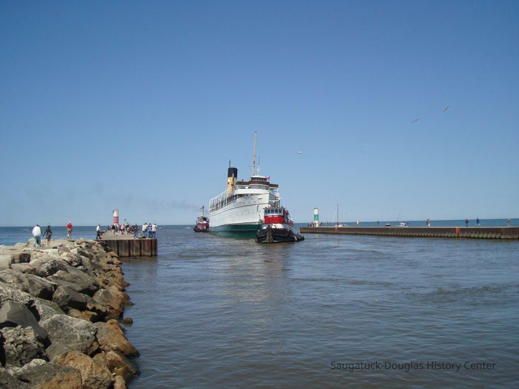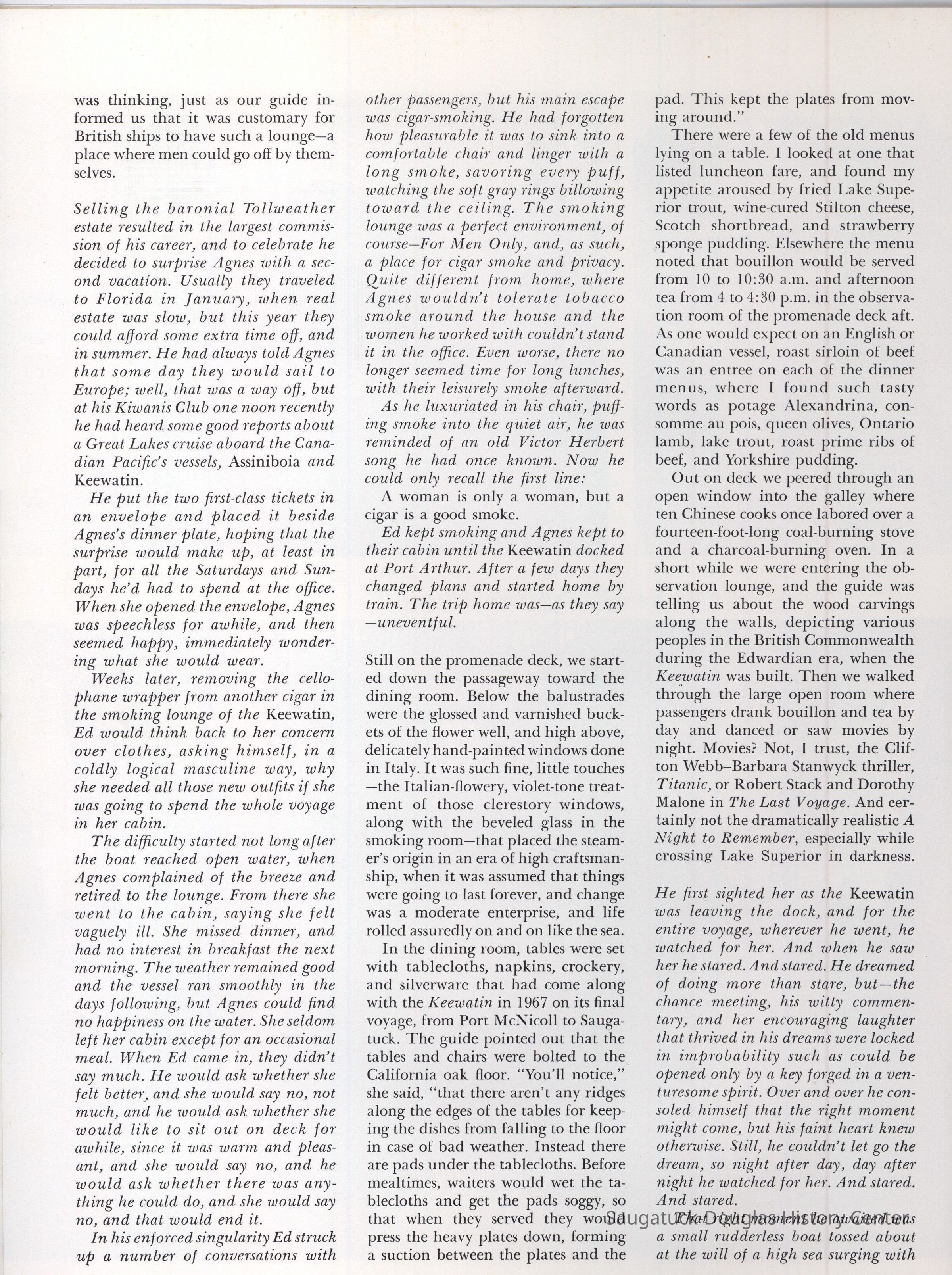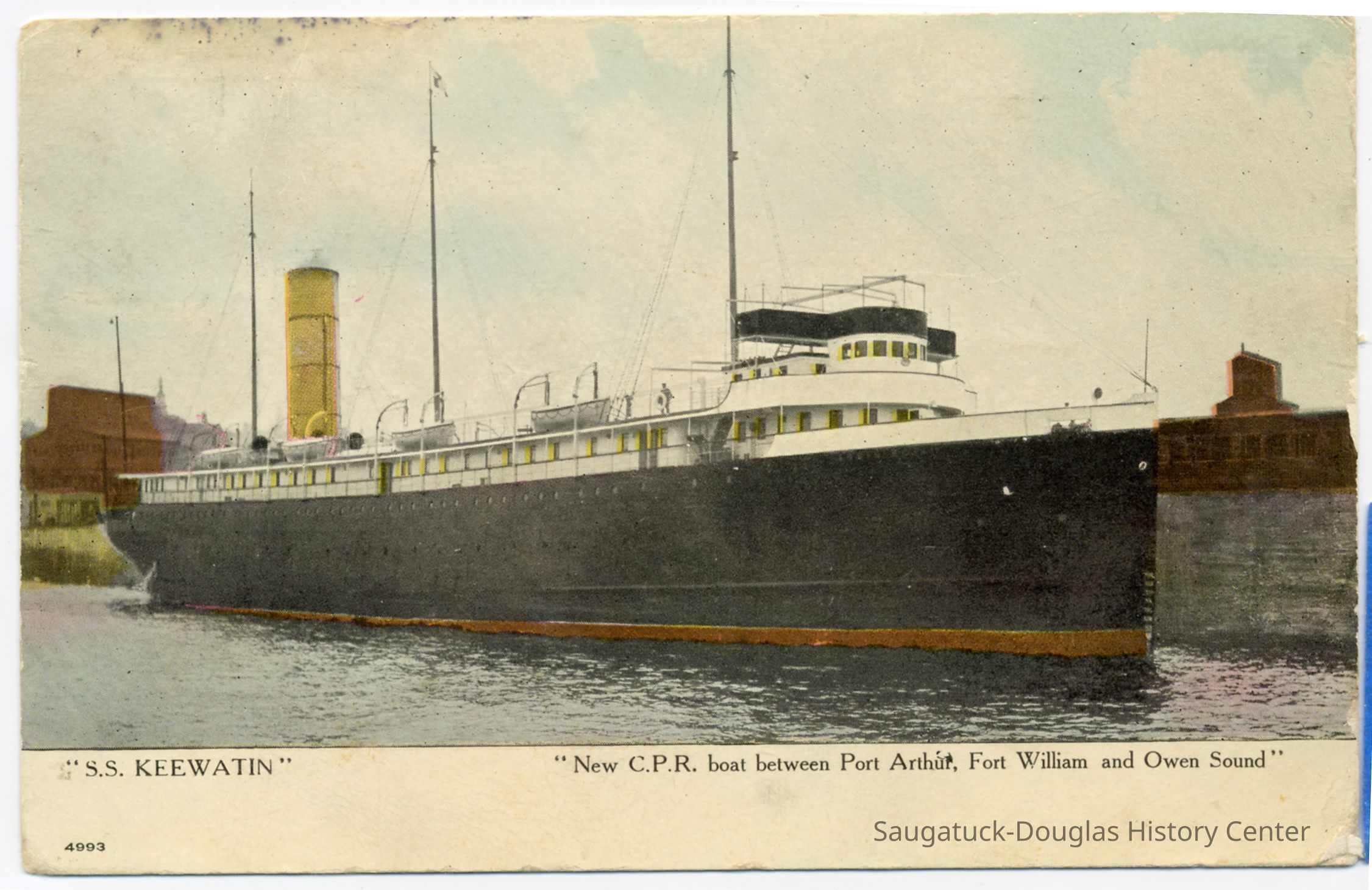 Scans of photos, postcards and newspaper clippings of the S.S. Keewatin during her stay in Douglas, plus a history article authored by Sheldon Mix.Photograph Details