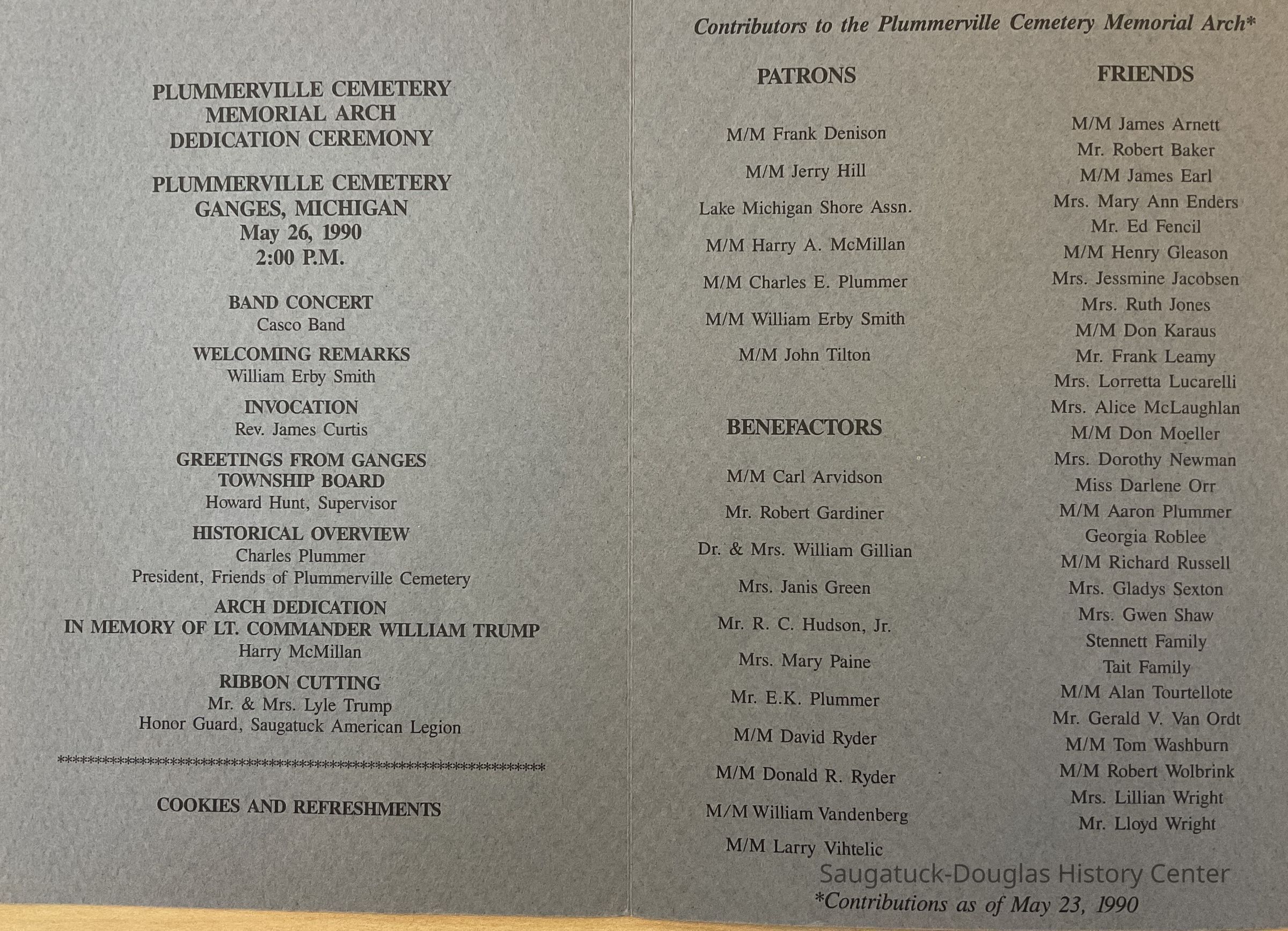 Friends of Plummerville Cemetery booklet regarding Plummerville Cemetery Memorial Arch Dedication Ceremony. Program for the ceremony and contributors to the memorial listed in booklet.Collection