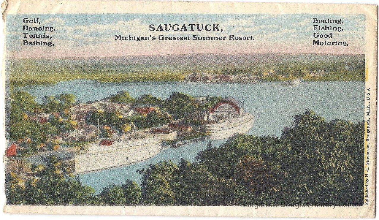 The front of the envelope is a copy of a postcard image which was popular at the time showing the town from Mt. Baldhead and two large ships possibly the North or South America and the Alabama. The words "Saugatuck, Michigan's Greatest Summer Resort and Golf, Dancing, Tennis, Bathing, Boating, Fishing, Good Motoring" appear on the top of the image.