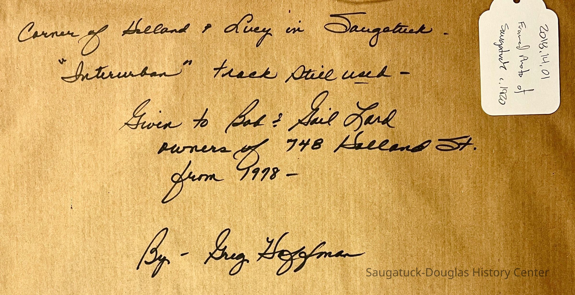 Inscription on backing paper on frame: Corner of Holland and Lucy in Saugatuck, "Interurban" track still used -- Given to Bob & Gail Lord owners of 748 Holland St. from 1978 -- by Greg Hoffman.Photograph Details