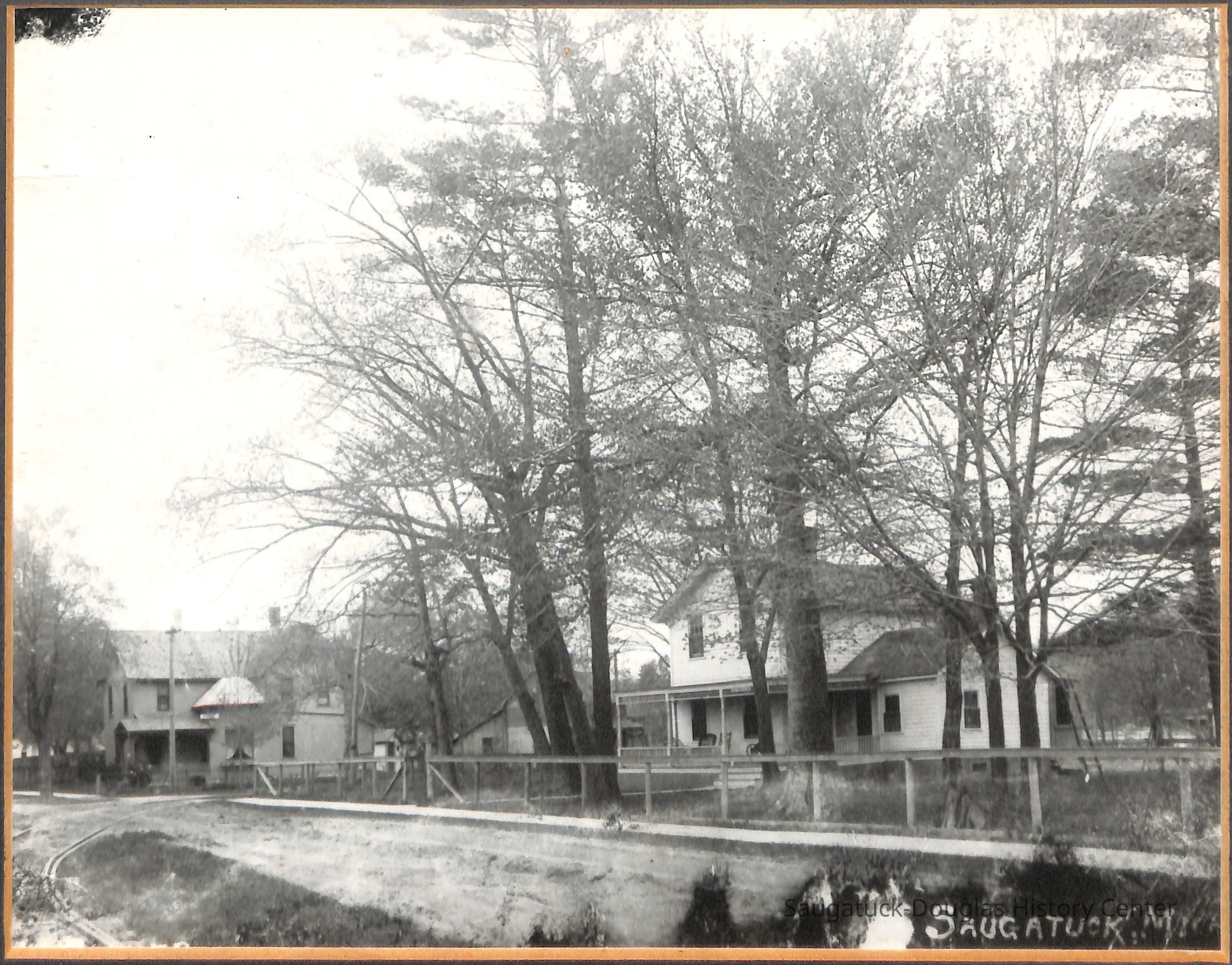Black and white photograph of the two houses on the corner of Holland and Francis Street in Saugatuck ca. 1920. It shows the Interurban train tracks in the foreground.