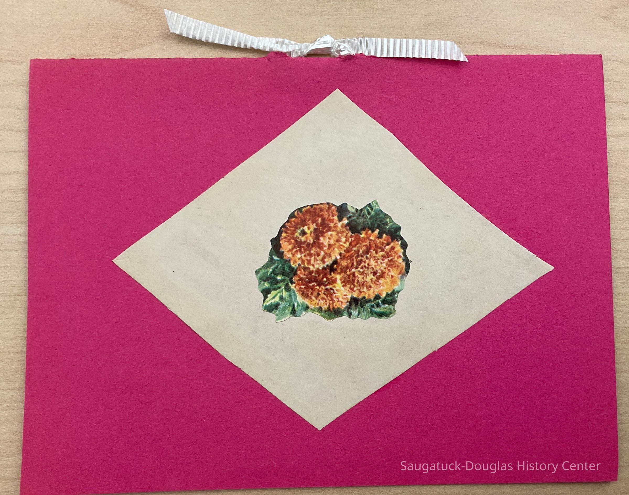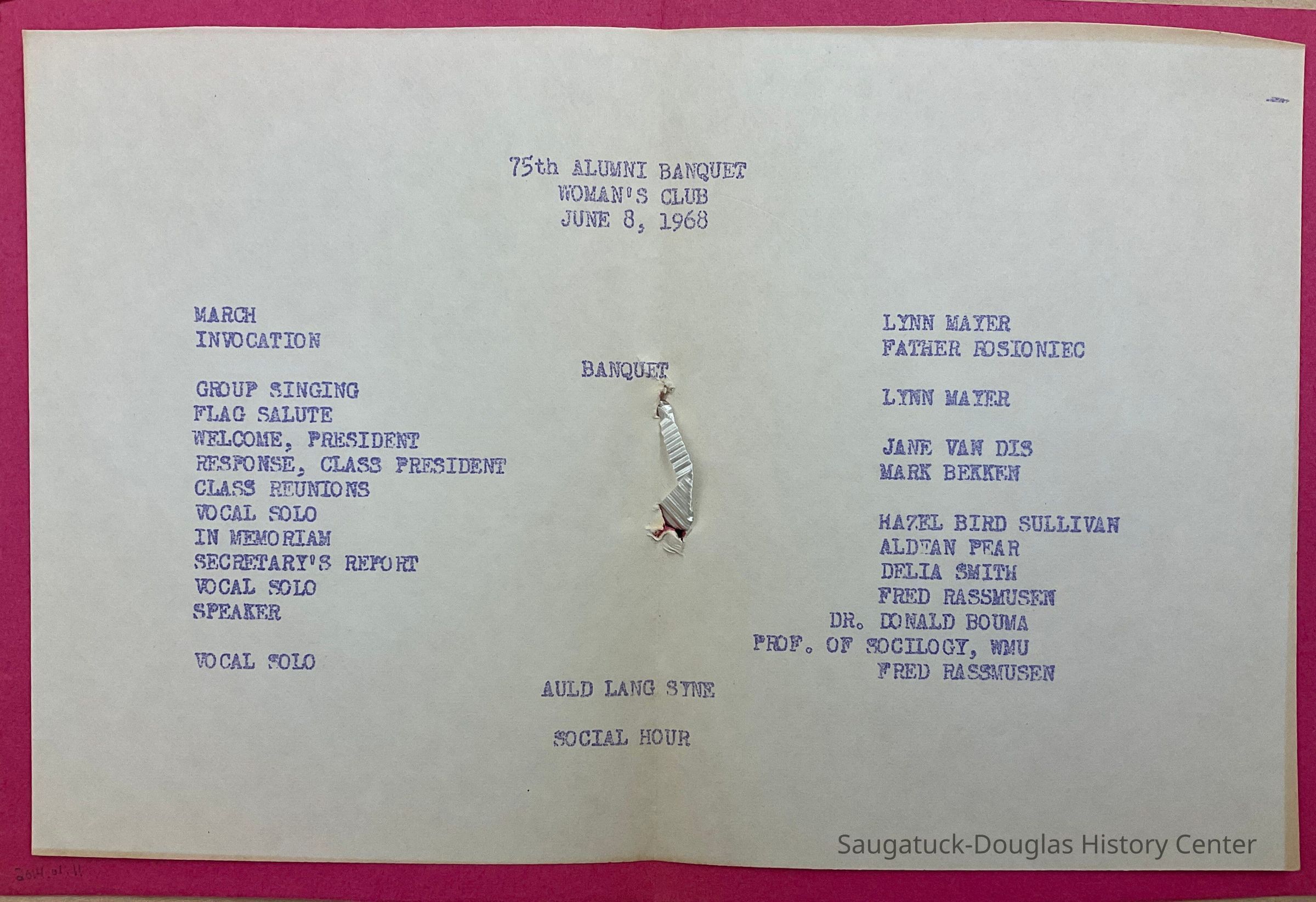 This homemade booklet features a diamond and printed flower cutout pasted on a pink, construction-paper cover and a white ribbon tie. The interior contains the program for the Woman's Club 75th Alumni Banquet on June 8, 1968.Context