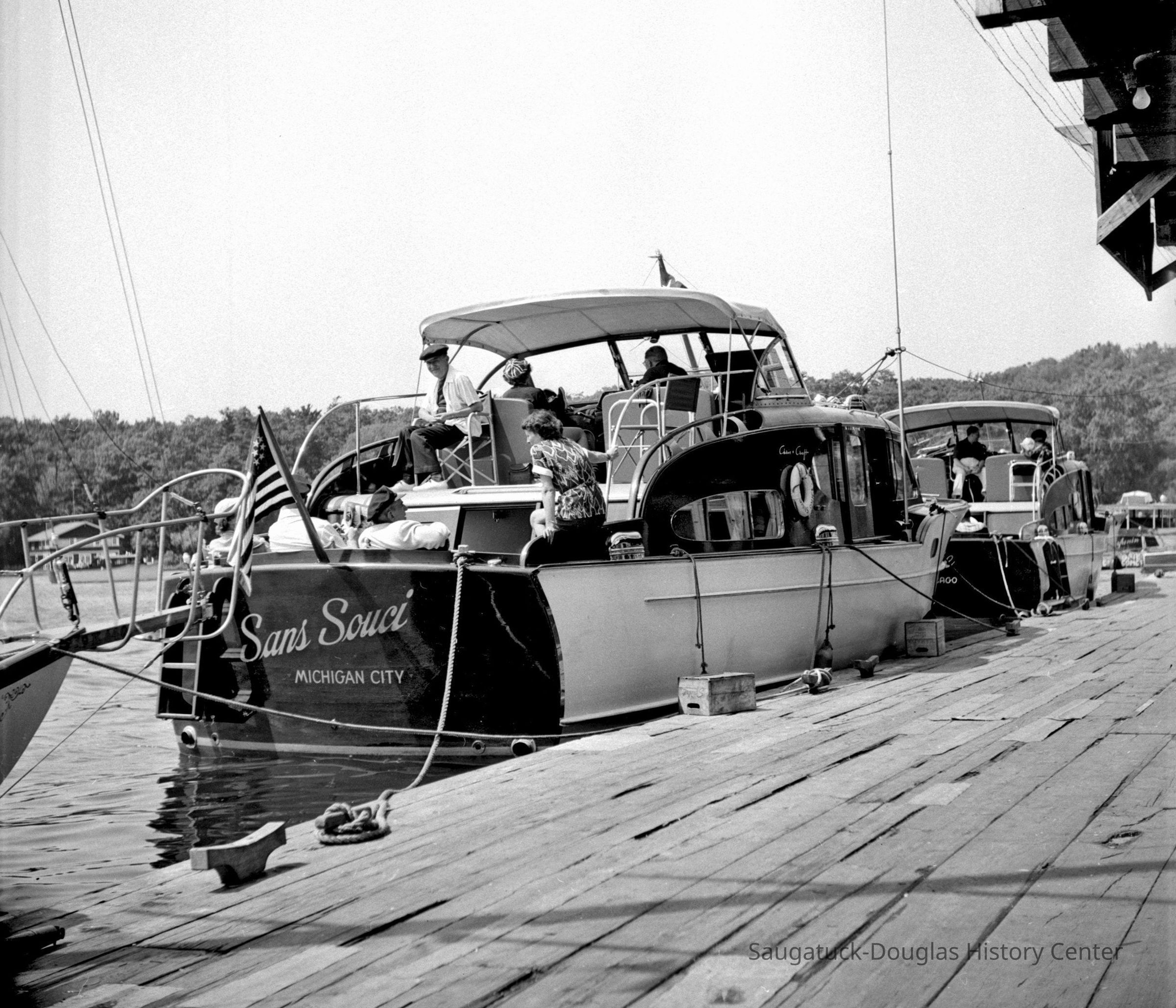593 12/13 Saugatuck - cruisers 1952 Sans Souci, relaxing on Pavilion dock