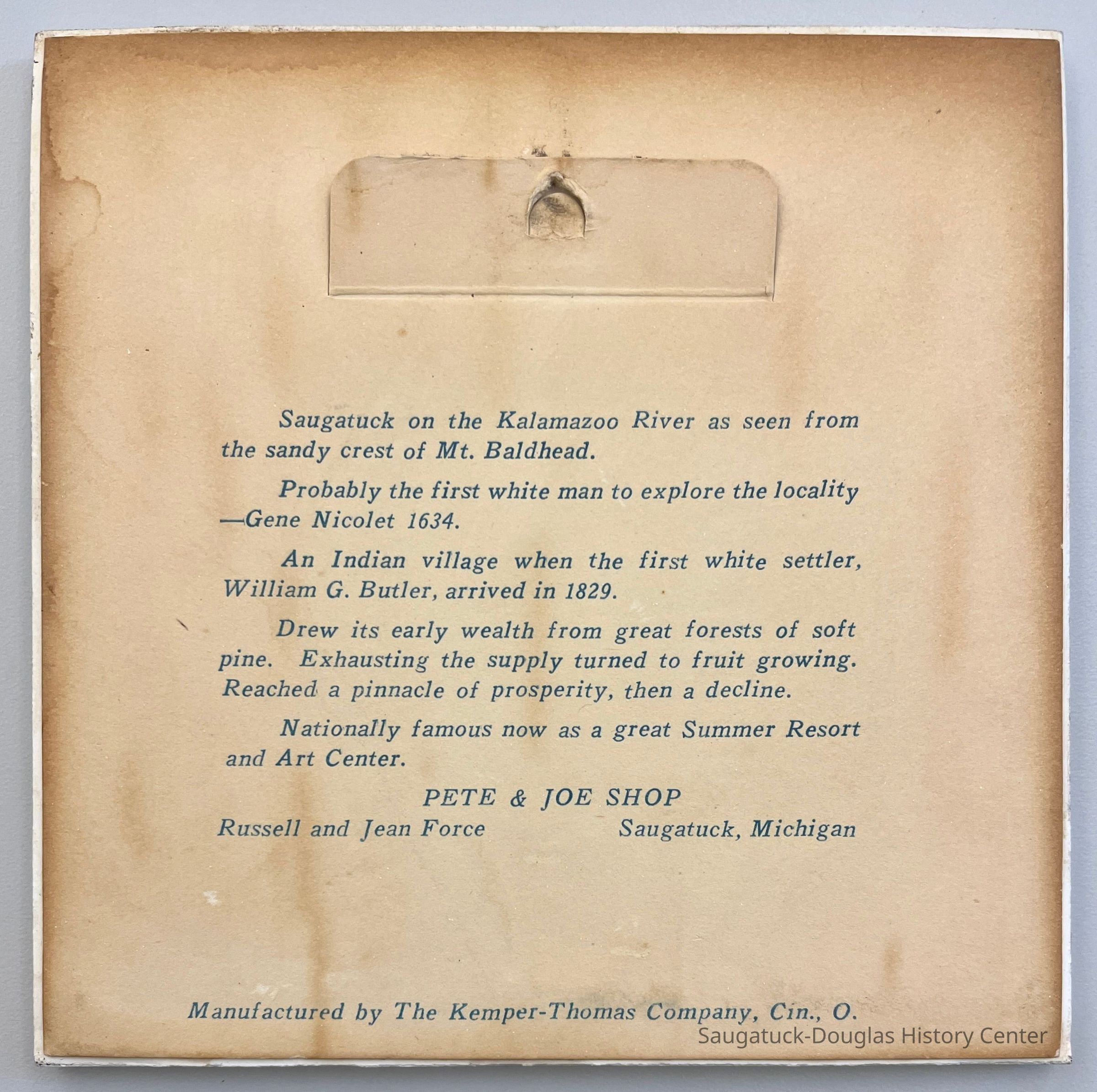 6-inch square decorative ceramic tile printed with an illustration of the view from Mount Baldhead in brown glaze. A paper label with an integrated hanger covers the back of the tile. The label is printed with a brief history of Saugatuck and the text "Pete & Joe Shop, Russell and Jean Force" and "Manufactured by The Kemper-Thomas Company" of Cincinnati, Ohio.Context