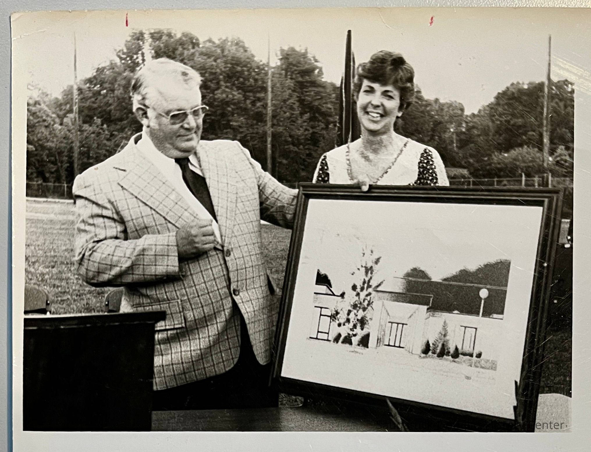 Cynthia Sorensen, and the generous readers of Saugatuck Informed, identified the woman as school board member Debbie Hoffman. The artwork is believed to be a rendering of the new high school entrance, circa 1974. According to Mark Neidlinger, 1973 was the last class to graduate from the old school. The new school's first grads were in 1974. The gentleman pictured is Don Oyler, school superintendent.Collection