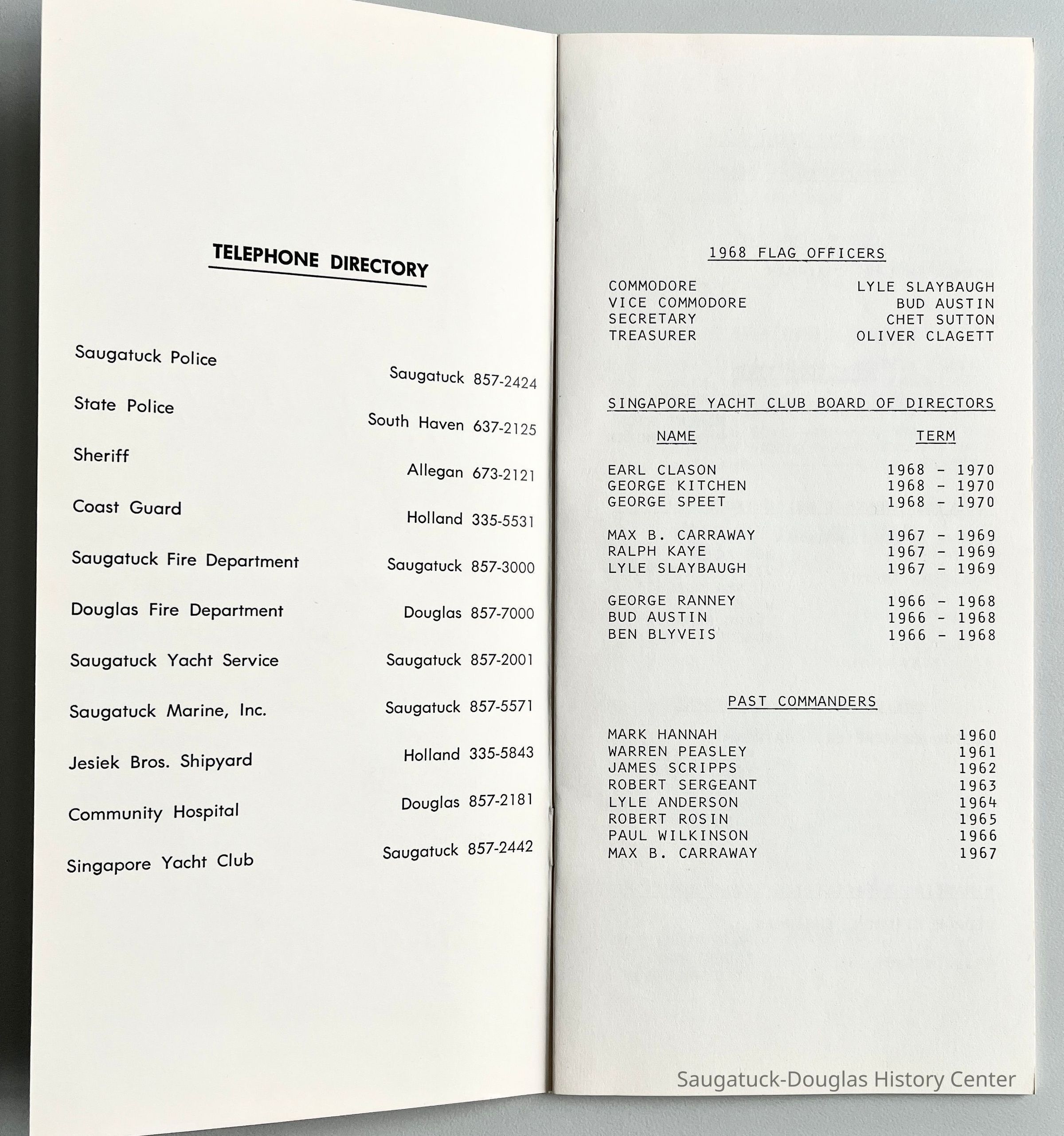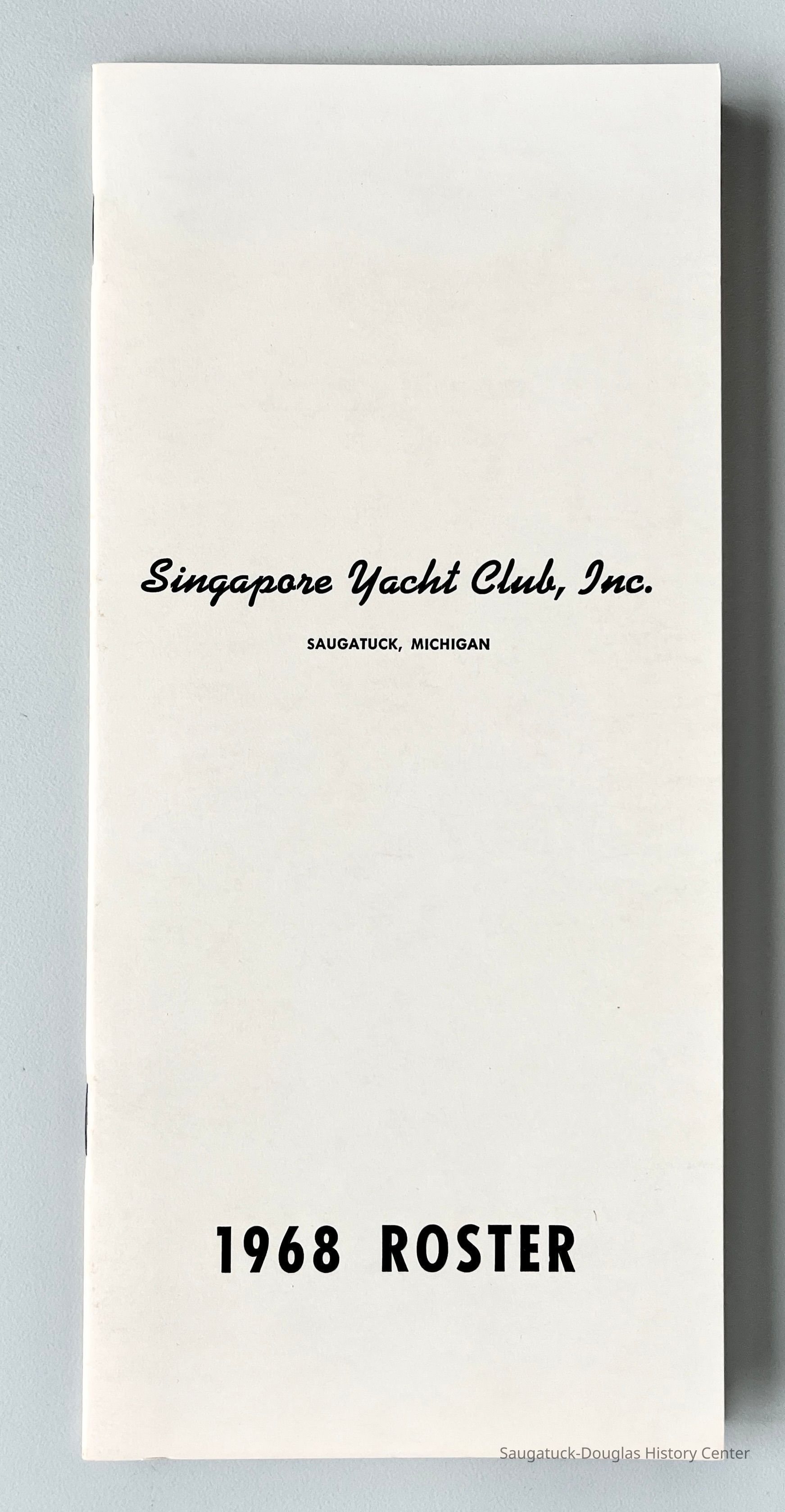 Slim white staple-bound booklet containing club membership directory with names of member's boats, lists of officer, directors, commanders, committees and by-lawsCollection