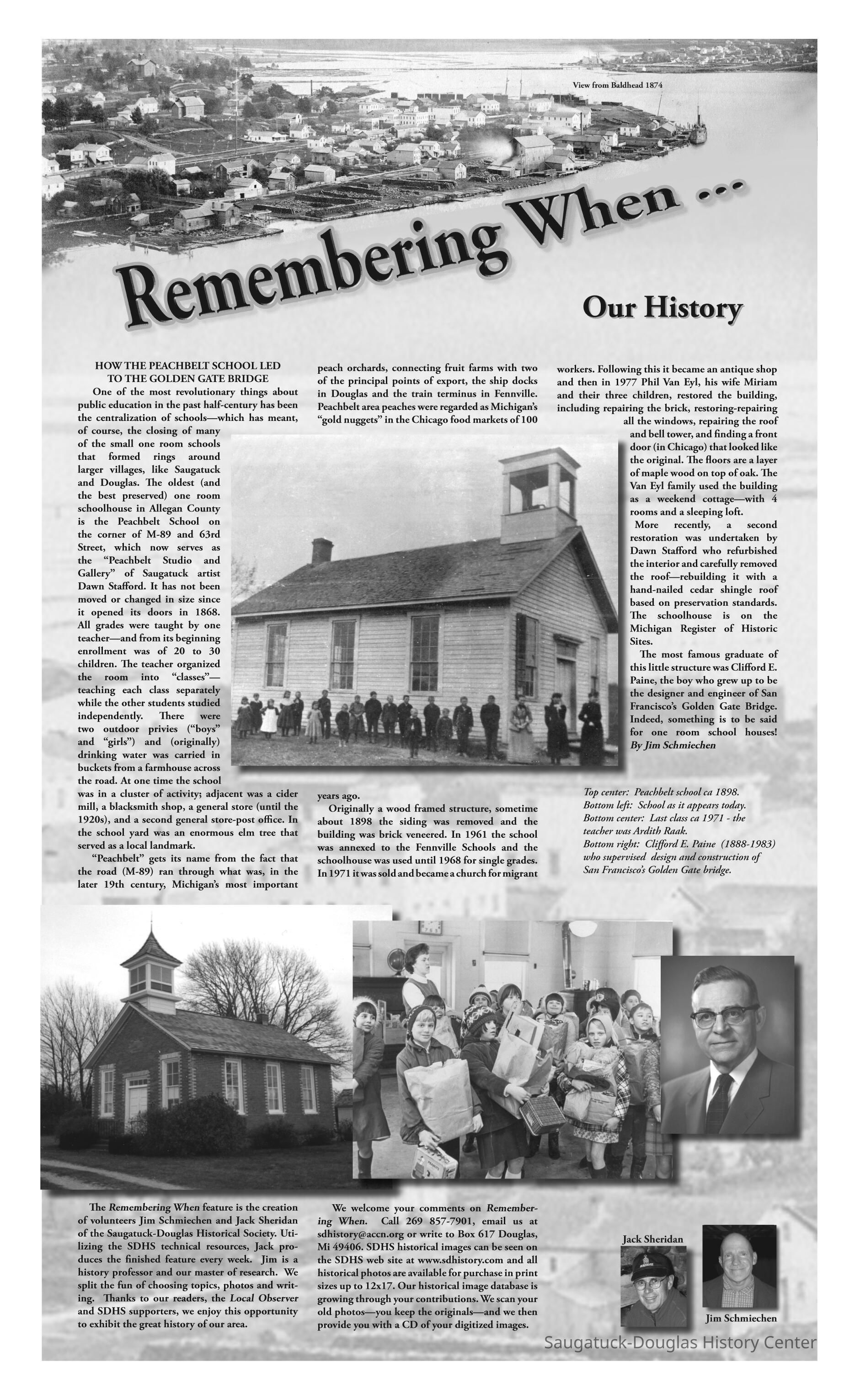 One of the most revolutionary things about public education in the past half-century has been the centralization of schools—which has meant, of course, the closing of many of the small one room schools that formed rings around larger villages, like Saugatuck and Douglas. The oldest (and the best preserved) one room schoolhouse in Allegan County is the Peachbelt School on the corner of M-89 and 63rd Street, which now serves as the “Peachbelt Studio and Gallery” of Saugatuck artist Dawn Stafford. It has not been moved or changed in size since it opened its doors in 1868. All grades were taught by one teacher—and from its beginning enrollment was of 20 to 30 children. The teacher organized the room into “classes”—teaching each class separately while the other students studied independently. There were two outdoor privies (“boys” and “girls”) and (originally) drinking water was carried in buckets from a farmhouse across the road. At one time the school was in a cluster of activity; adjacent was a cider mill, a blacksmith shop, a general store (until the 1920s), and a second general store-post office. In the school yard was an enormous elm tree that served as a local landmark.