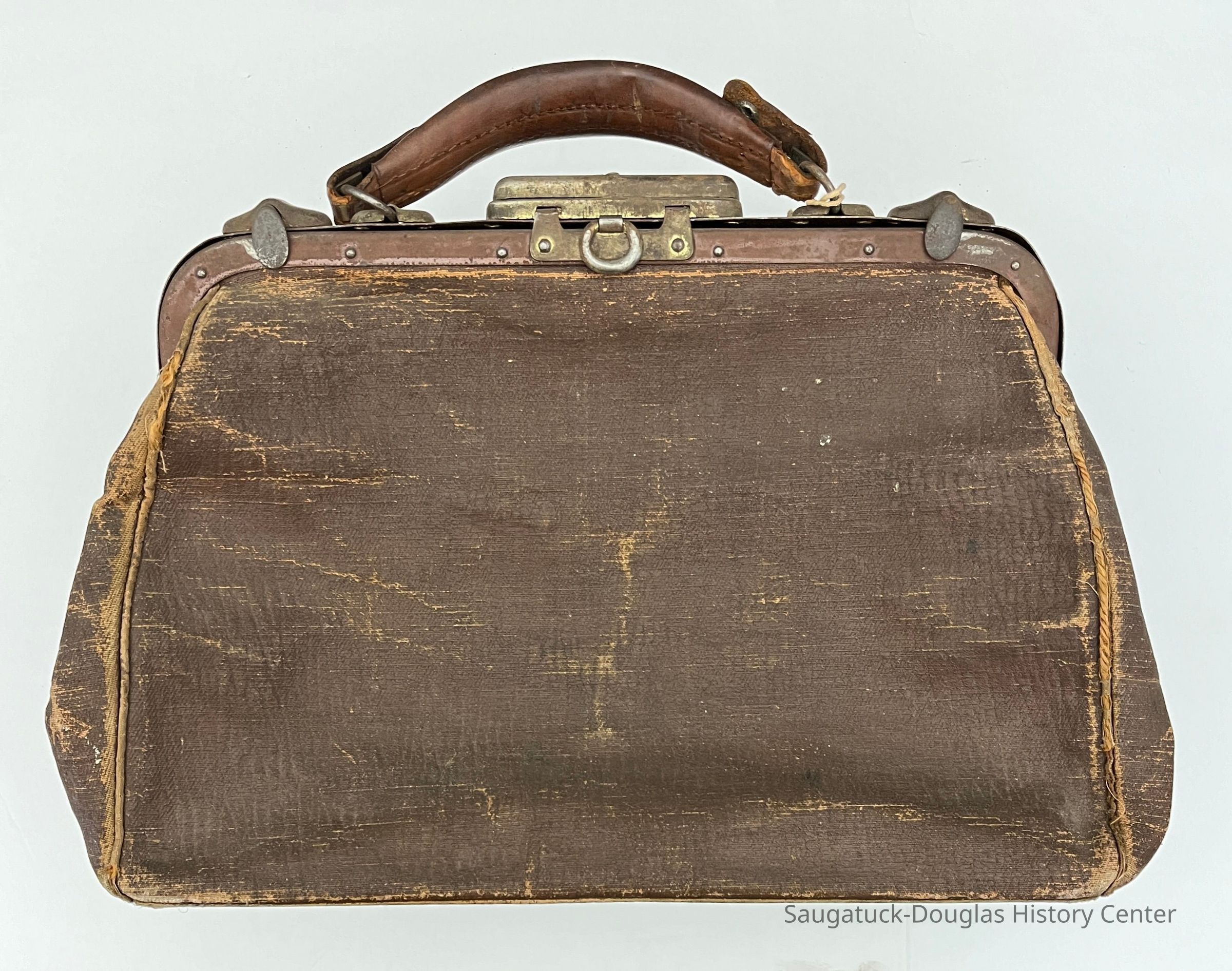 Bag A - Brown, coated-fabric bag with beige paperboard lining and metal clasp closure. The bag has a keyed, metal lock and double, swivel closures. A leather handle snaps on to two D-rings on the top of the bag. Four dome-shaped metal feet are attached to the bag's bottom. A paper tag was found inside the bag with the name "Kleinheksel, Ha???, 463943."