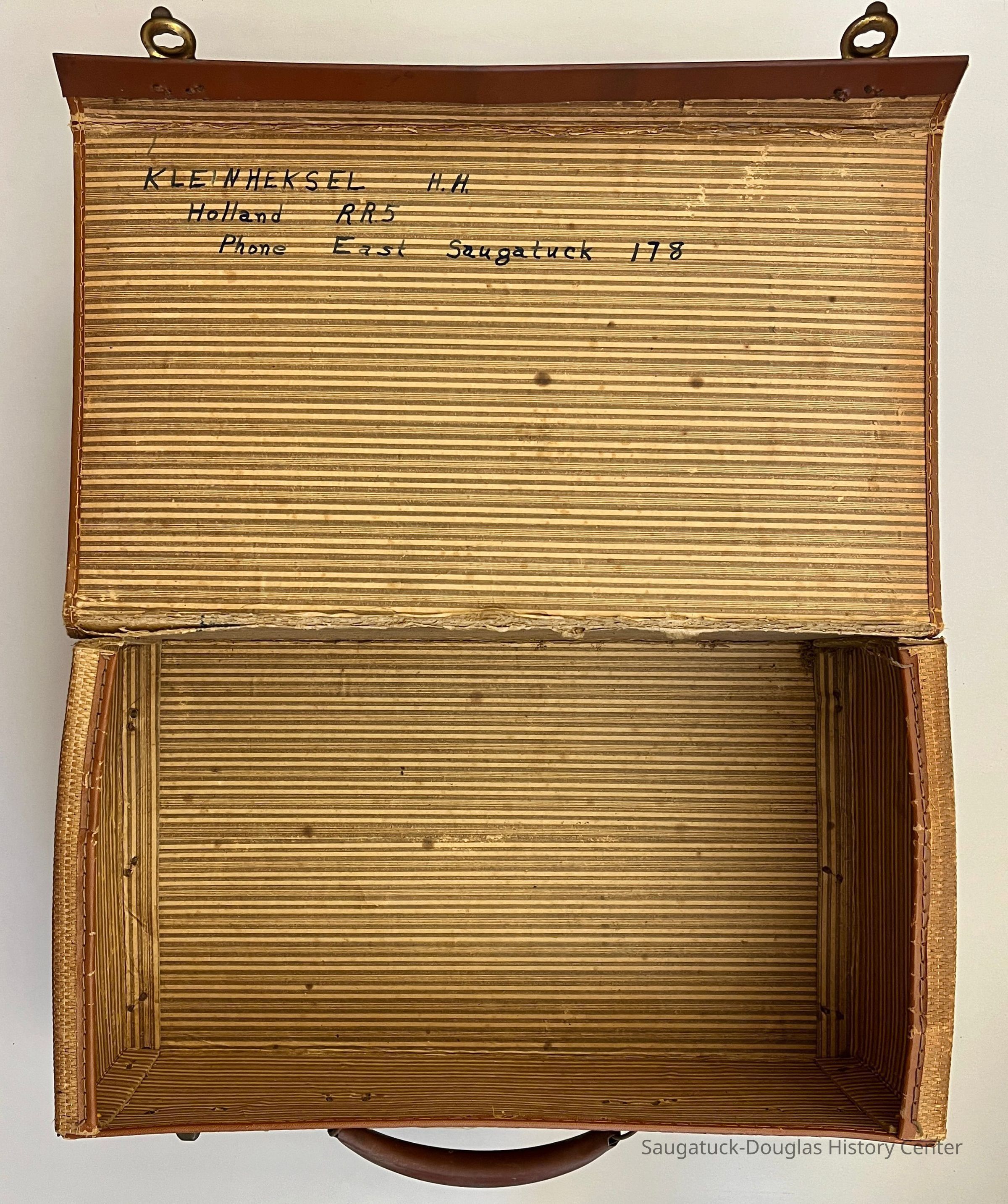 Bag B - Beige woven material valise. Two twist-lock metal closures (one is missing) and metal caring handle. The inside of the bag has brown-and-beige striped paper lining. Handwritten inside the lid is the text "Kleinheksel H.H. Holland RR5 Phone East Saugatuck 178"