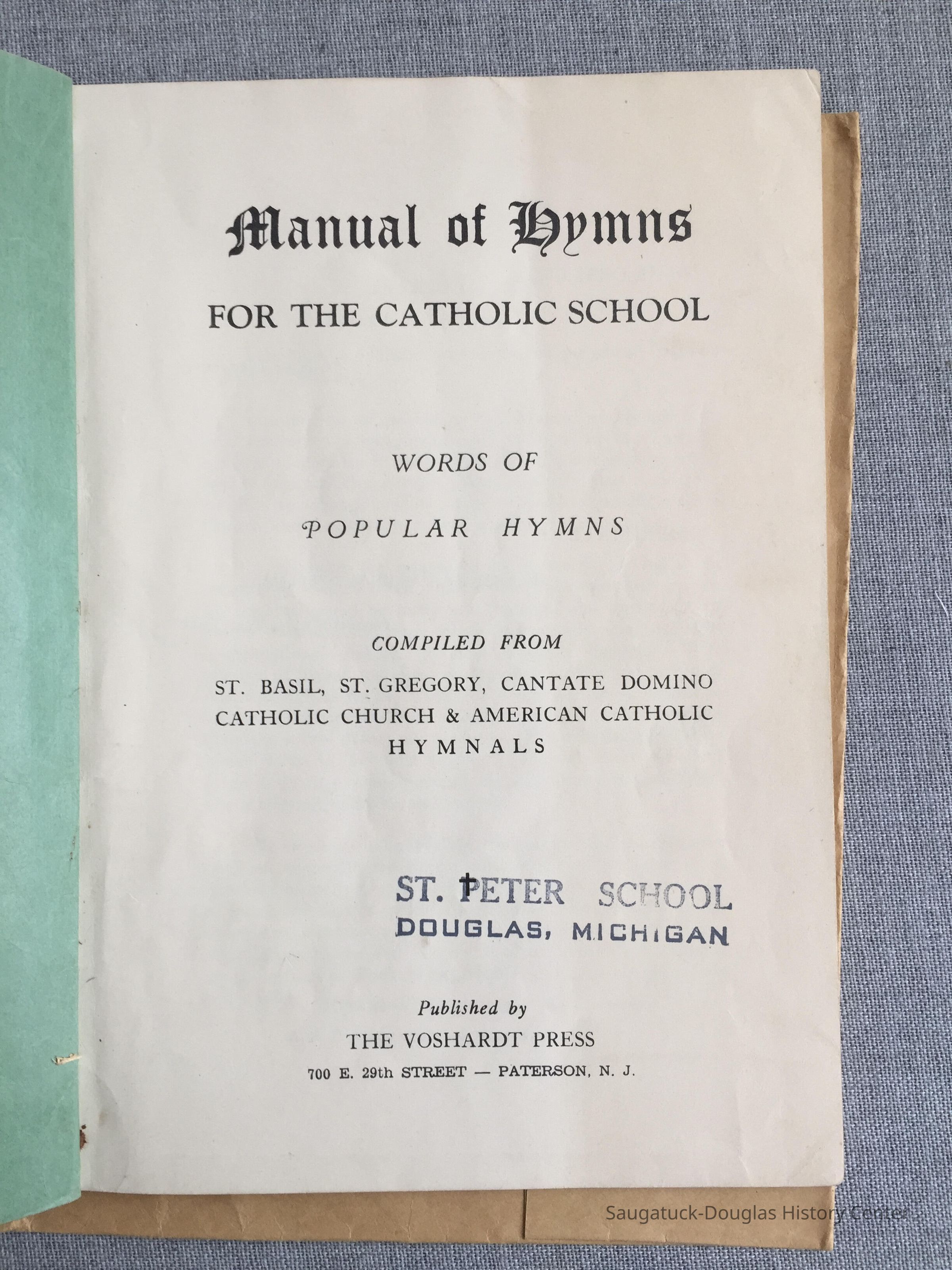 Green stapled booklet with kraft-paper protective cover, both items stamped "St. Peter School, Douglas, Michigan"Cataloged By
