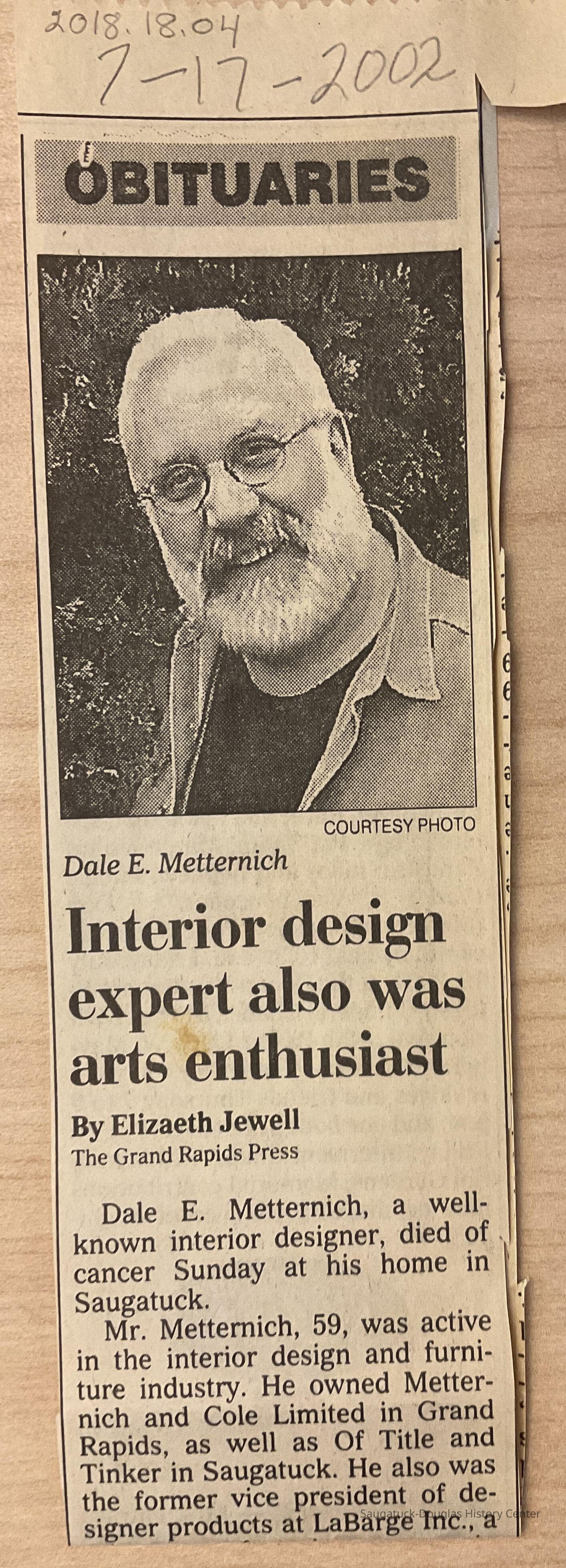 He was a well-known interior designer who owned a large home located at 994 Holland St. Saugatuck. He was on the board of Ox-Bow as well as on the Historic District Commission of Saugatuck.Cataloged By