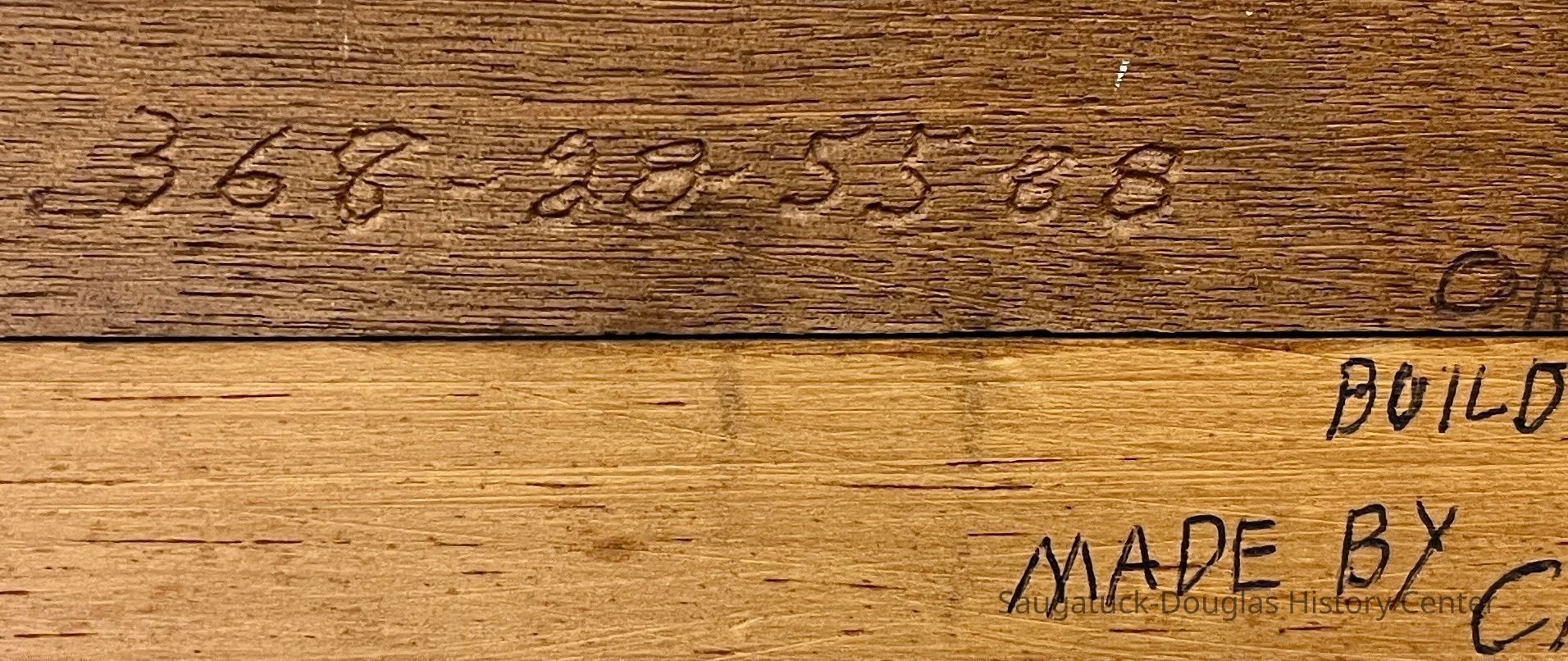 Wooden half-hull ship model for a tug [towboat] named "John Gordon." The model is constructed of slabs of wood. The front is polished to a smooth finish. The back of the model, which includes metal wall hangers, is unfinished and includes notations about the boat and builder.Context