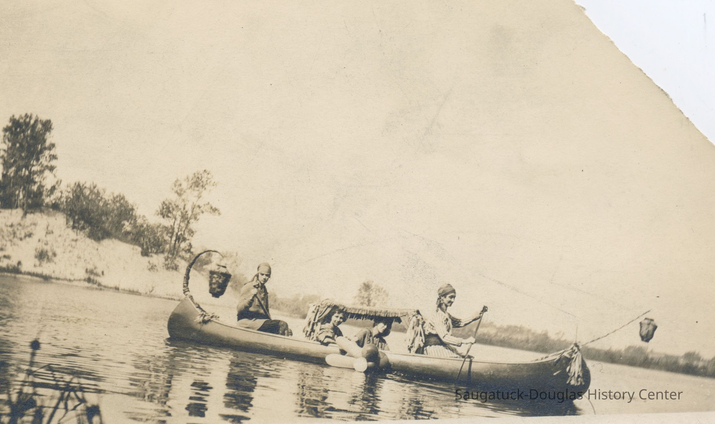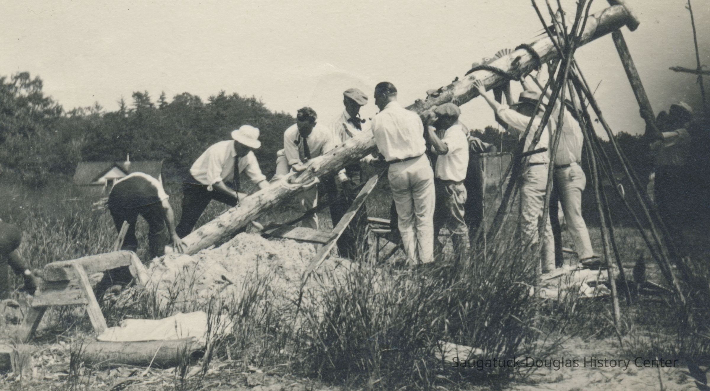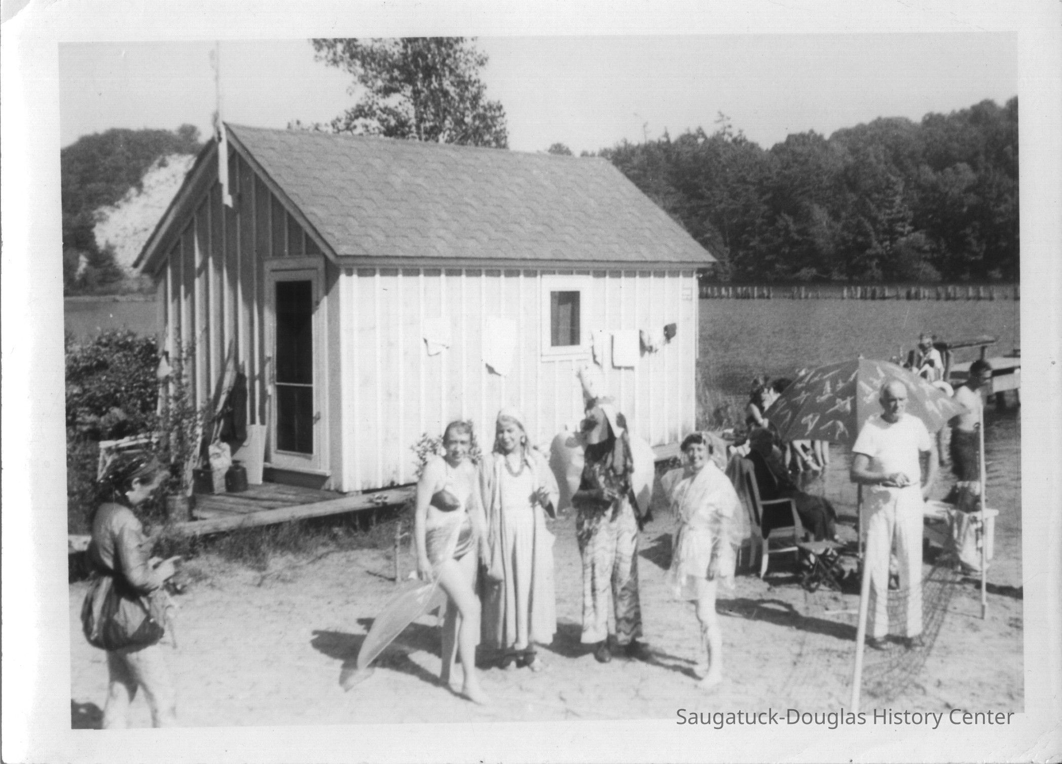 Digital images of pageants, costumed performances and parties at Ox-Bow including Venetian lighted boat parades, Hiawatha pageant, and raising a faux totem pole.
