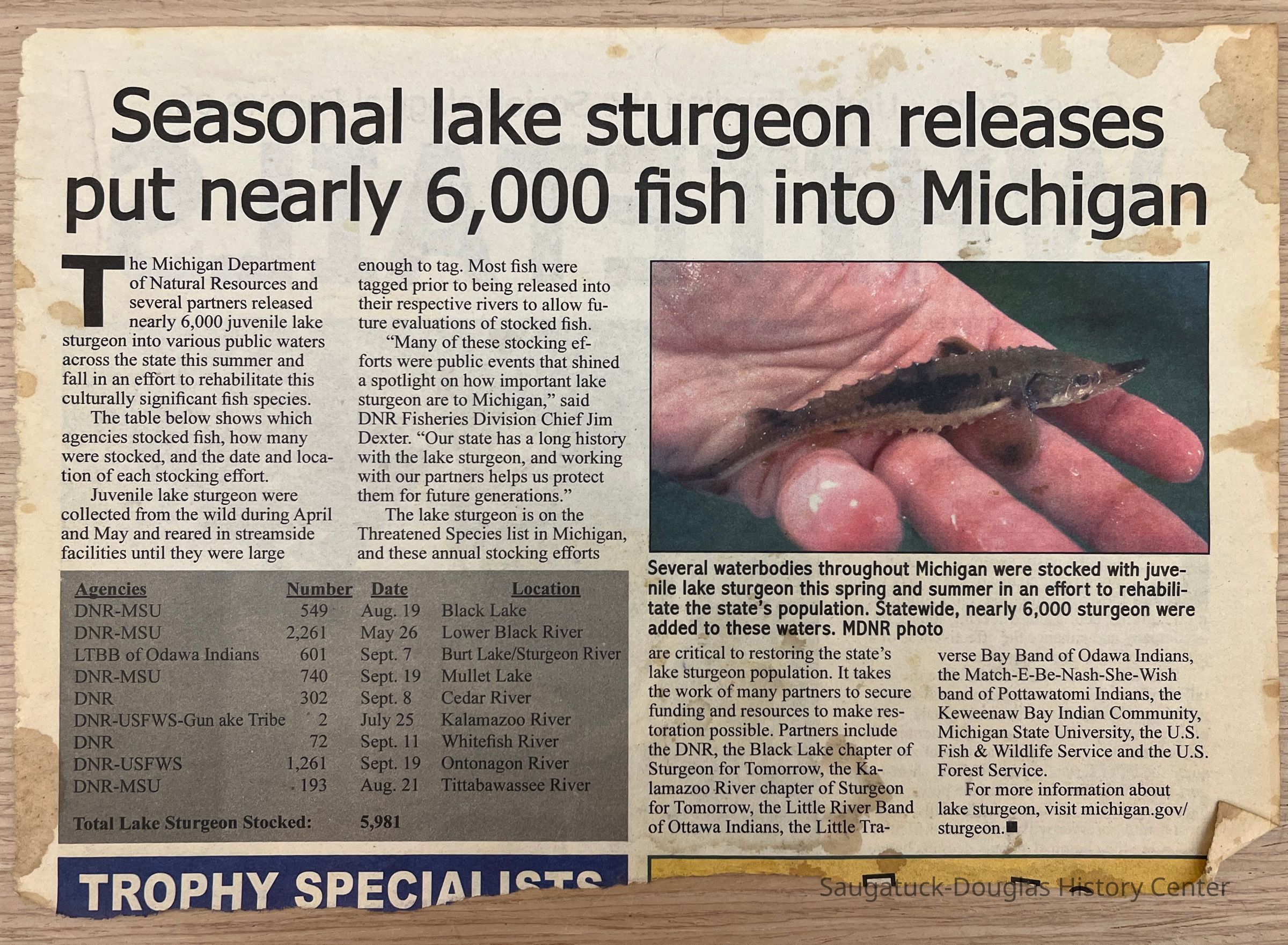 Newspaper clipping of an article with the headline "Seasonal lake sturgeon releases put nearly 6,000 fish into Michigan" Publication unknown but a Oct. 4, 2017 DNR press release has the same text: https://content.govdelivery.com/accounts/MIDNR/bulletins/1bab9c9