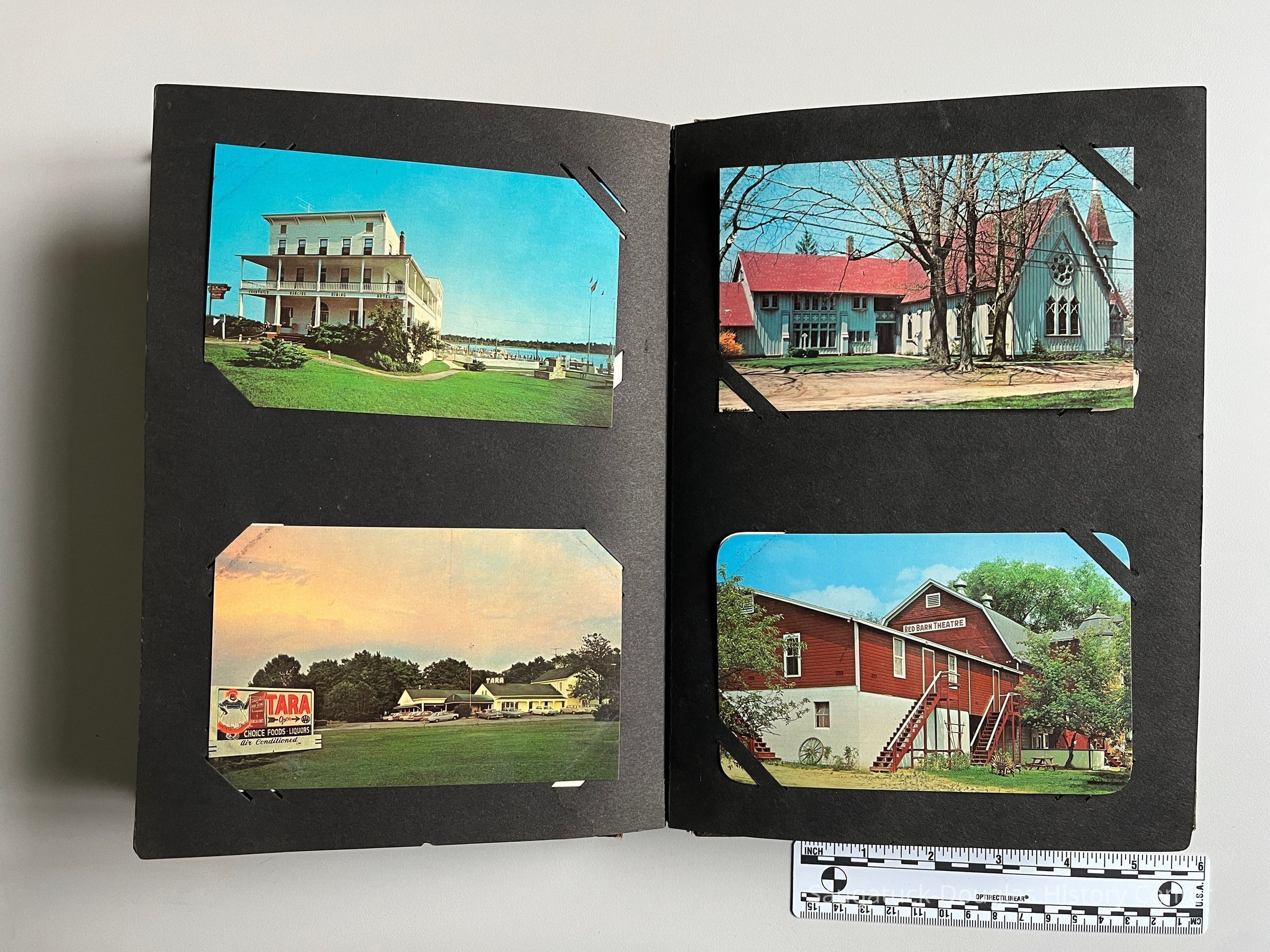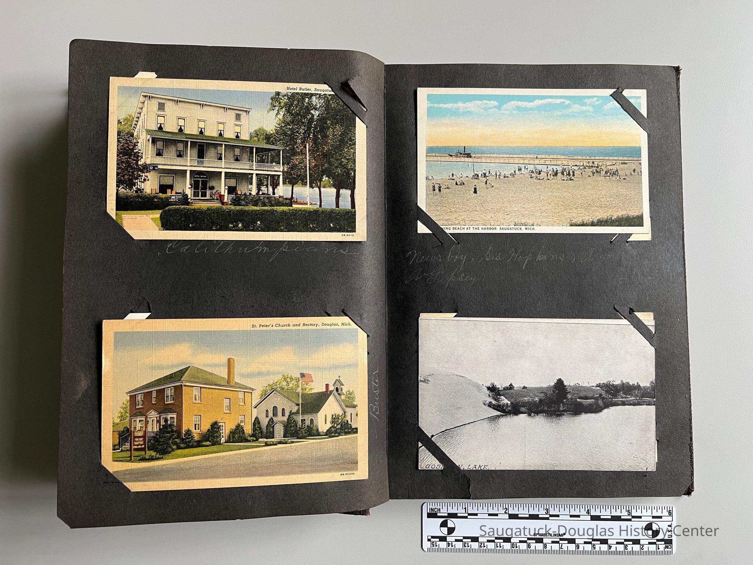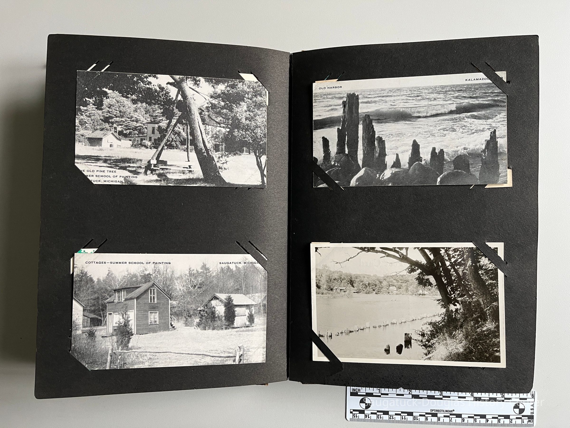 Dark brown photo album with the word "Souvenirs" imprinted on the textured cover. The album was repurposed to house a collection of Saugatuck-area picture postcards but penciled photo captions from the previous occupants remain on the black paper pages.Subject Person/Organization