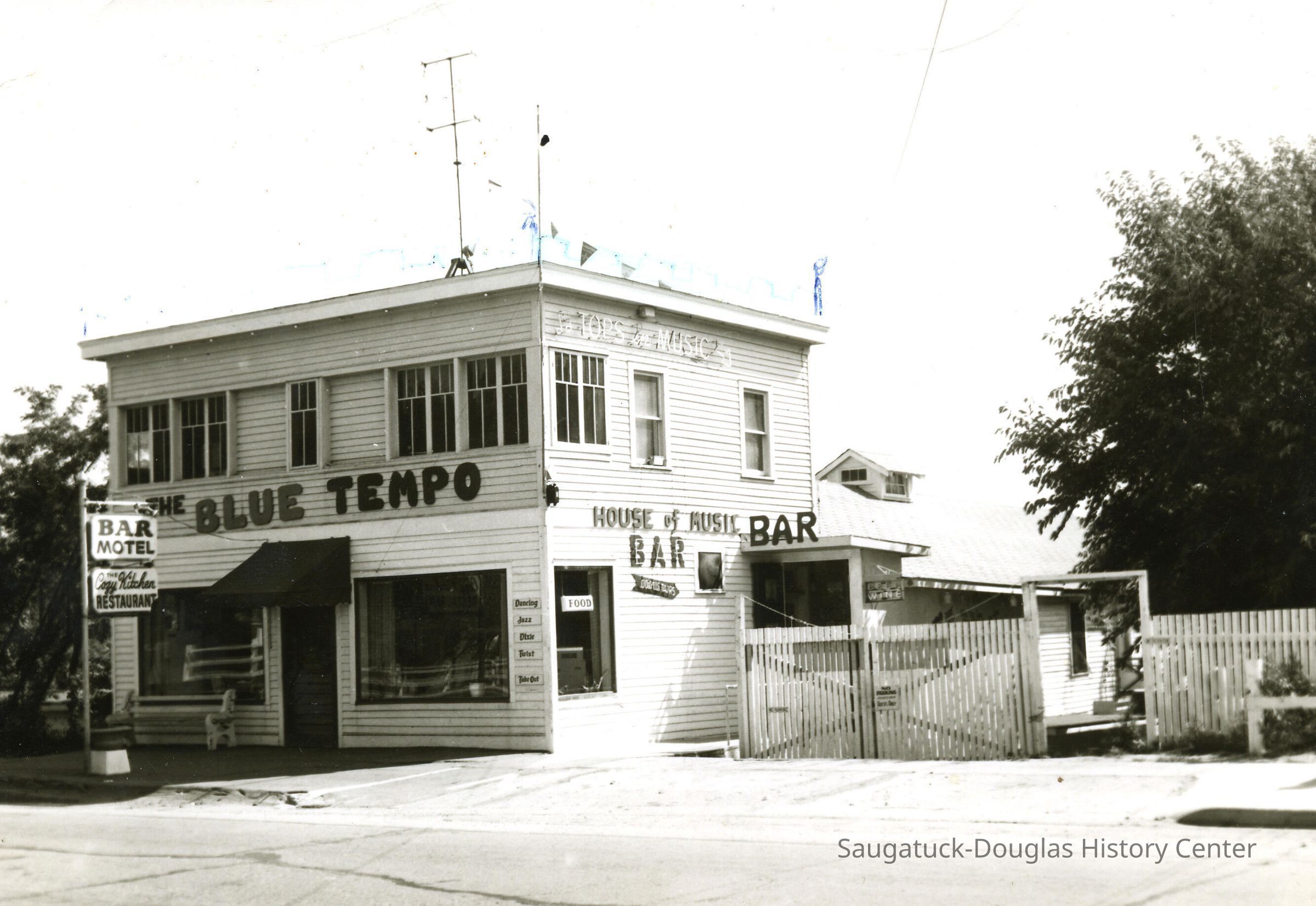The Blue Tempo Bar & Motel Culver Street, Saugatuck (now the site of condos). Operated from about 1960 – 1976 when it was destroyed by fire. This is one of the most asked about “lost” buildings in Saugatuck. Here are some clues why. It advertised itself as “Tops in Music,” and was a very popular (apparently a bit on the wild side) gay and straight venue in the 1960—being probably the first “gay bar” in West Michigan. Ask around. It began as an icehouse and had a number of cabins overlooking the Kalamazoo Lake in the rear. Ed and Marie Demeter were early owners –but best known was, Donald “Toad” Davis who took over in 1960. It is remembered as cramped, noisy and crowded—and at times even wet when the lake overflowed into the bar room and dance floor. At the time this photo was taken the front portion housed the “Cozy Kitchen” restaurant.Collection