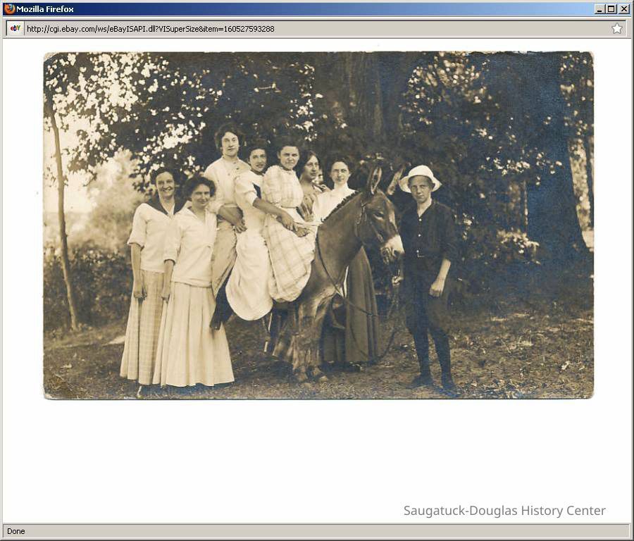 Area visitors posed with Saugatuck's favorite photo prop: Dynamite the Donkey. The photos were taken at the beach, likely the beach just north of Oval Beach, on Water Street and on or near the Chain Ferry and landing.