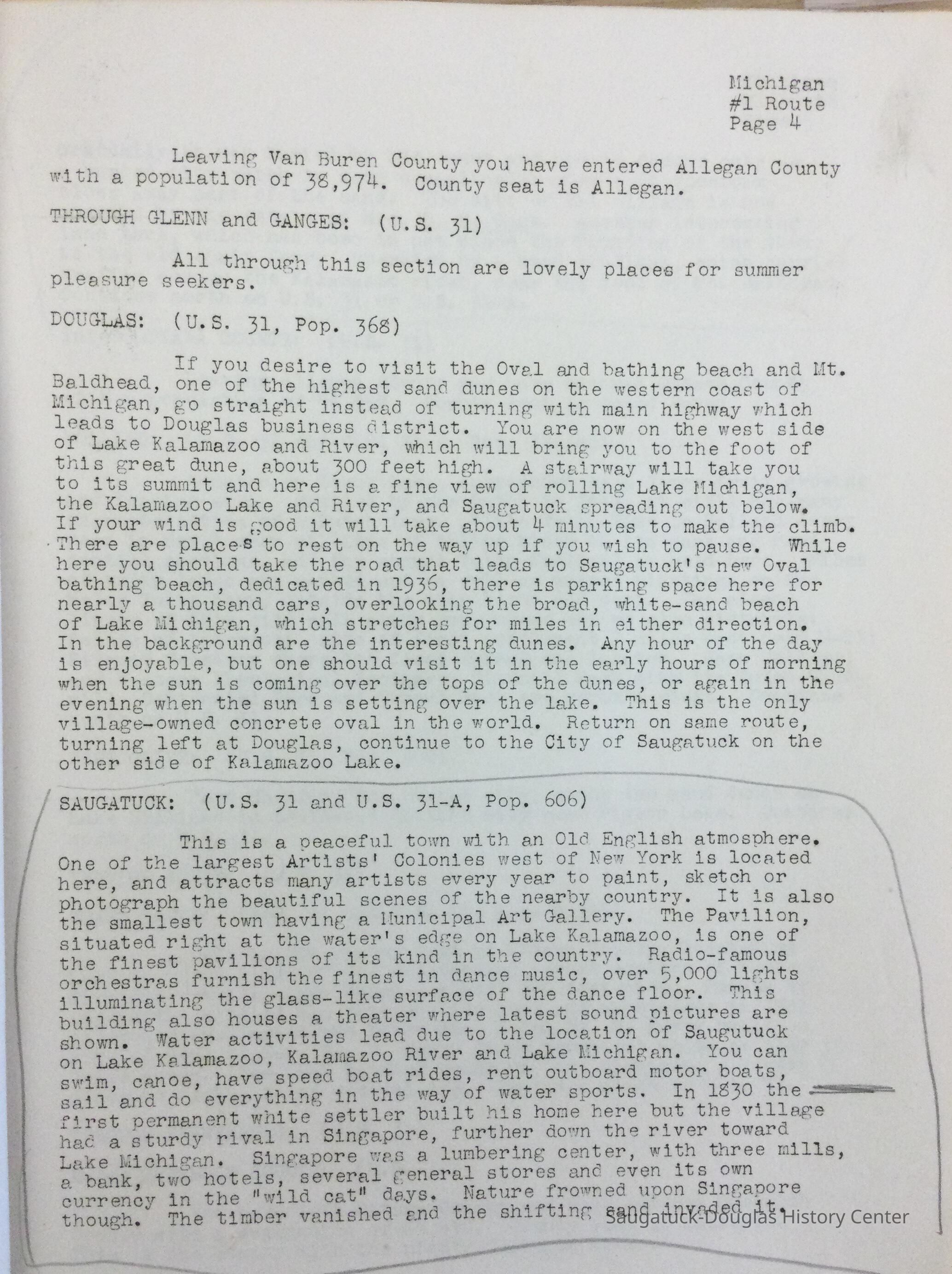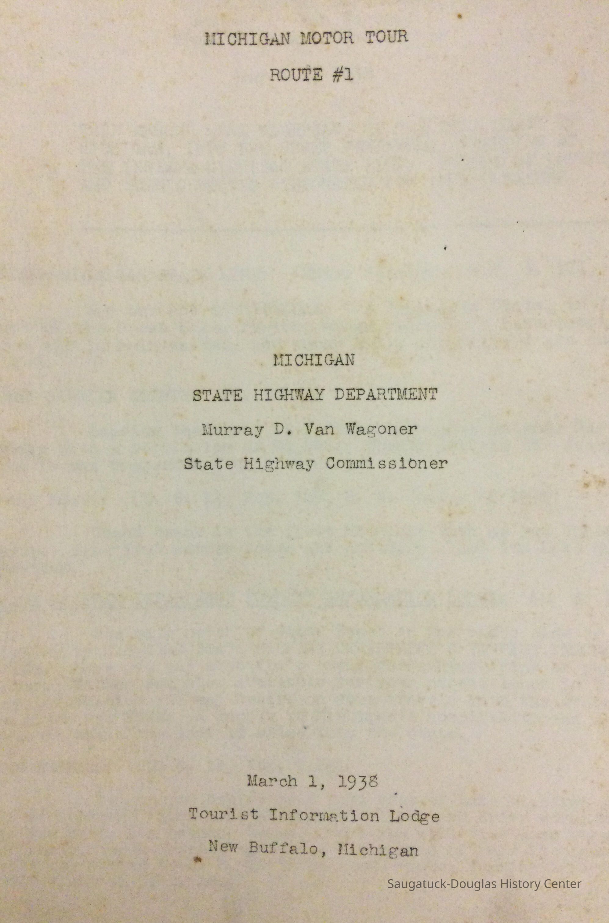 A 36 page itinerary that was available at the Tourist Information Lodge in New Buffalo (near the southern border of Michigan) as a guide along Michigan Route 1 which ran along Lake Michigan.Location