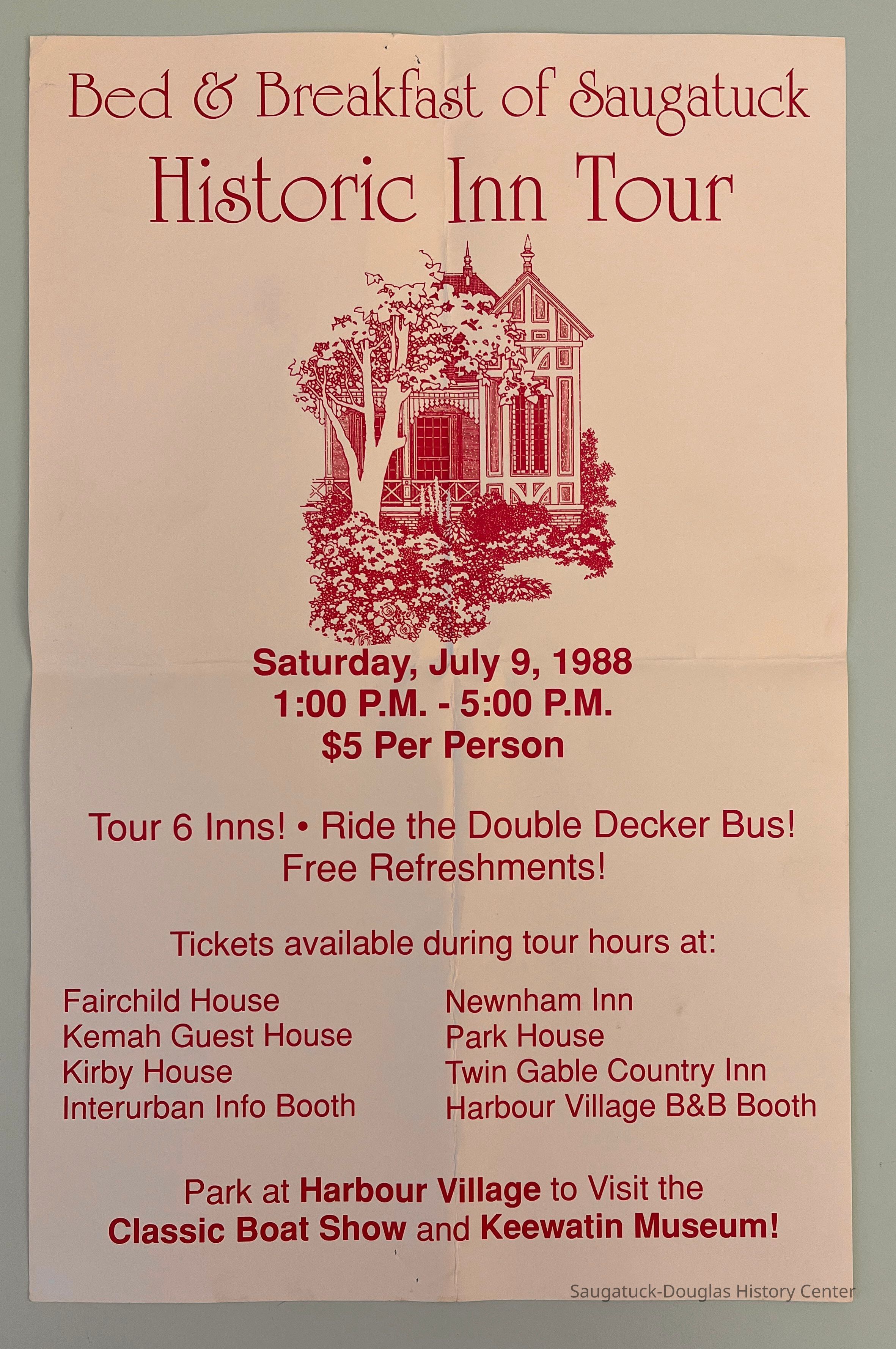 Poster advertising the Bed and Breakfast of Saugatuck Historic Inn Tour, Saturday July 9, 1988 1-5 p.m. $5 per person. Tour 6 Inns! Ride the double Decker Bus! Free Refreshments!