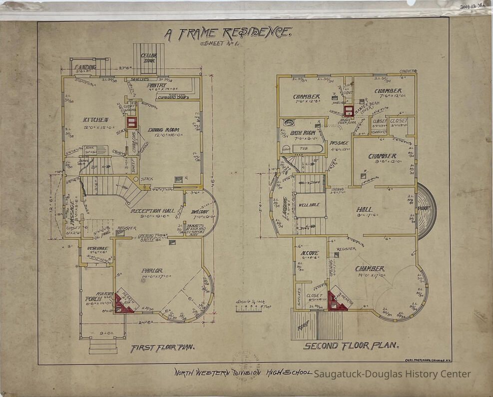 This architectural drawing, possibly done while Carl Hoerman was in high school, shows the layout for the first and second floor of a house. Each of the rooms contain labels and measurements throughout.Collection