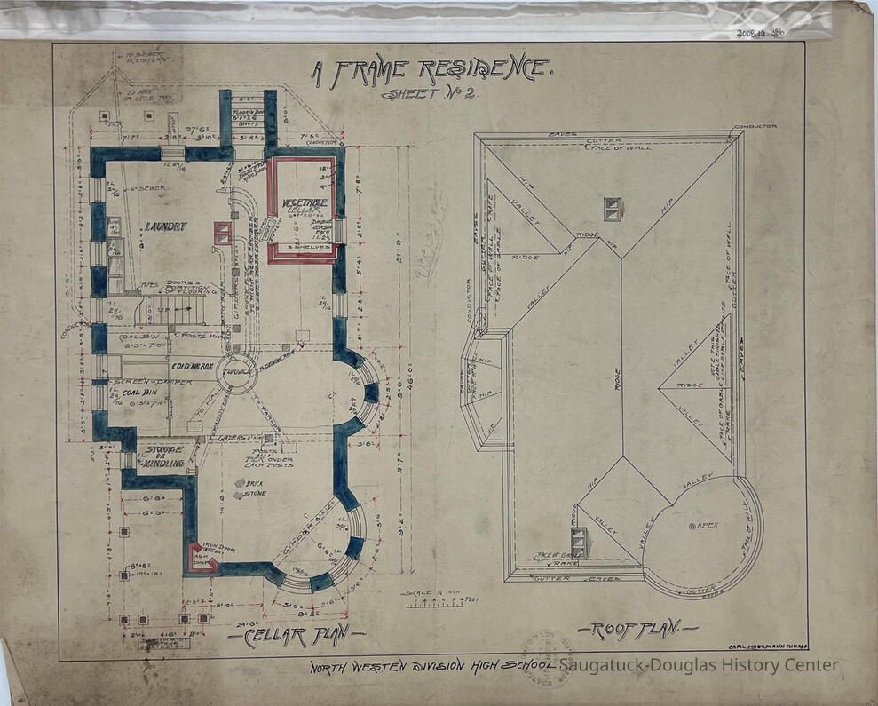 This architectural drawing, probably done while Carl Hoerman was in high school, shows the cellar and roof plans for a house. The basement plan features room names and measurements.Collection
