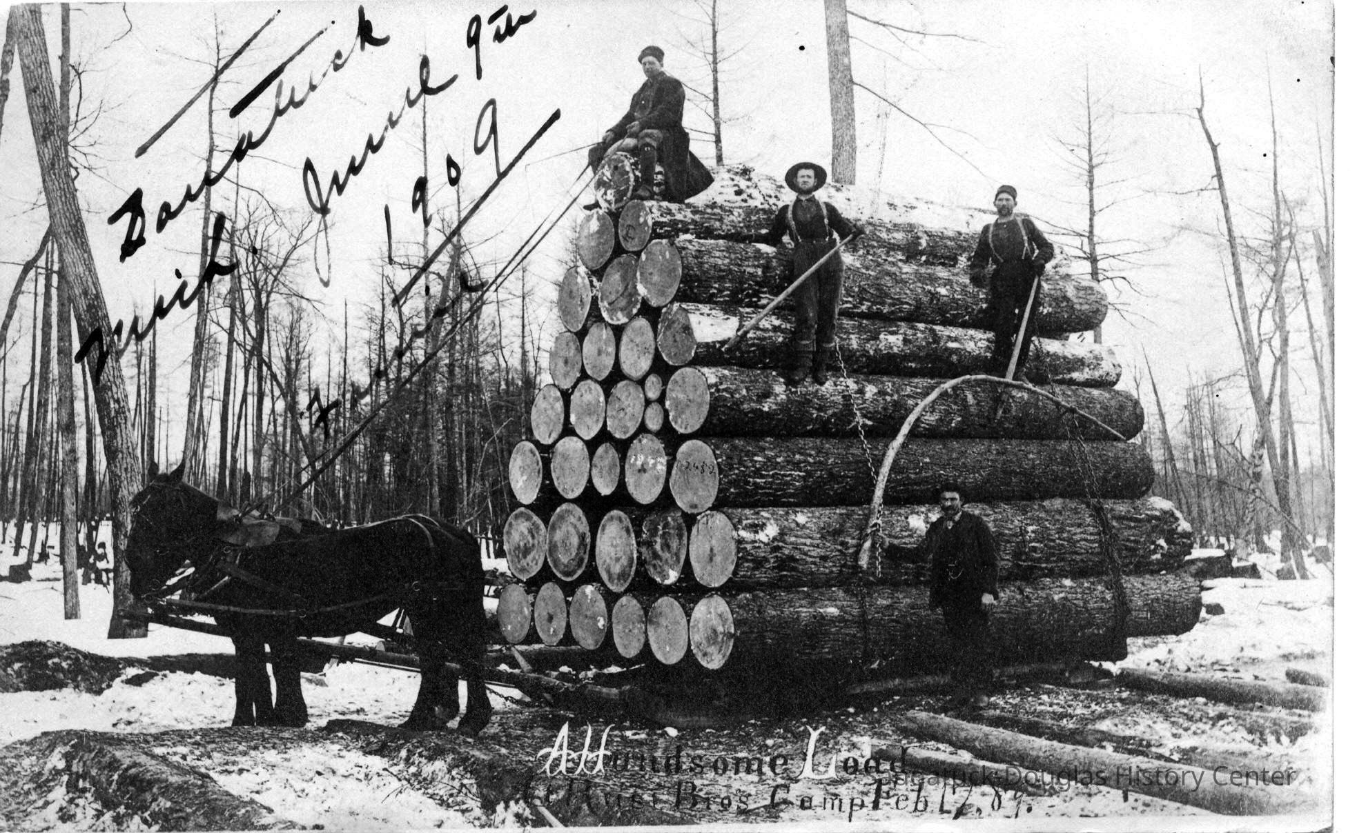 Writing on the upper left corner of the image reads "Saugatuck Mich J?? 9th 1909, F??? [Fennville?]" Text along the bottom reads "A Handsome Load ?? Bros. Camp. Feb. 17, '89."Photograph Details